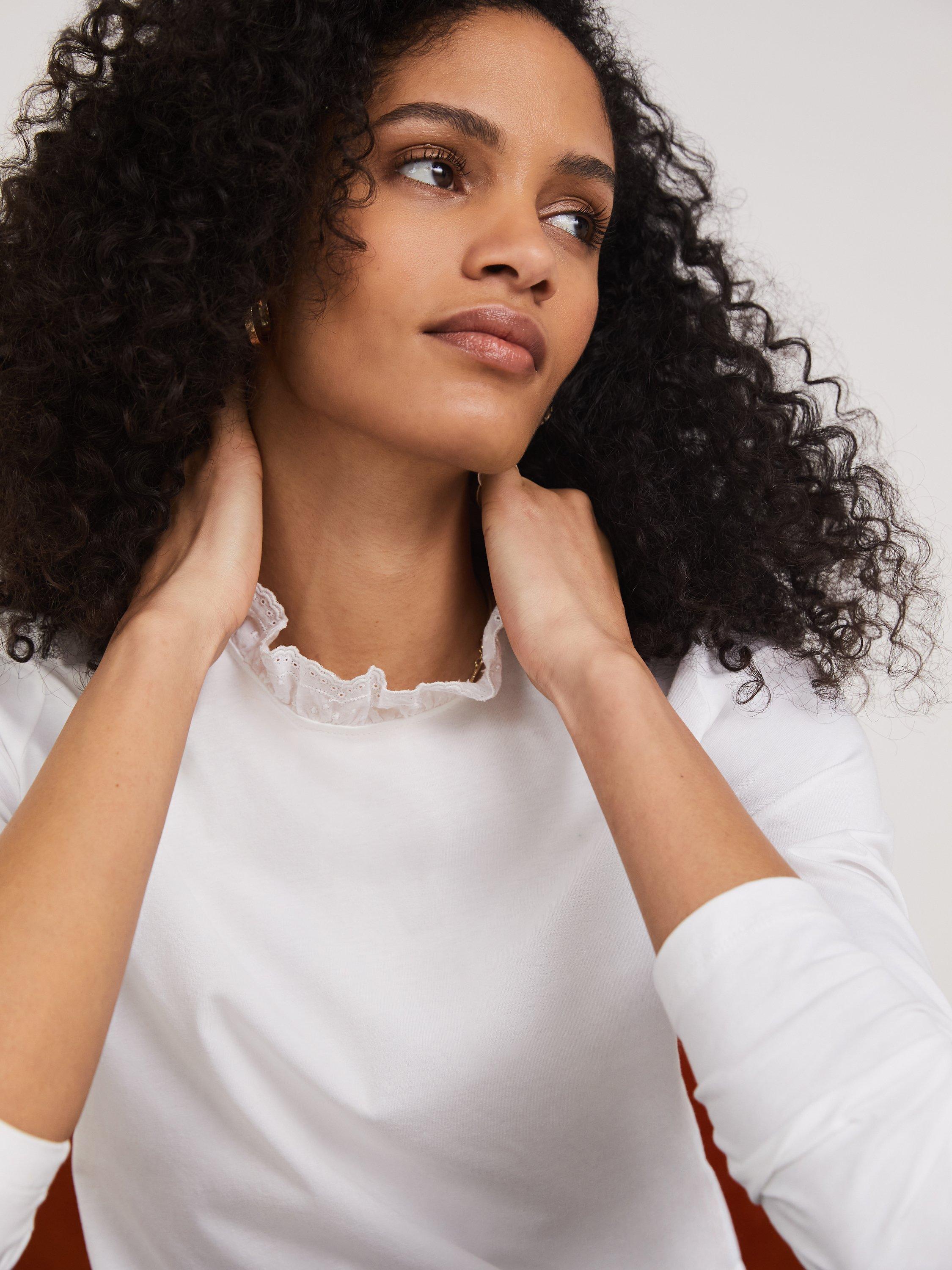 Combining the ruffled collar with the simplicity of a plain jersey top, Baukjen brings you the Agatha. It's designed to be worn solo or layered under crew neck jumpers for that nod to all things feminine.