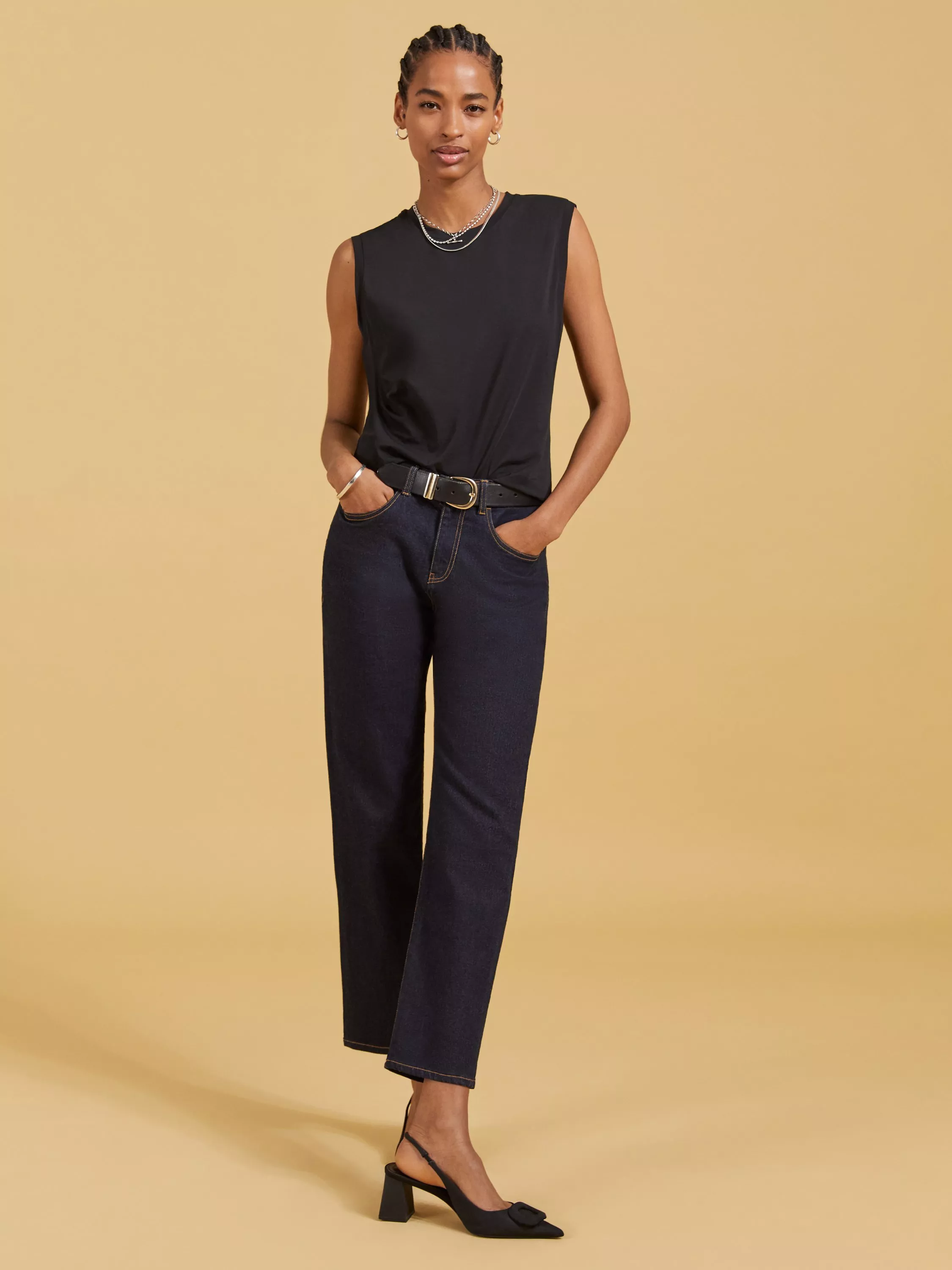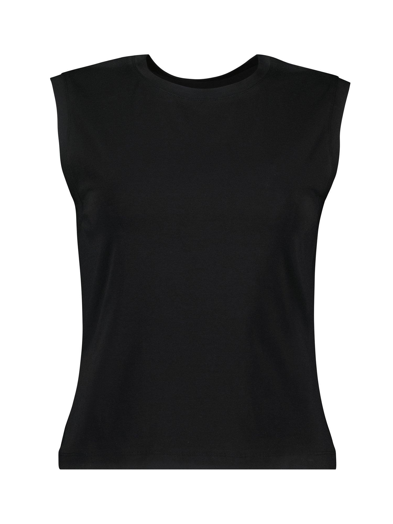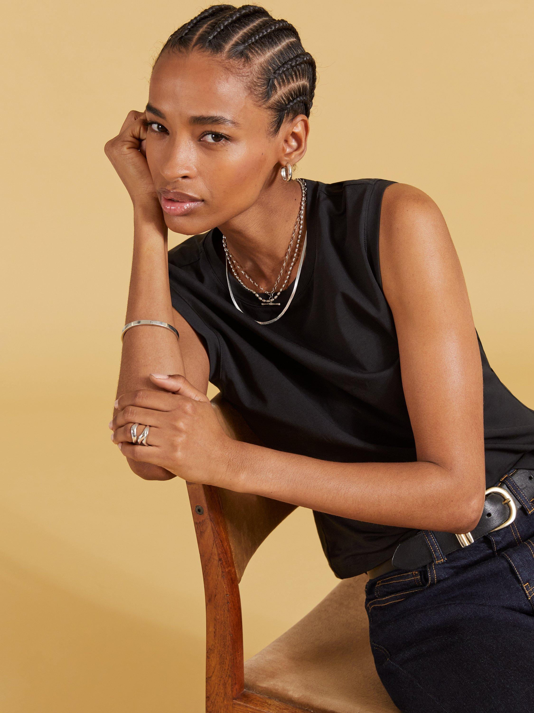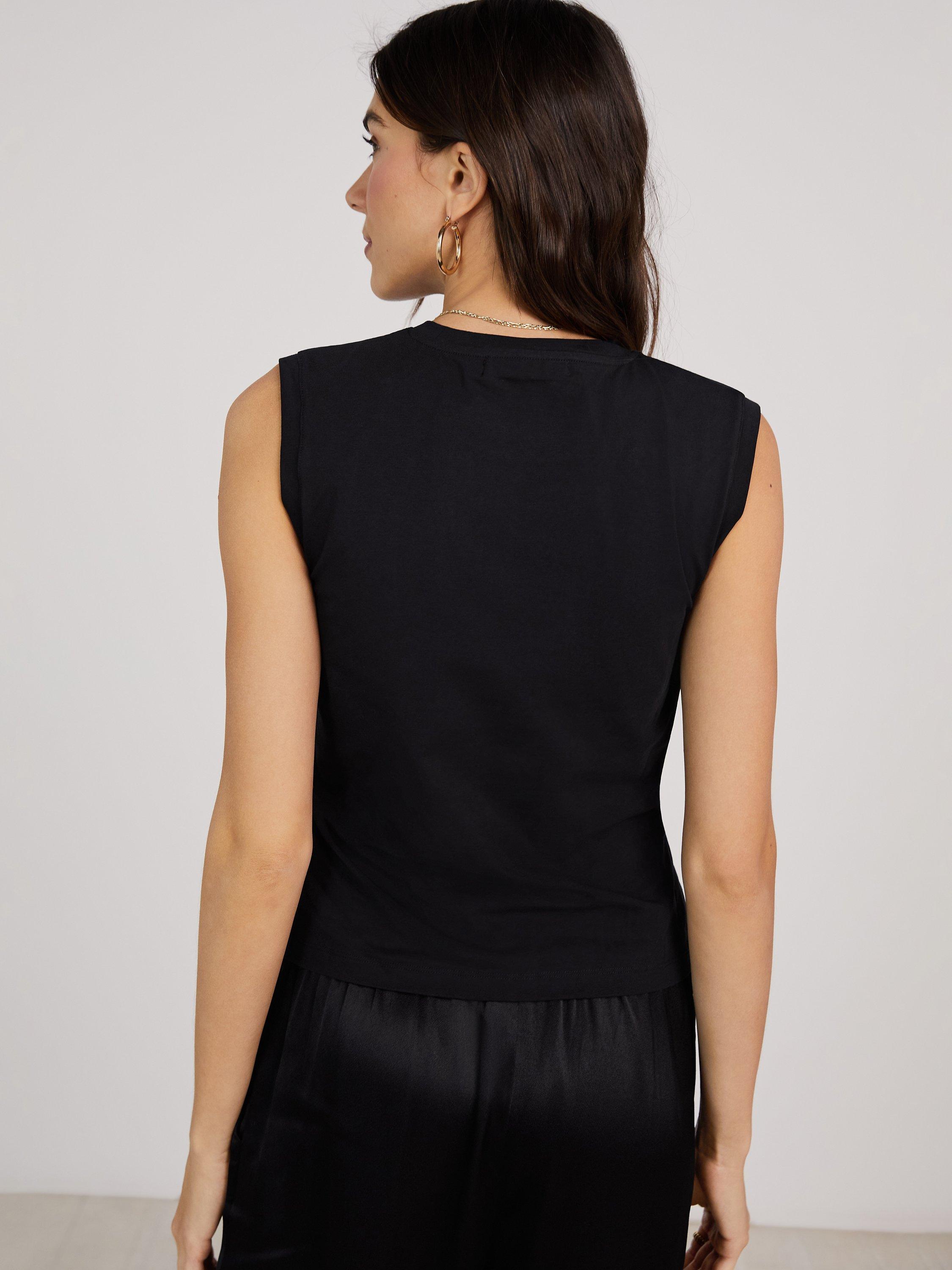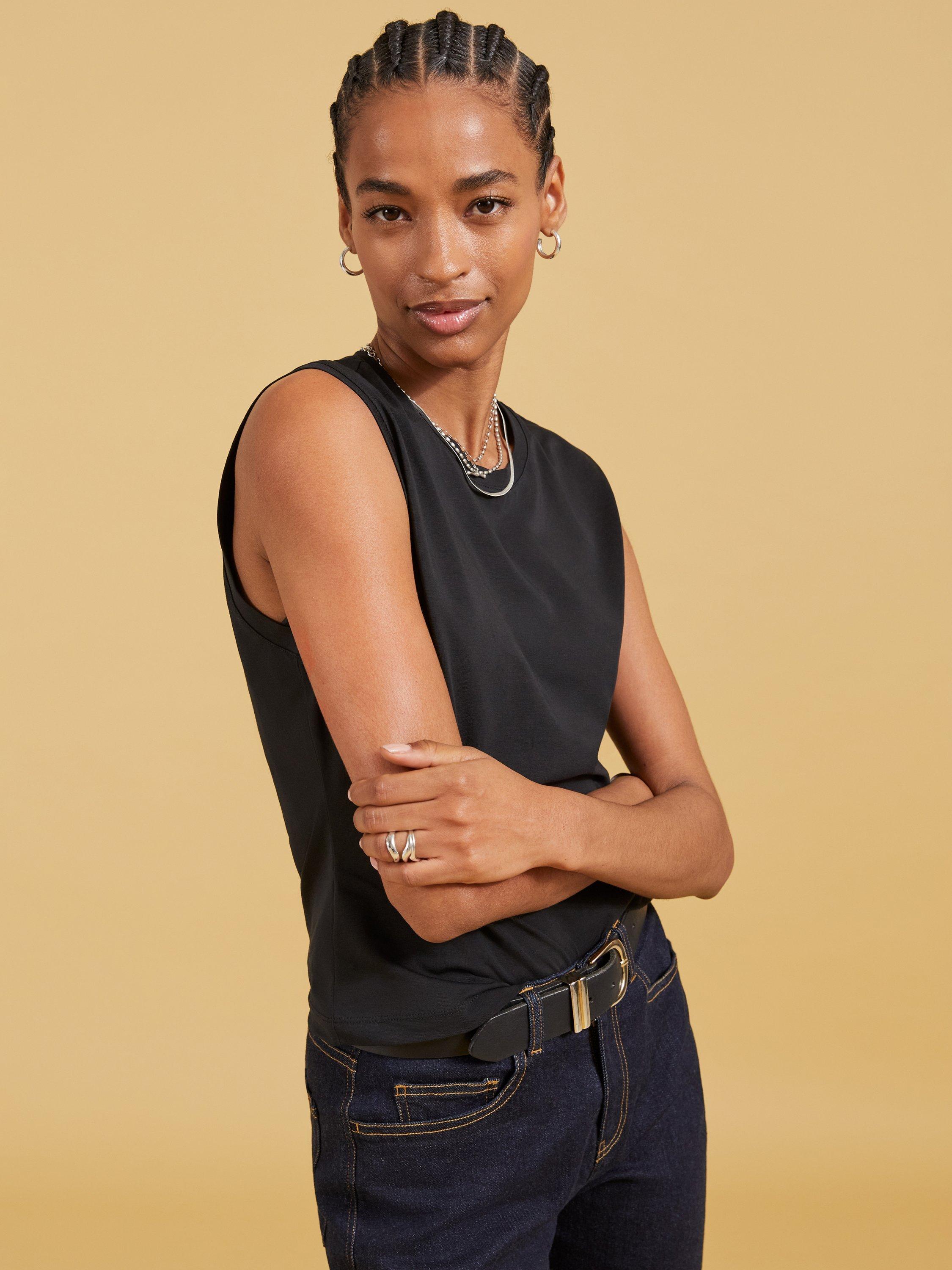 Cut with a round neckline and a sleeveless design, it offers a soft feel thanks to its cotton blend and is ideal for relaxed daytime wear.