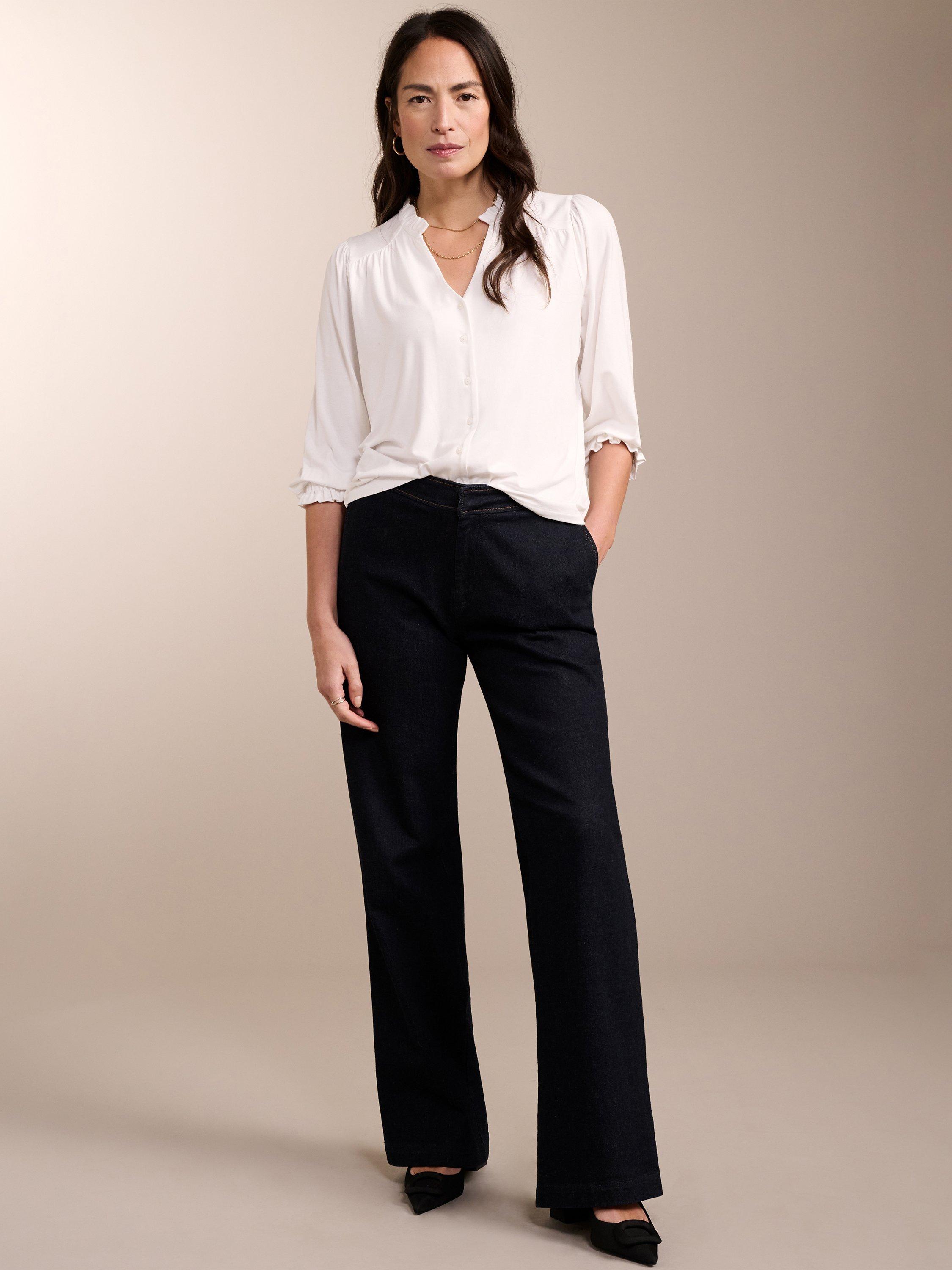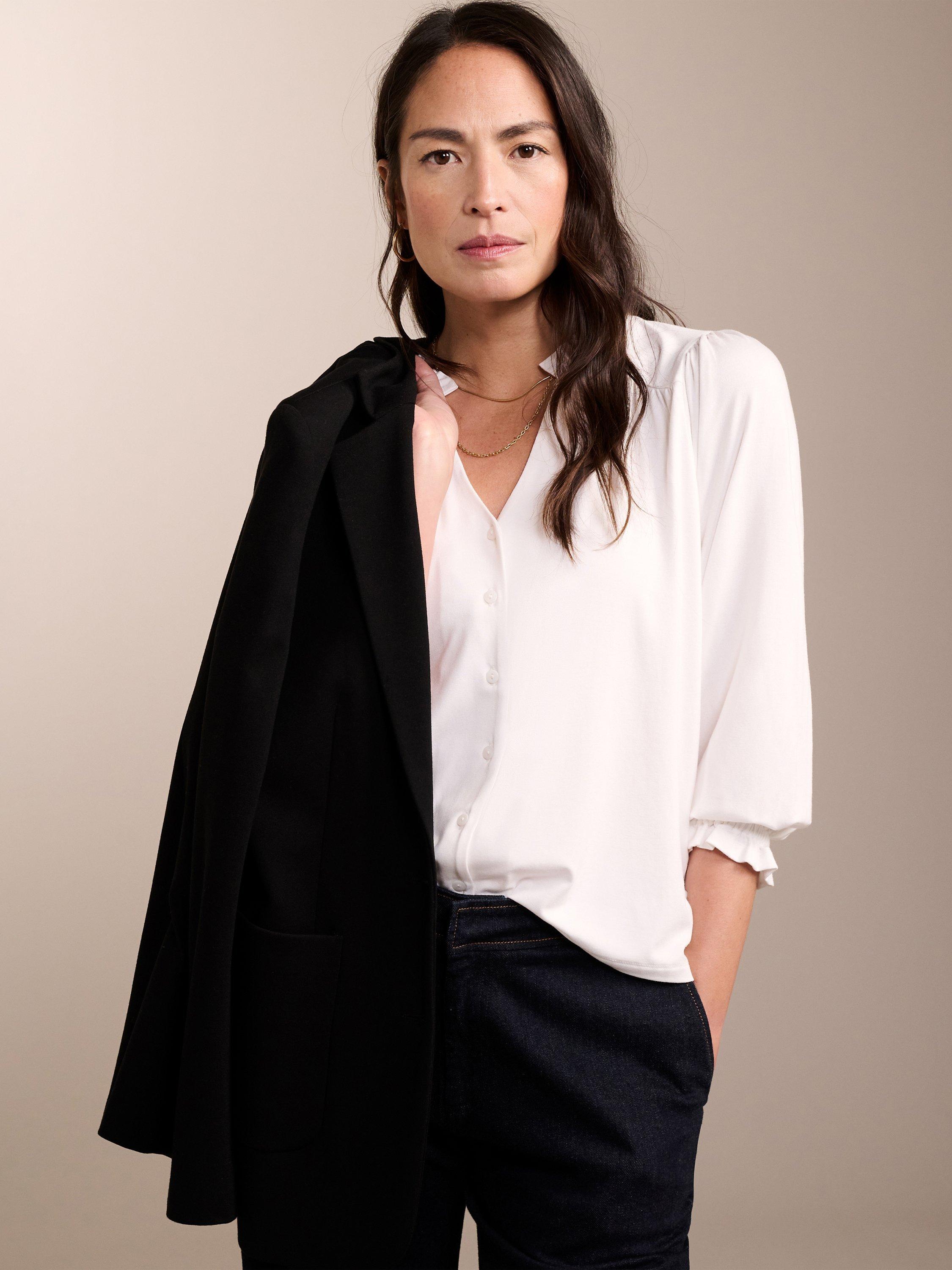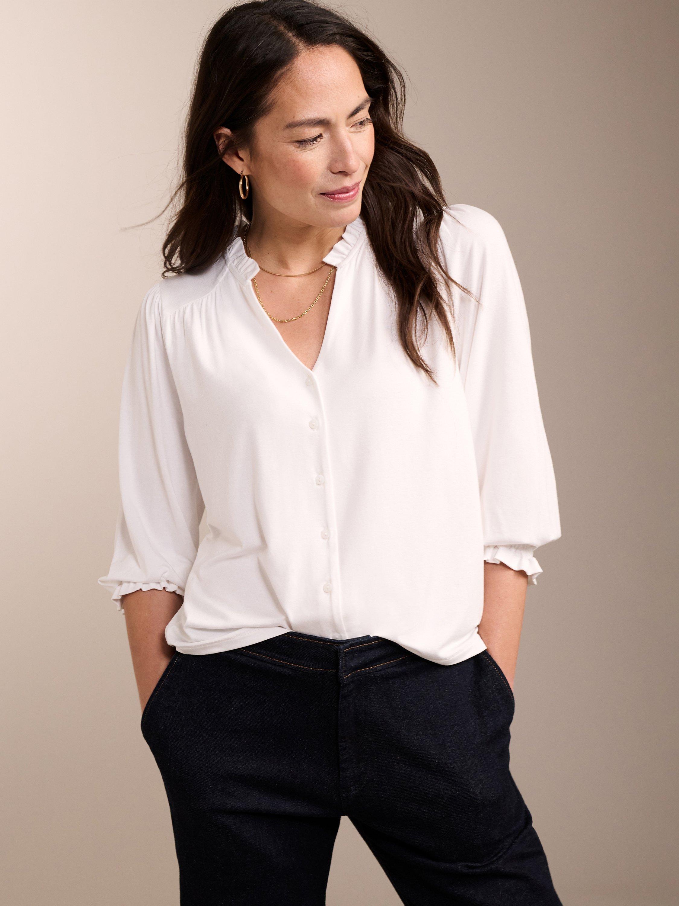 Easy, pretty and impactful, Annie will see you through dinners, weekend brunch dates and meetings in style. Crafted in jersey for all-day comfort, this blouse features a pretty ruffled collar and 3/4 length sleeves with elasticated cuffs. Relaxed on the body, it's an effortless style to update your favourite trousers and jeans.