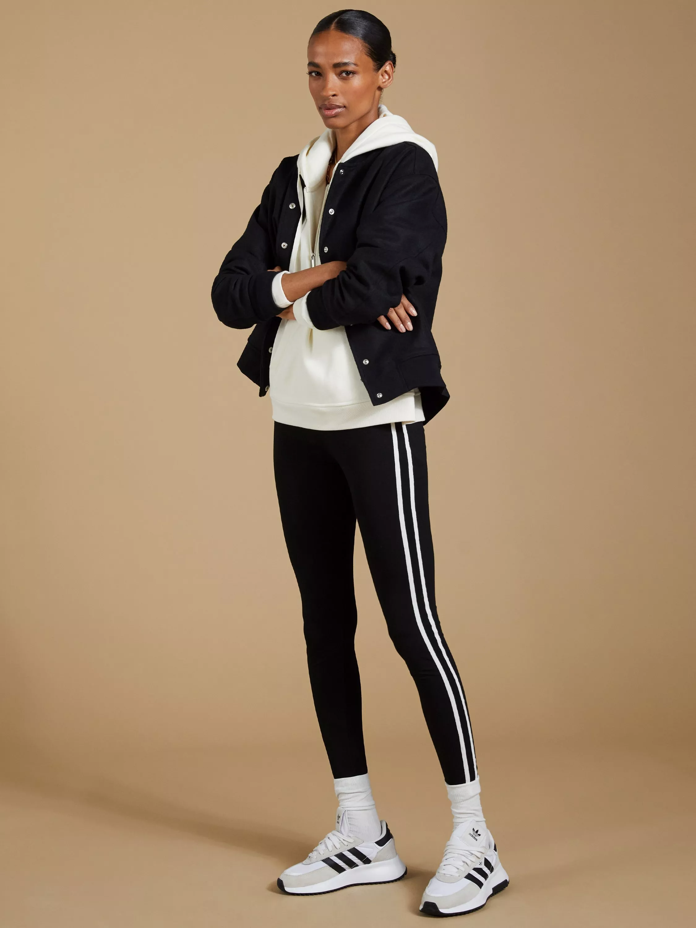 Upgrade your leggings to Baxter. This easy style features a pair of knitted contrast stripes down each leg for a graphic twist. Made from jersey, they boast more stretch than traditional cotton counterparts and come with a wide waistband for optimum comfort. Wear them off-duty with a denim jacket and sneakers.