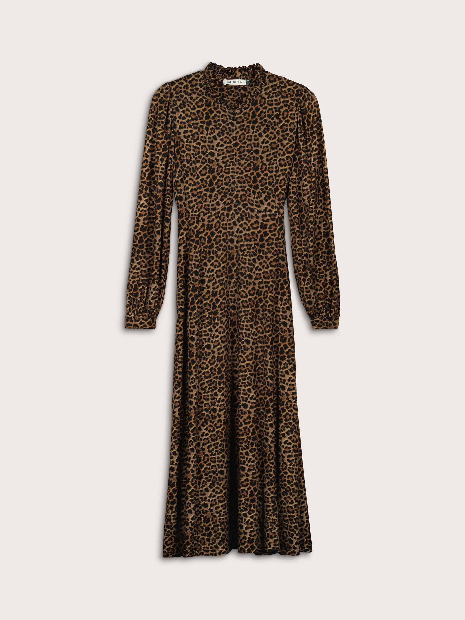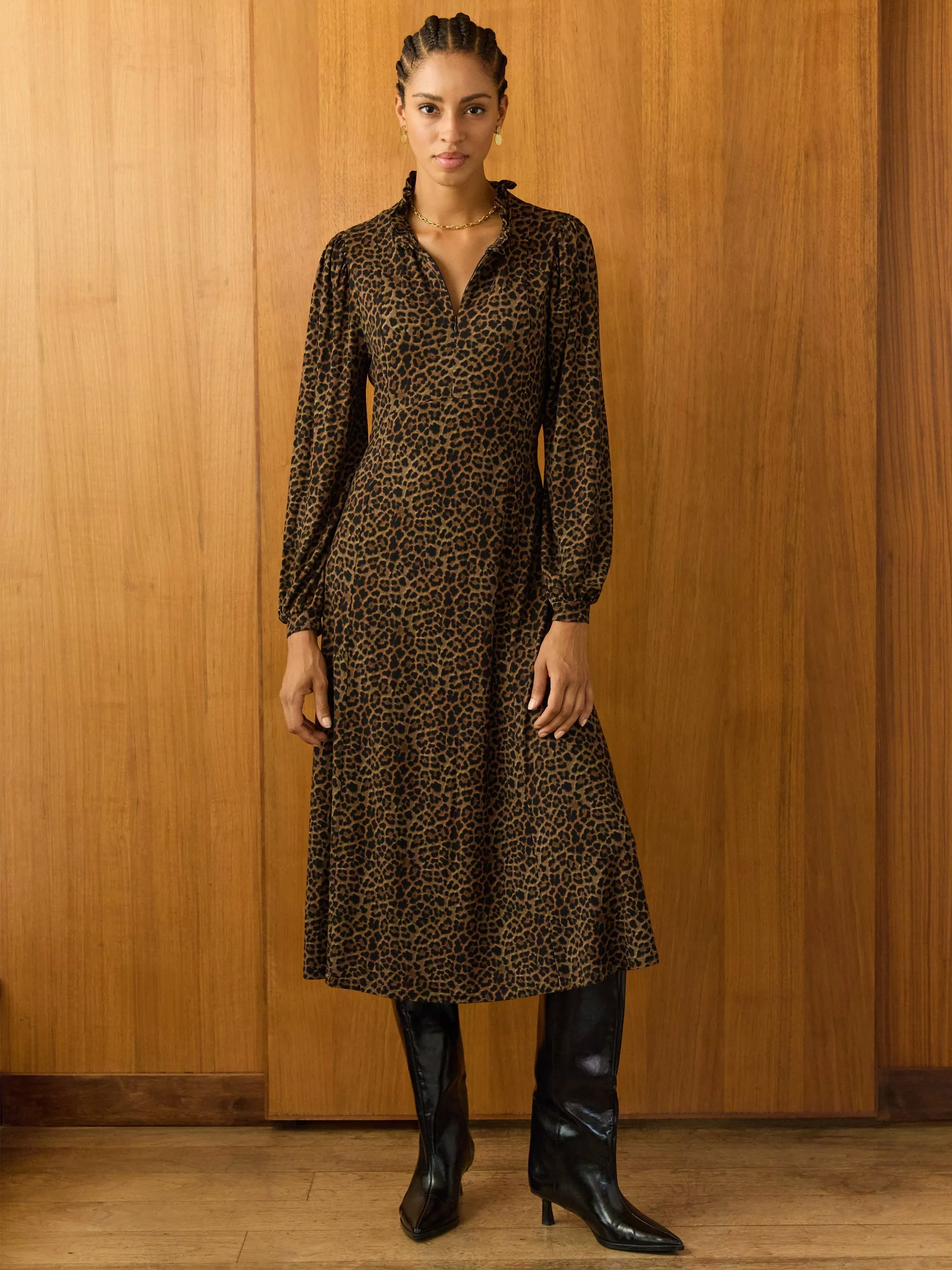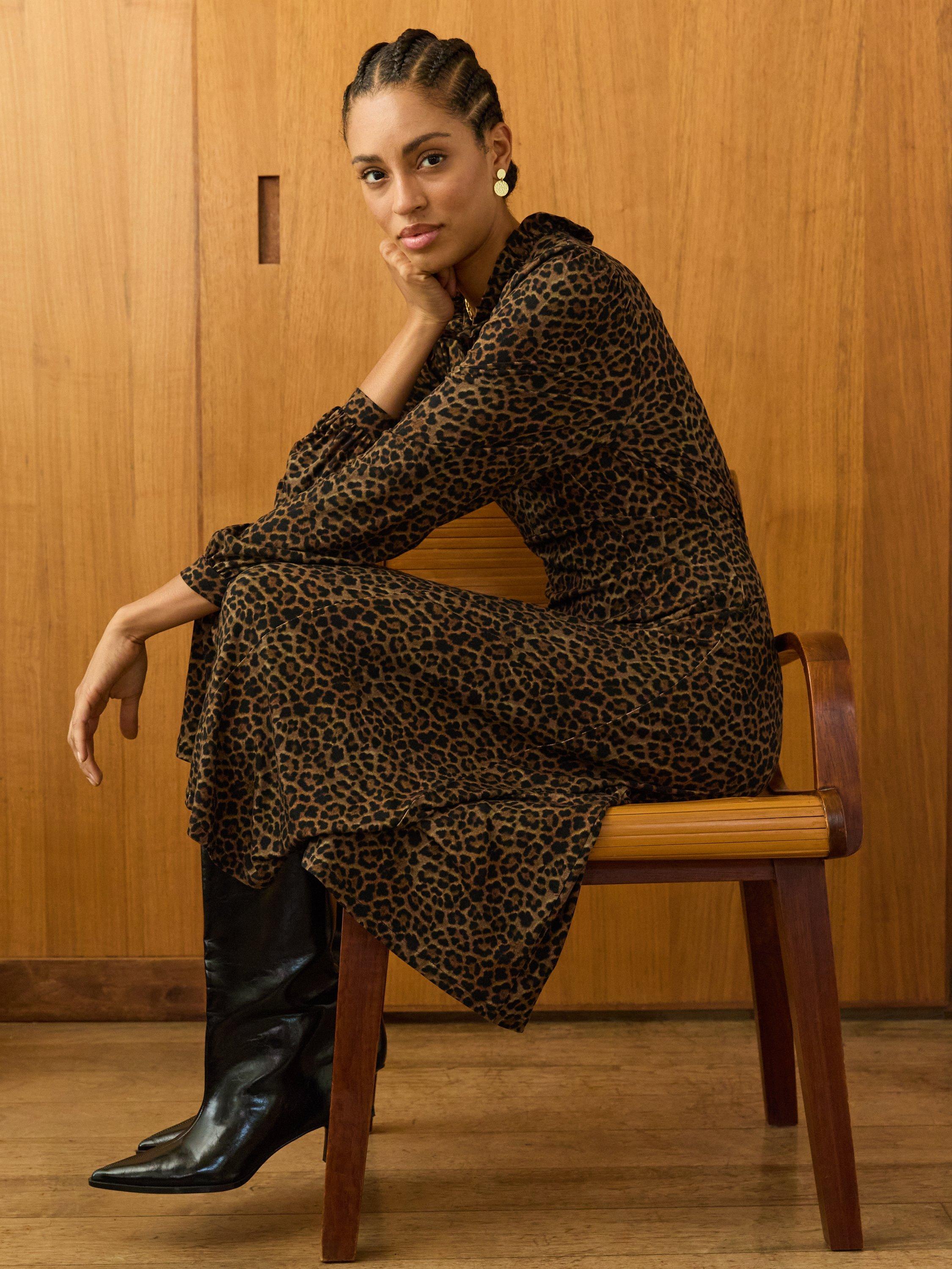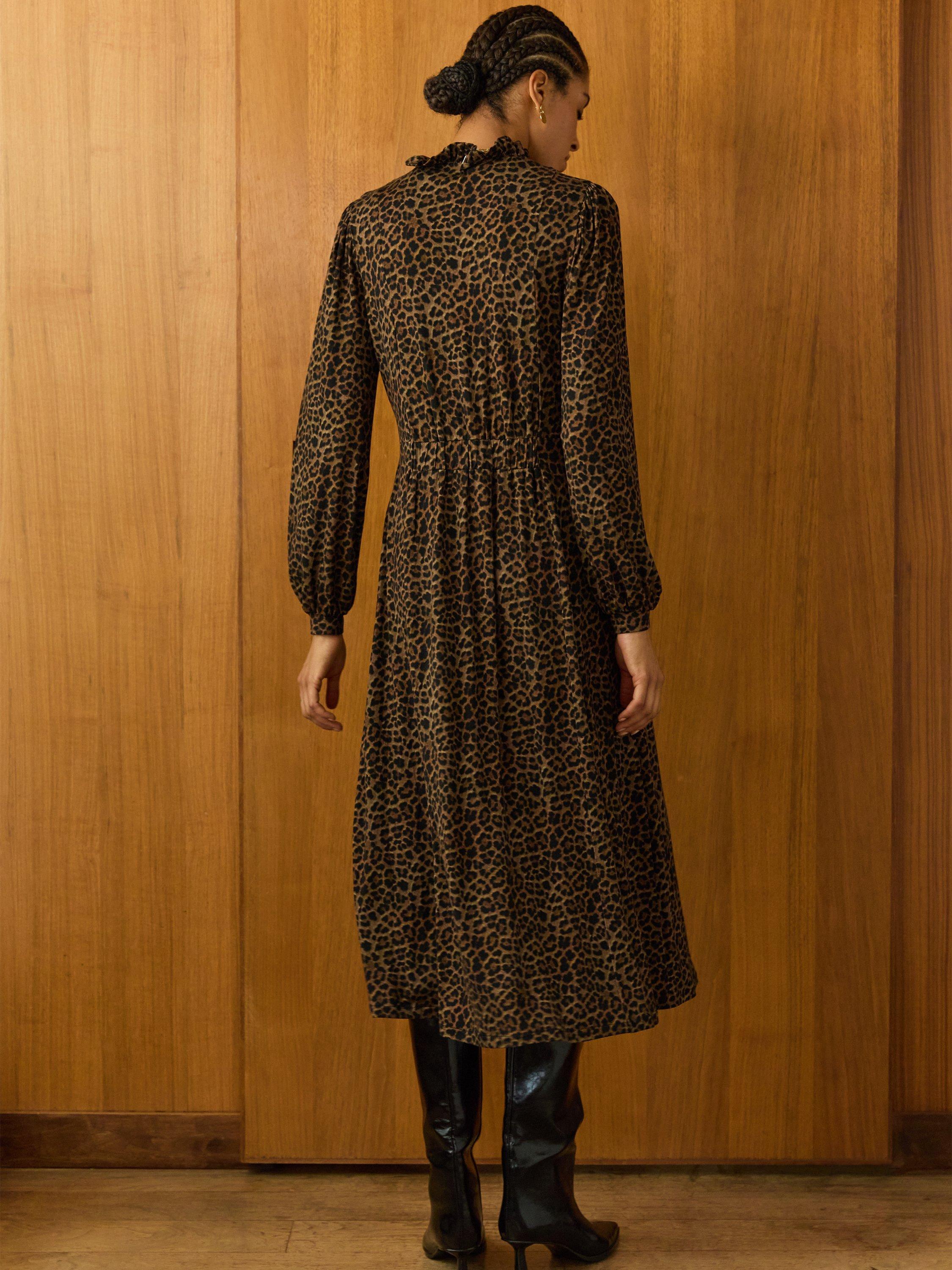 The Hannah Midi Dress is an easy update for your work wardrobe. Crafted in stretchy jersey with a dark leopard print, it’s high on comfort and style. The neckline is adorned with a pretty, Victoriana-inspired frill and the full sleeves are gathered into the cuffs and shoulders. The front section opens with a concealed zip, so it simply pulls on. Cut for a waist-skimming, fit-and-flare silhouette with an elastic panel to the back, it will take you from desk to dinner seamlessly.