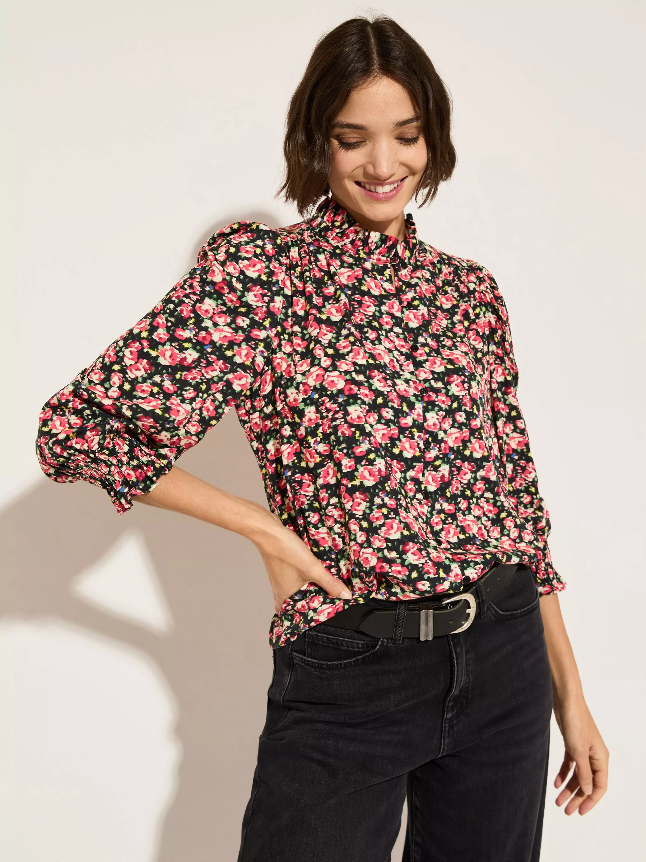 Melie's frill-topped collar, puffed sleeves and shirred cuffs make for an irresistible combination. Crafted from voile, it's comfortable, cool to the touch and hangs beautifully. In a poppy floral print for maximum versatility: wear it with black trousers on weekdays, and with jeans for leisurely weekend brunches.