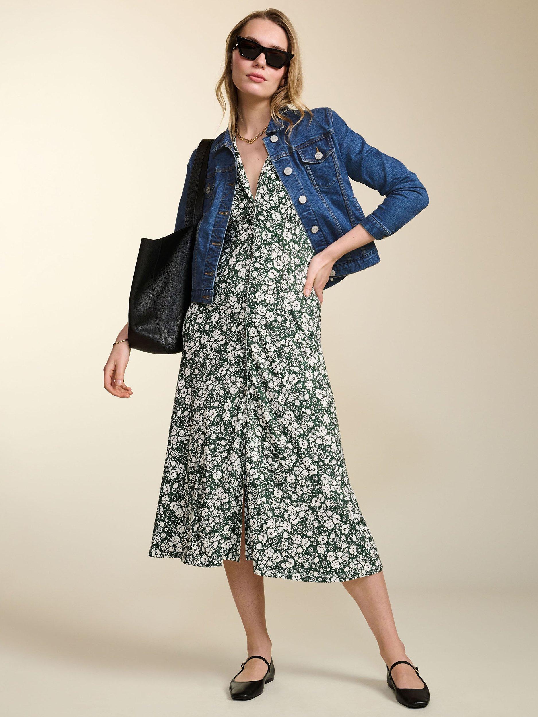 Unapologetically feminine, Sabine is a new take on a French-style tea dress. This pretty midi in jersey features gathering under the bust and is cut to skim the waist before flowing out. Its ditsy floral print and waist ties add to its vintage-inspired appeal. Reach for your basket bag and ballet pumps tout de suite!