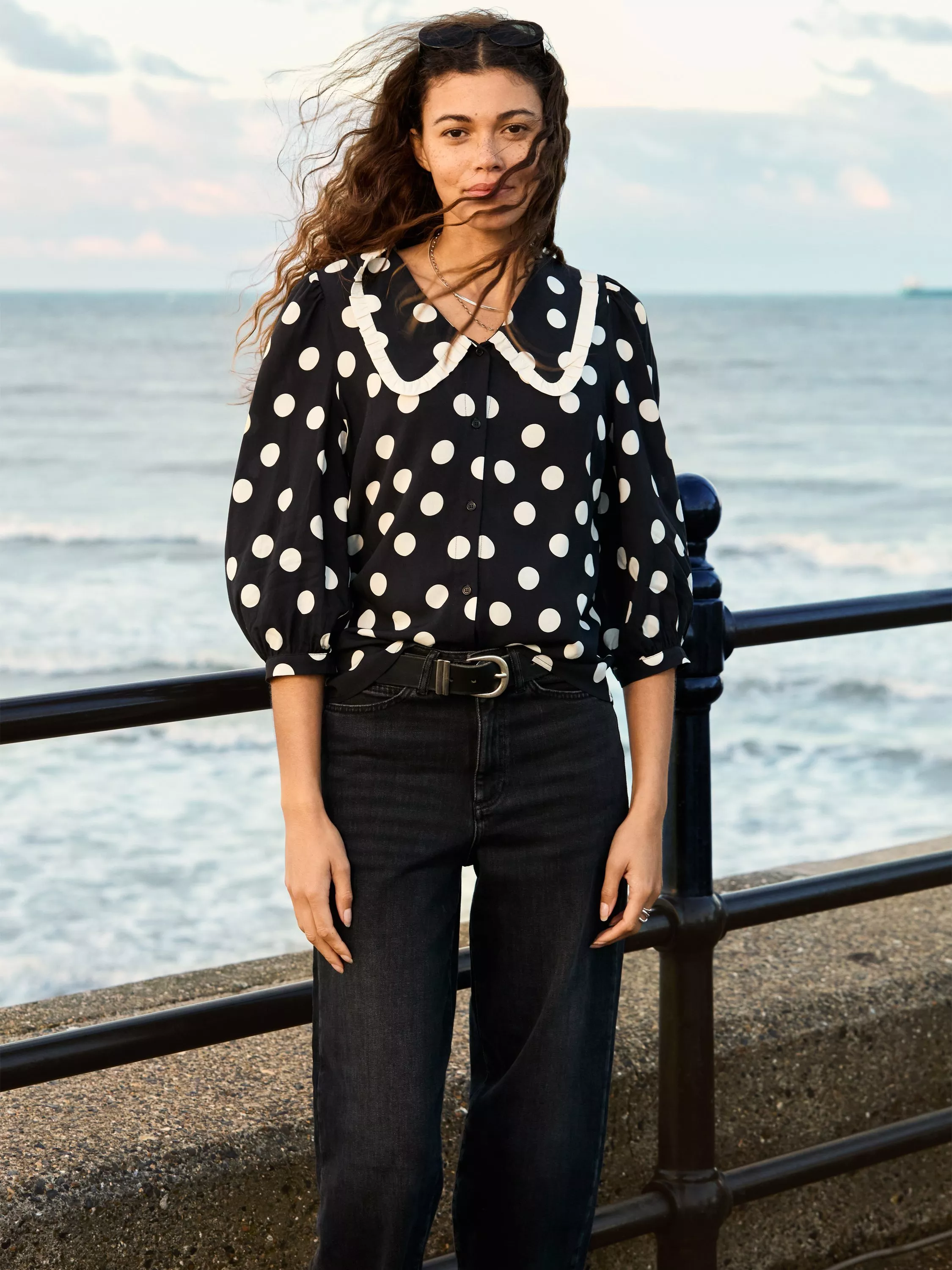 Polka dots, a statement collar plus a frill: what more could you want from a blouse?! The Sosha is the ultimate outfit pick-me-up, promising to inject a touch of newness to your favourite trousers and jeans. Dress it up for dinner with drop earrings, or style its playful collar over a cardigan.