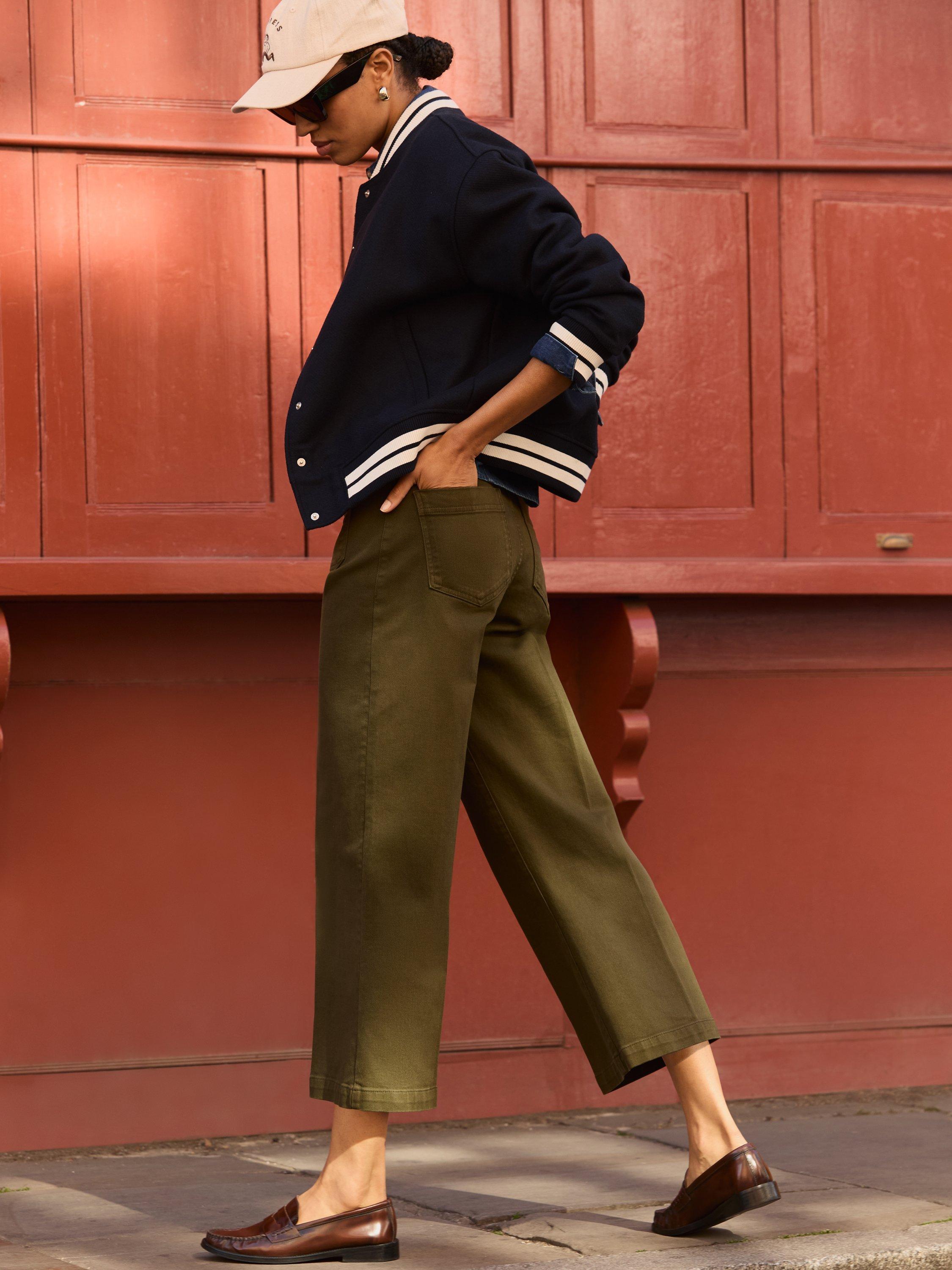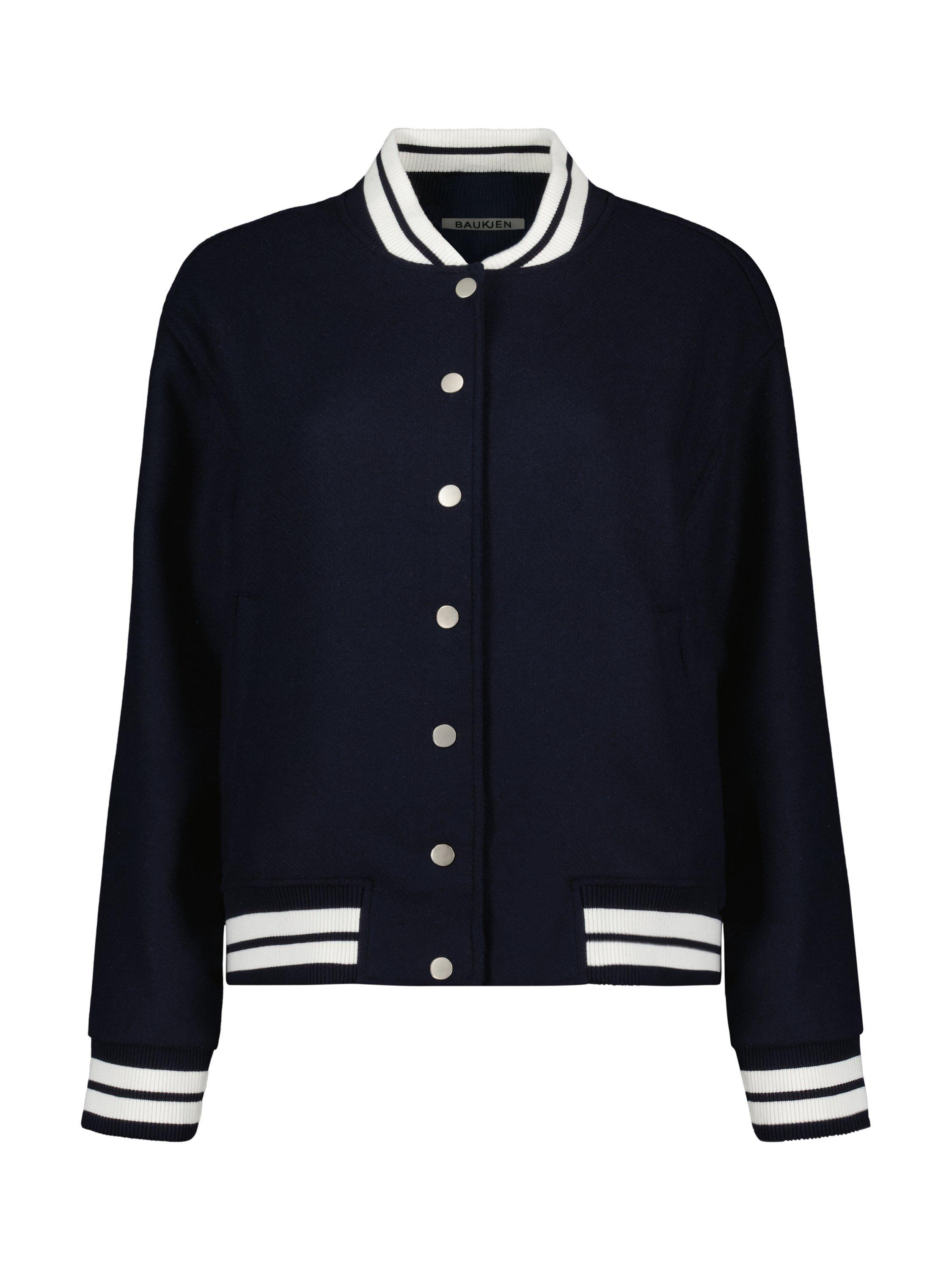 Put the cool into your off-duty outerwear with the Terri Wool Blend Bomber Jacket. A considered take on a classic varsity jacket, this style in a navy wool-blend is cut for a slightly oversized fit. It pairs perfectly with relaxed denim and is tipped with cream jersey on the collar, cuffs and hem with a navy stripe. Made using surplus fabric, there are a limited number of these jackets so get one quick.