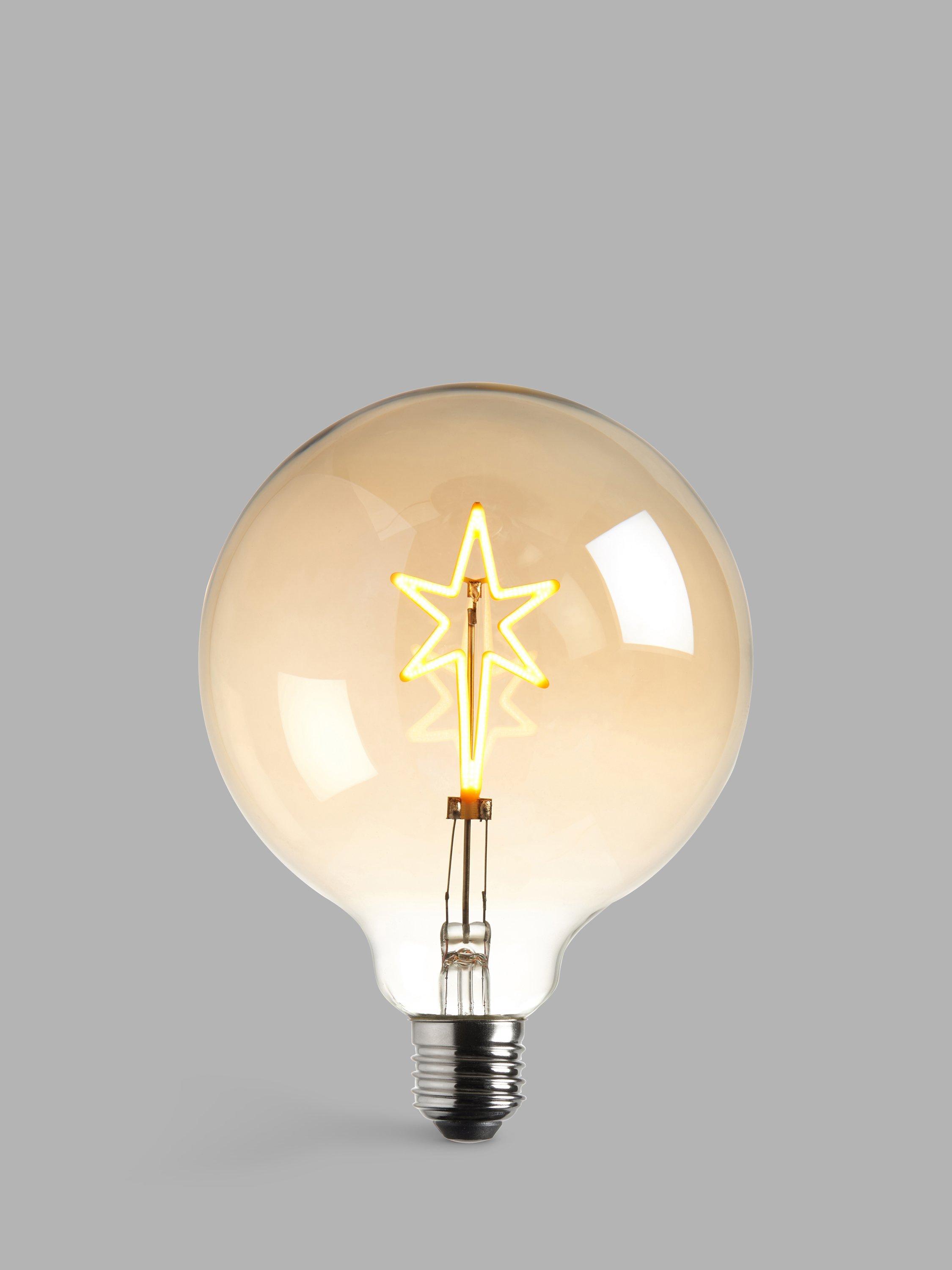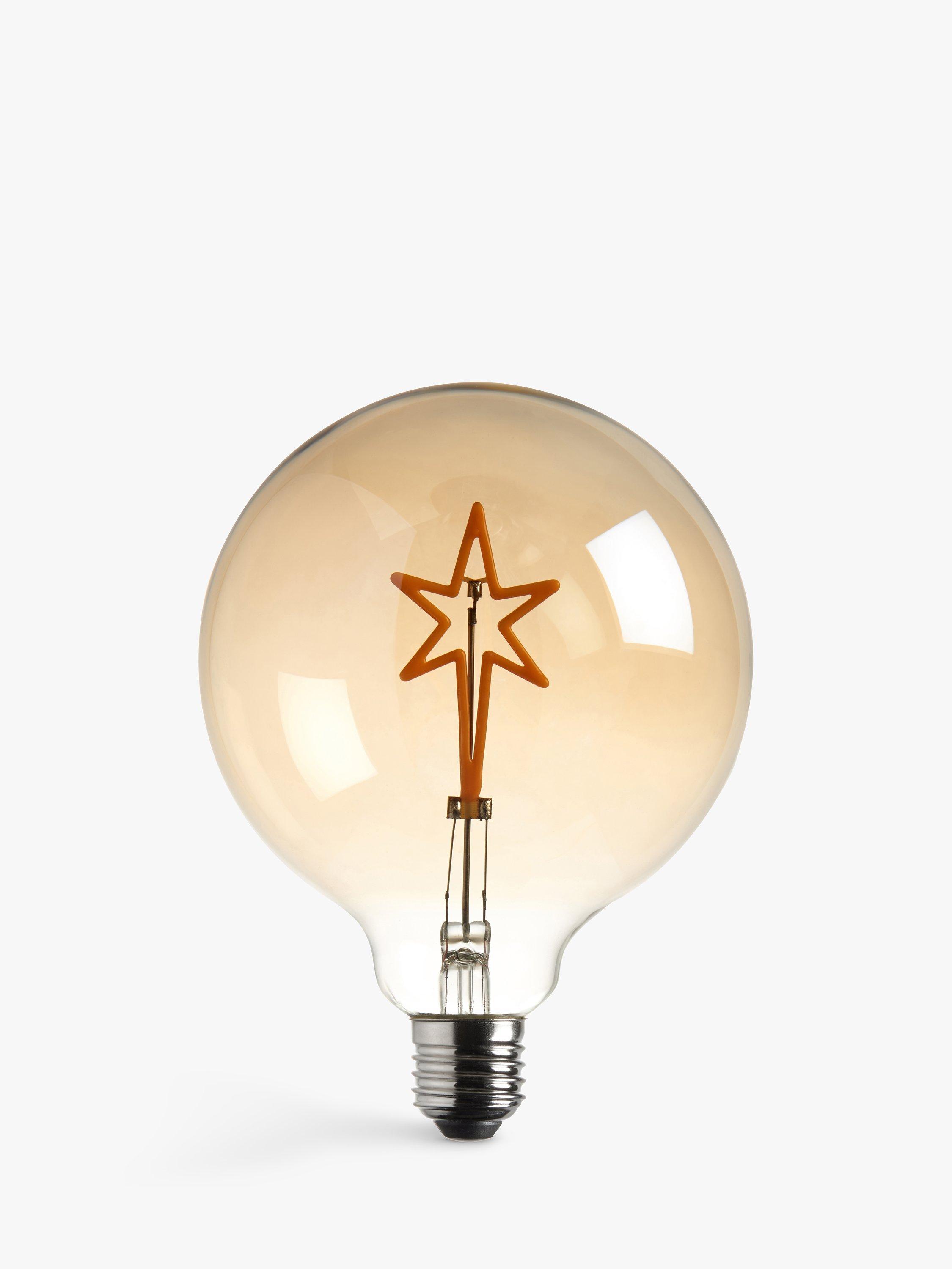 The filament of this decorative LED bulb has a bespoke and playful star design. The glass has an amber lustre finish and when illuminated, it offers a warm and effective glow. Great for bulbholder table lamps or single pendants.