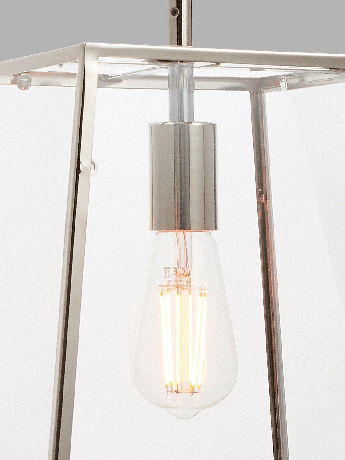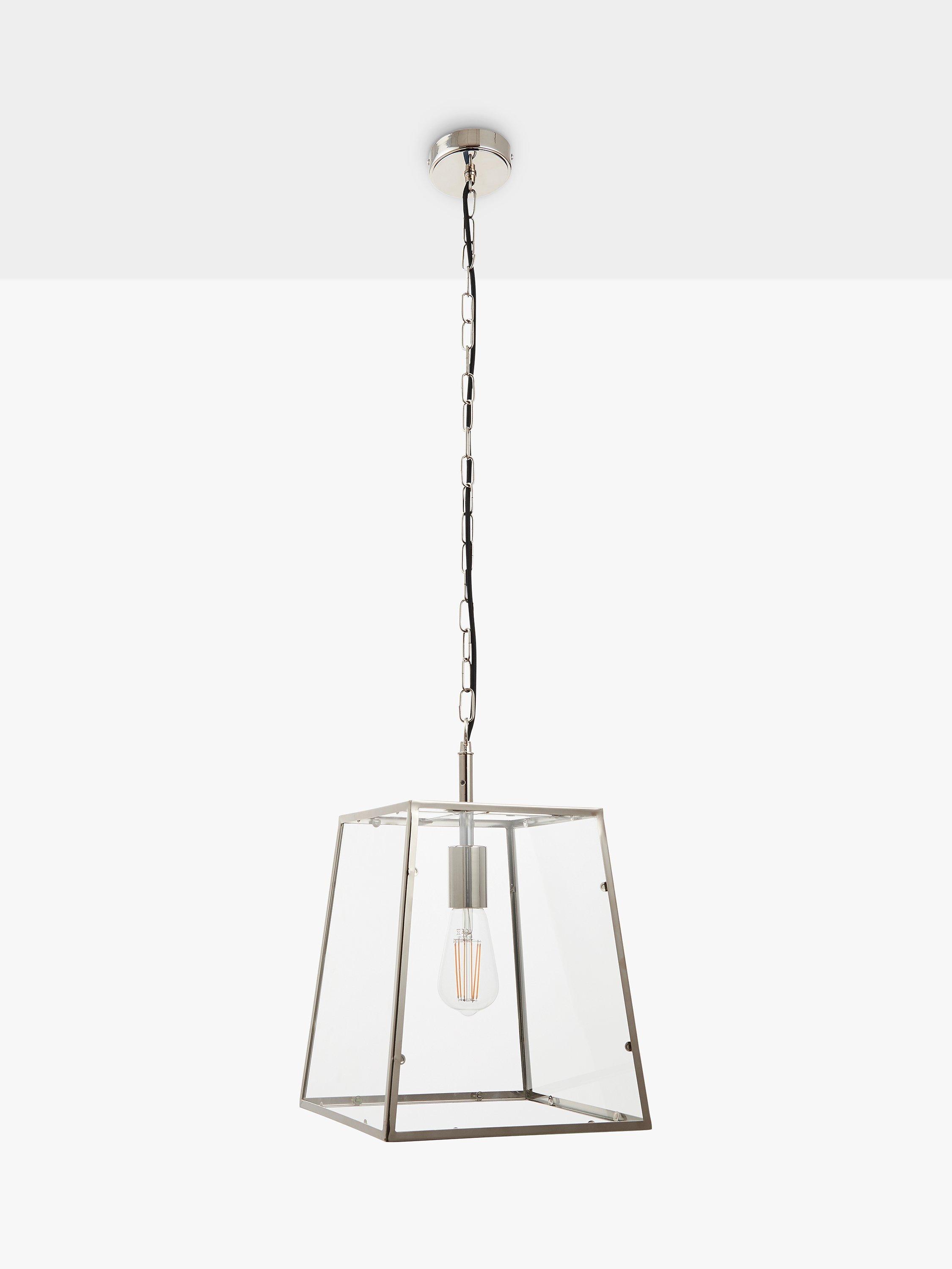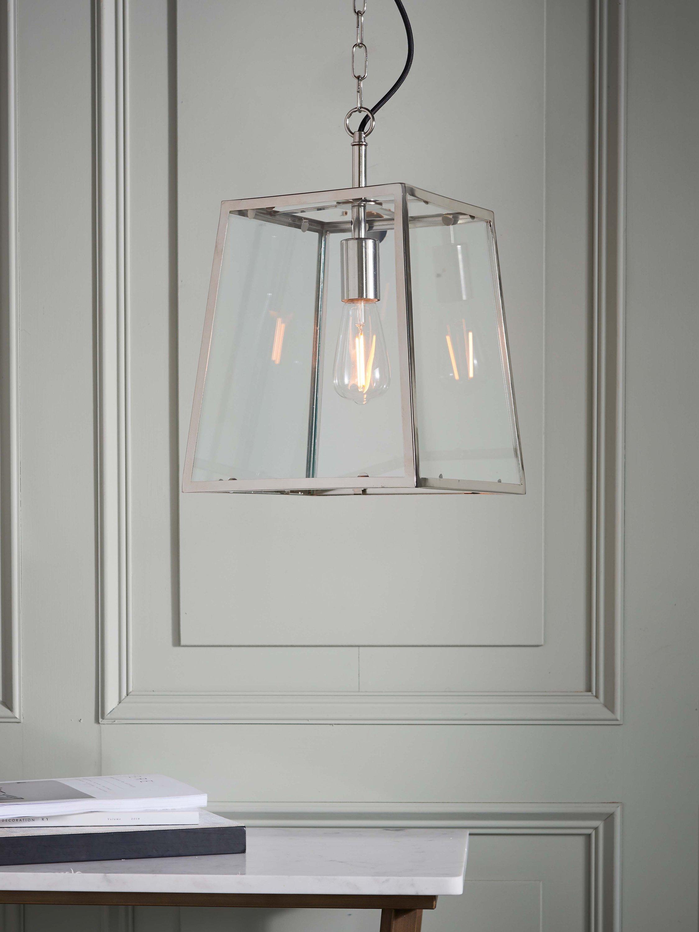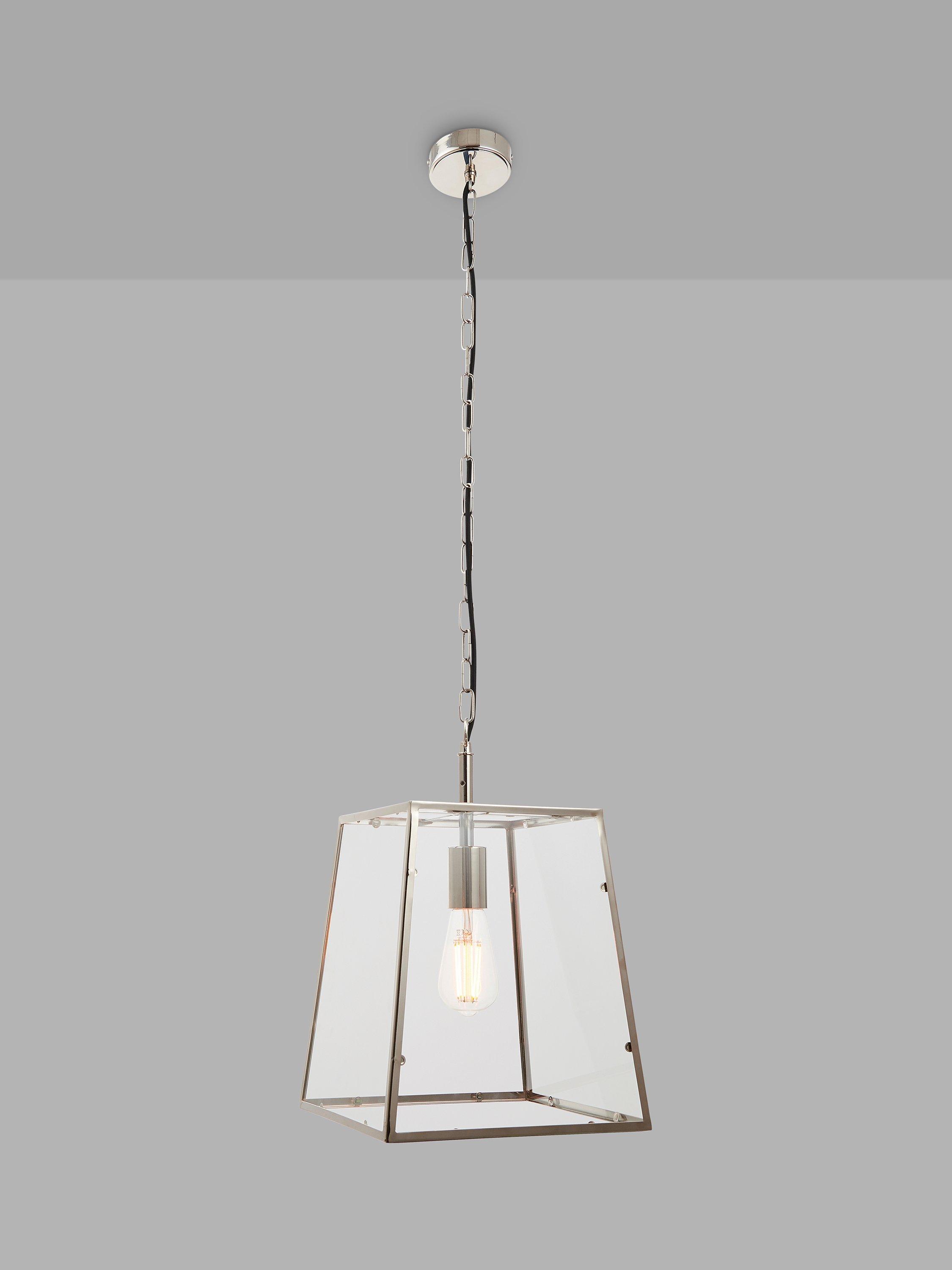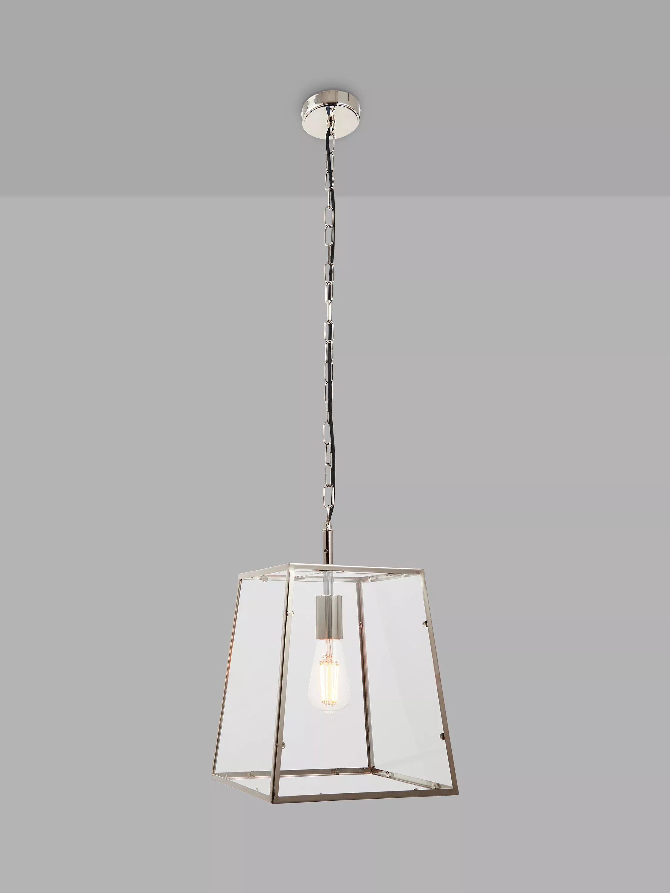 This ceiling fitting has a box lantern shape, made from clear glass panels with subtly tapered metalwork. It's suspended from a height-adjustable chain cable and easy to style in both modern and classic interiors. Choose a vintage style LED bulb with a decorative filament for an eye-catching look.