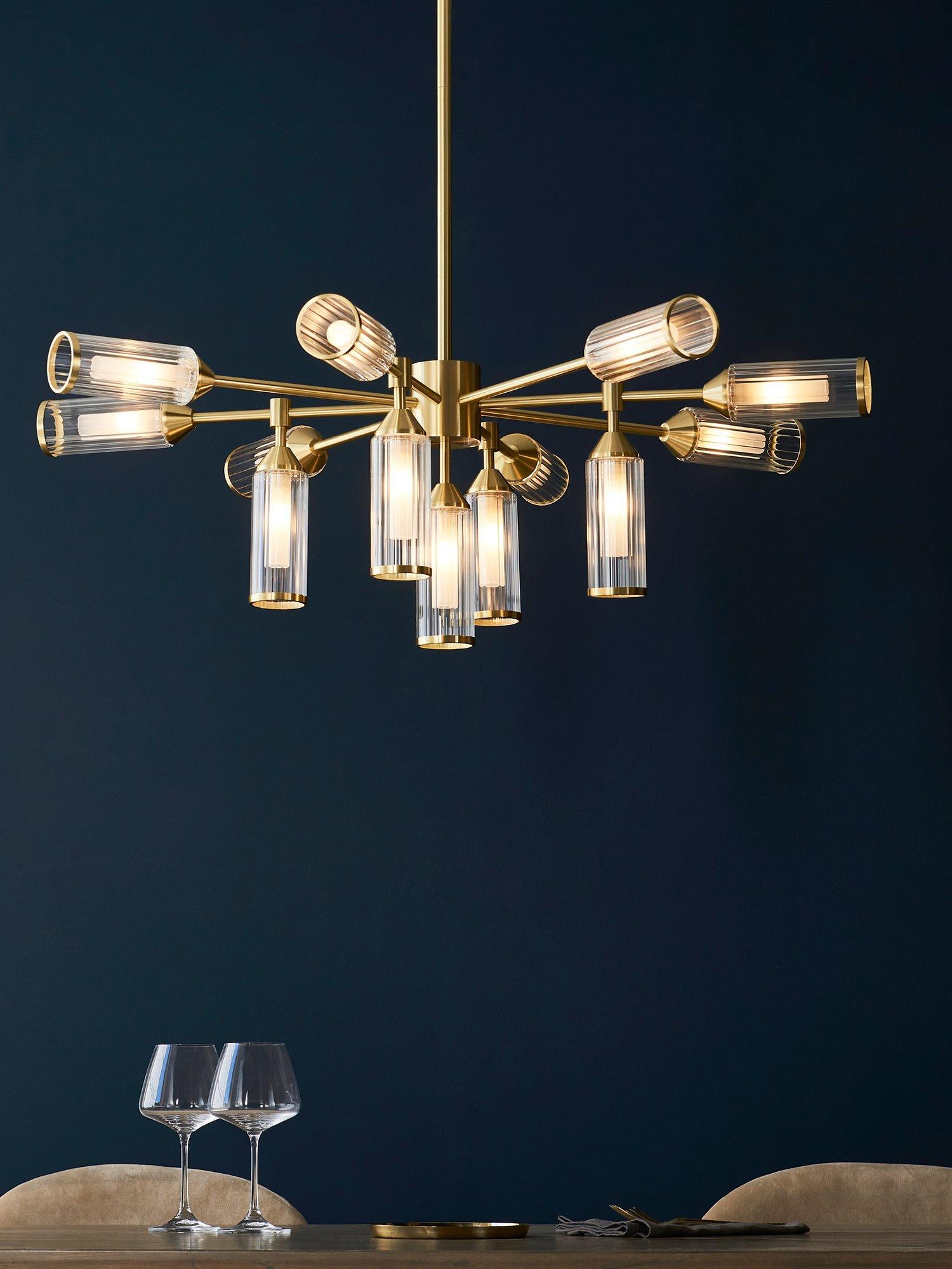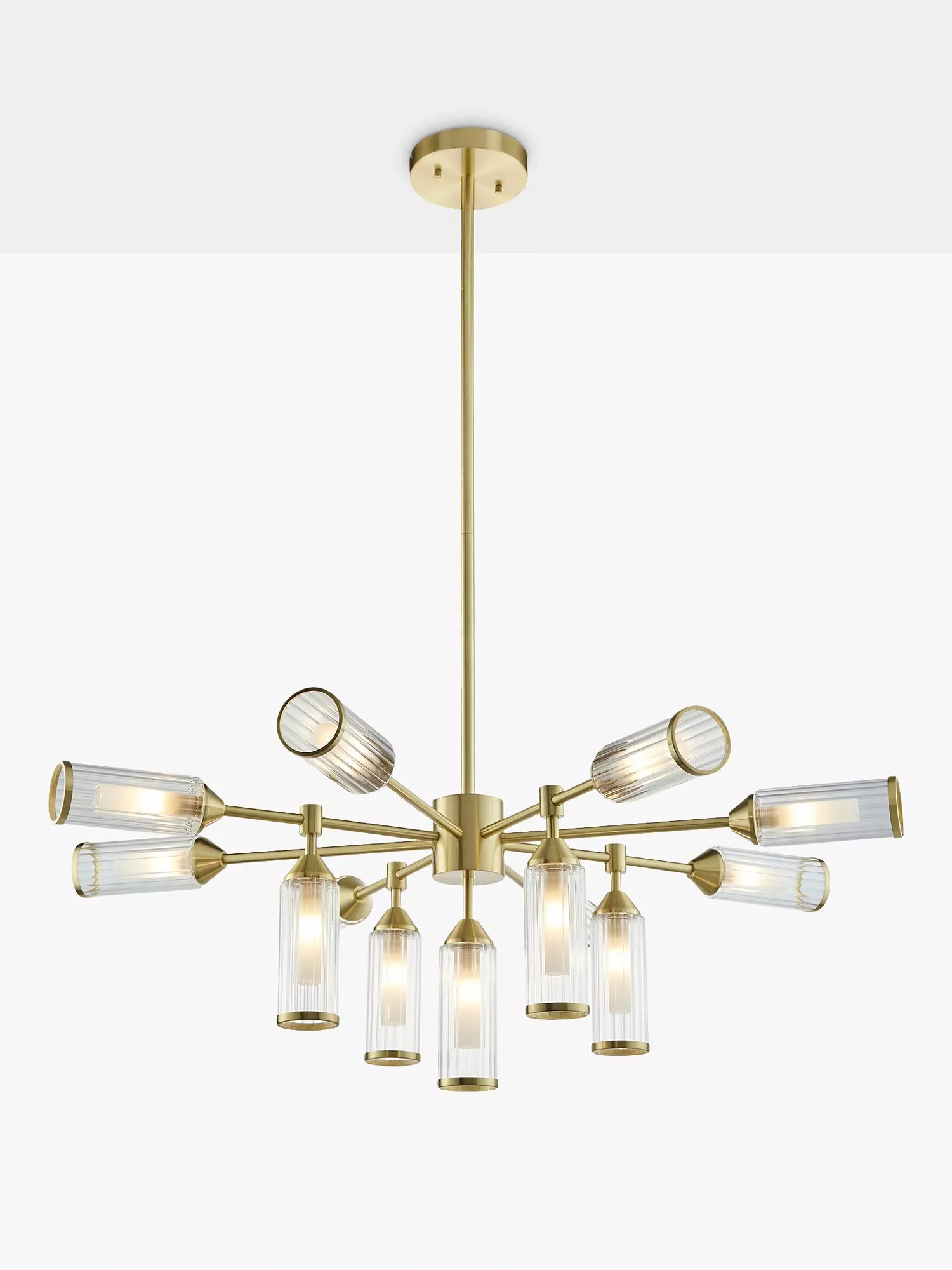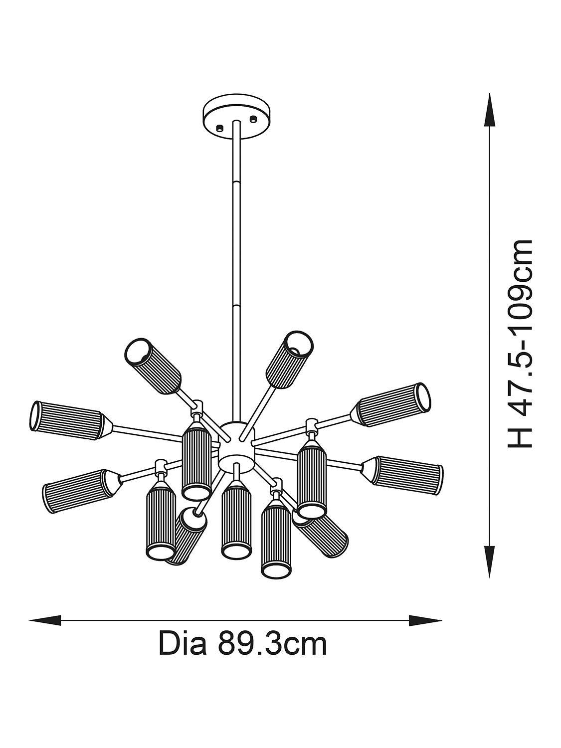 Bring a bold energy to your dining room with this dramatic thirteen arm ceiling light. The rib glass shades capped with satin brass metal edging give an ideal blend of elegant style and modern design.