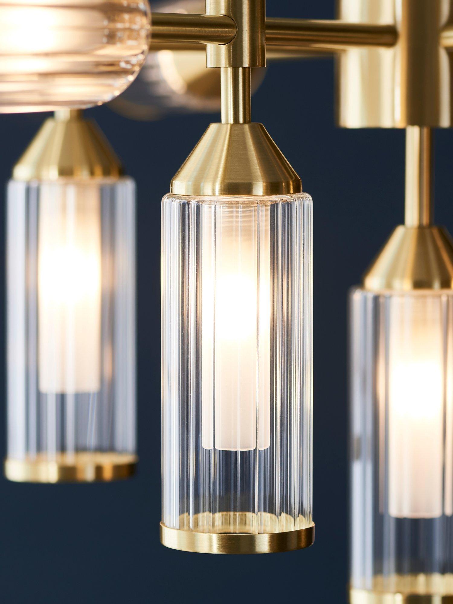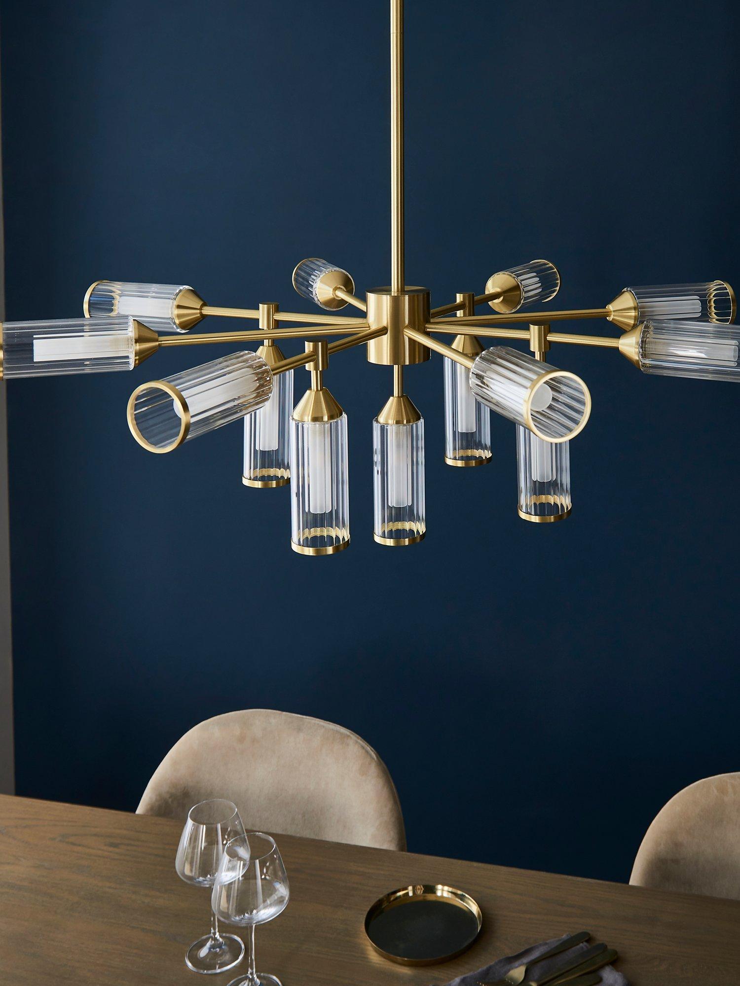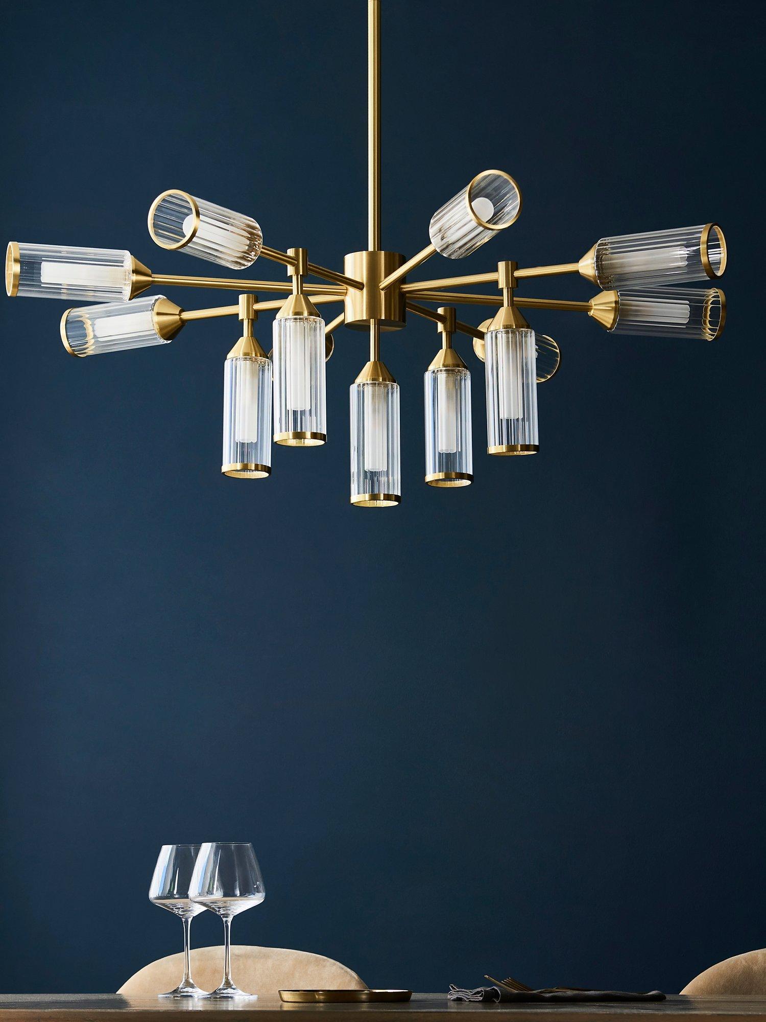 Bring a bold energy to your dining room with this dramatic thirteen arm ceiling light. The rib glass shades capped with satin brass metal edging give an ideal blend of elegant style and modern design.