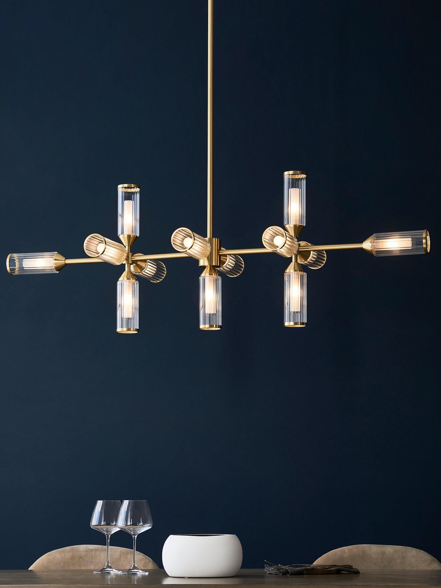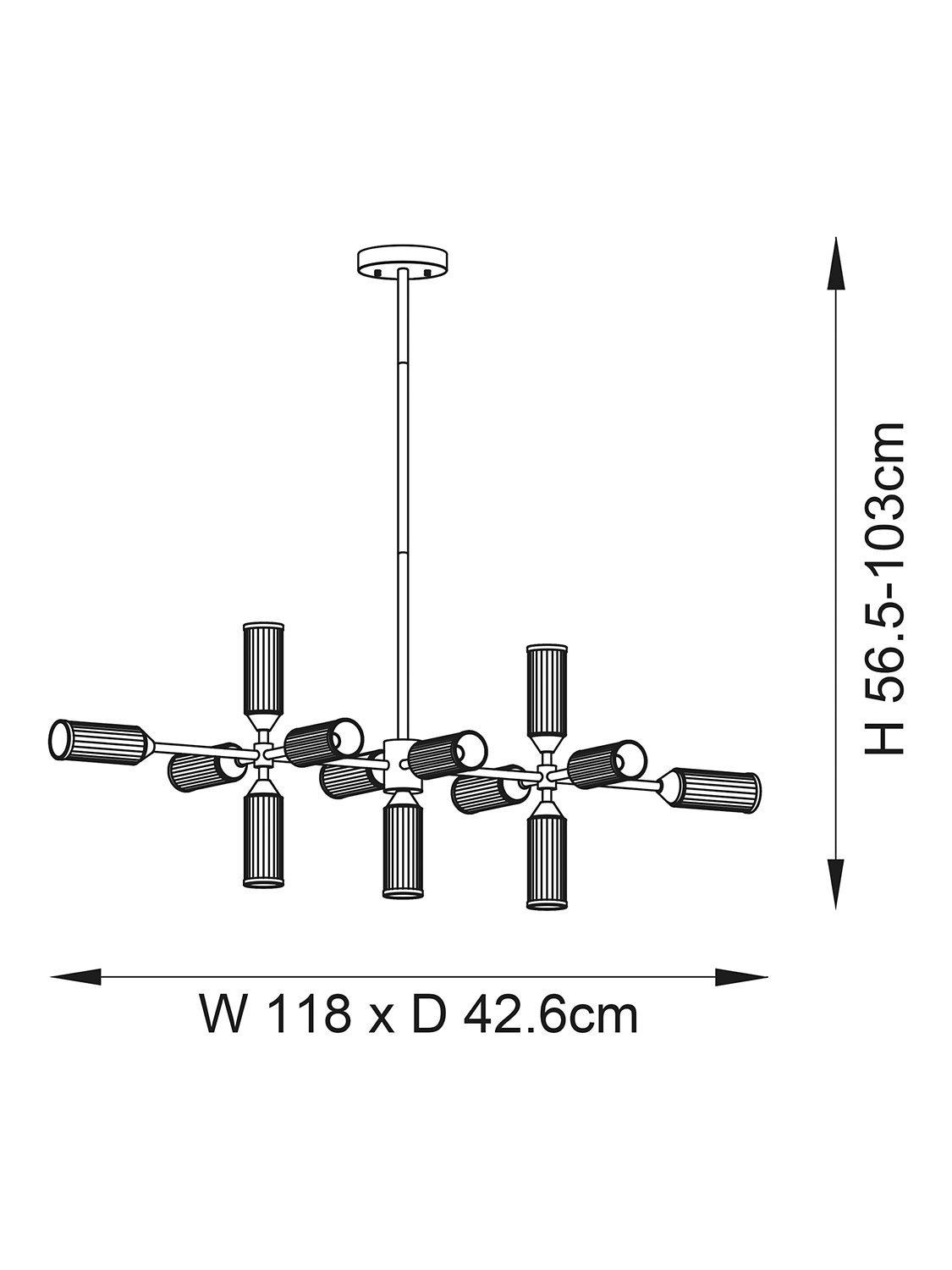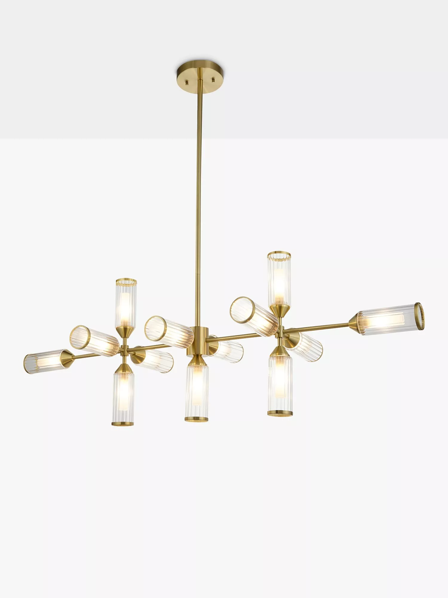 Add a grand design to any room with this stunning thirteen arm elongated pendant The eye-catching design gives a dramatic look in a dining room, entrance hall or living space. Thirteen rib glass shades caped with metal edging will flood your interior with glistening light.