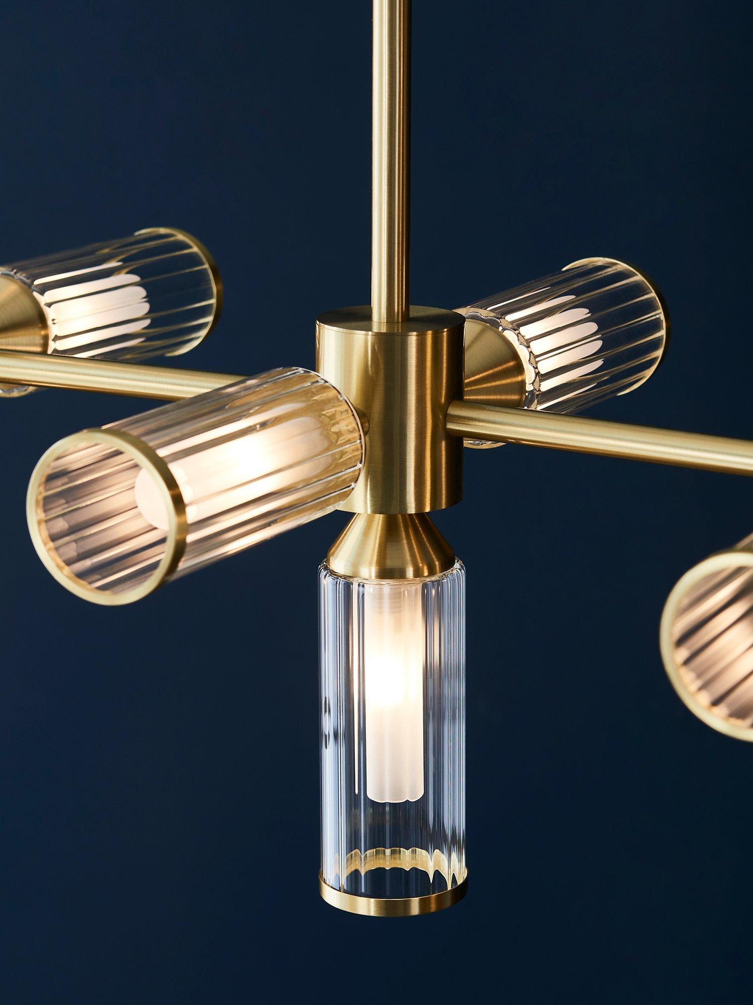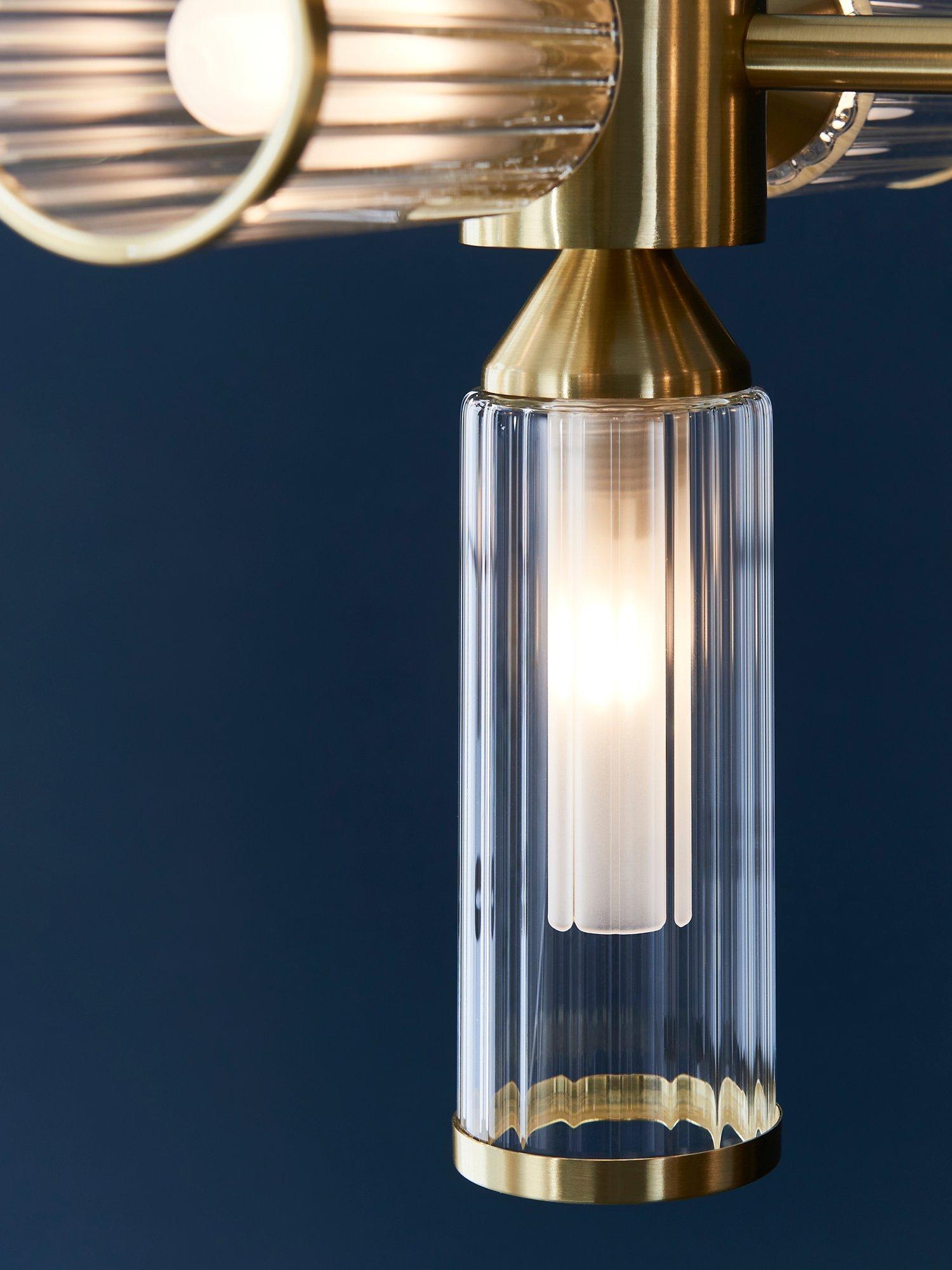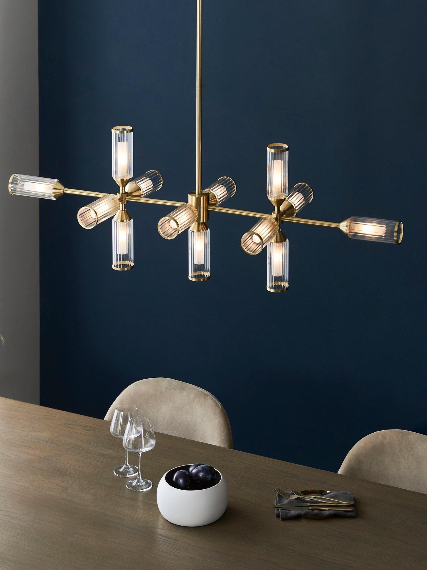 Add a grand design to any room with this stunning thirteen arm elongated pendant The eye-catching design gives a dramatic look in a dining room, entrance hall or living space. Thirteen rib glass shades caped with metal edging will flood your interior with glistening light.