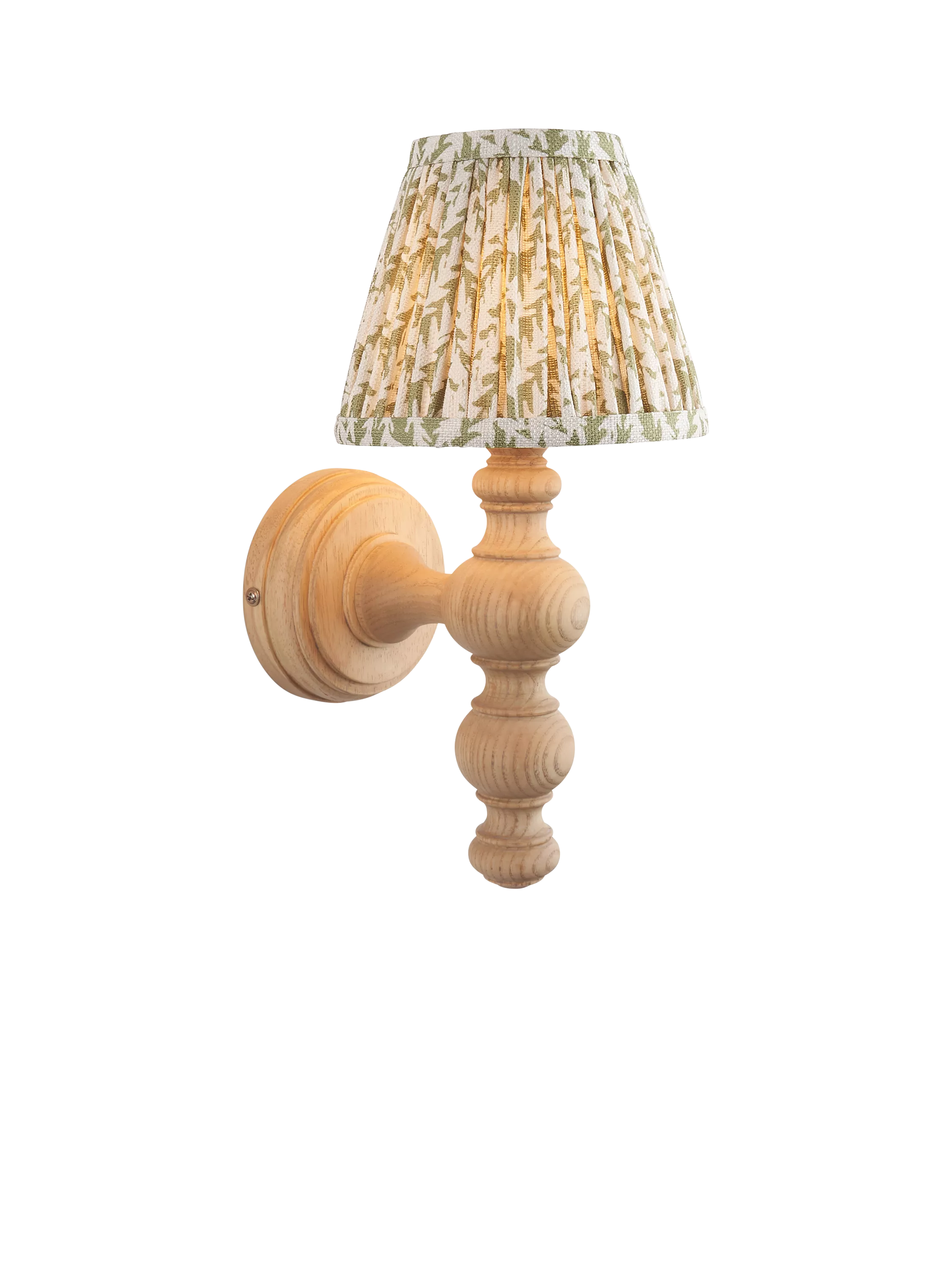 The Biro wall light has a beautiful natural ash wood turned spindle. Ideal for classic interiors, it features a brass B22 bulb holder. Finished with a herb green bay 16cm leaf print lampshade for a unique, traditional look.