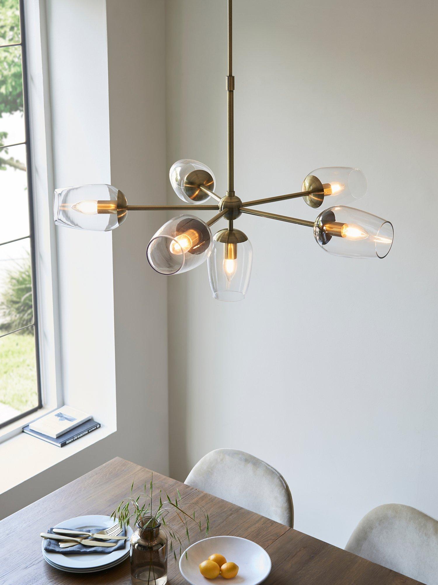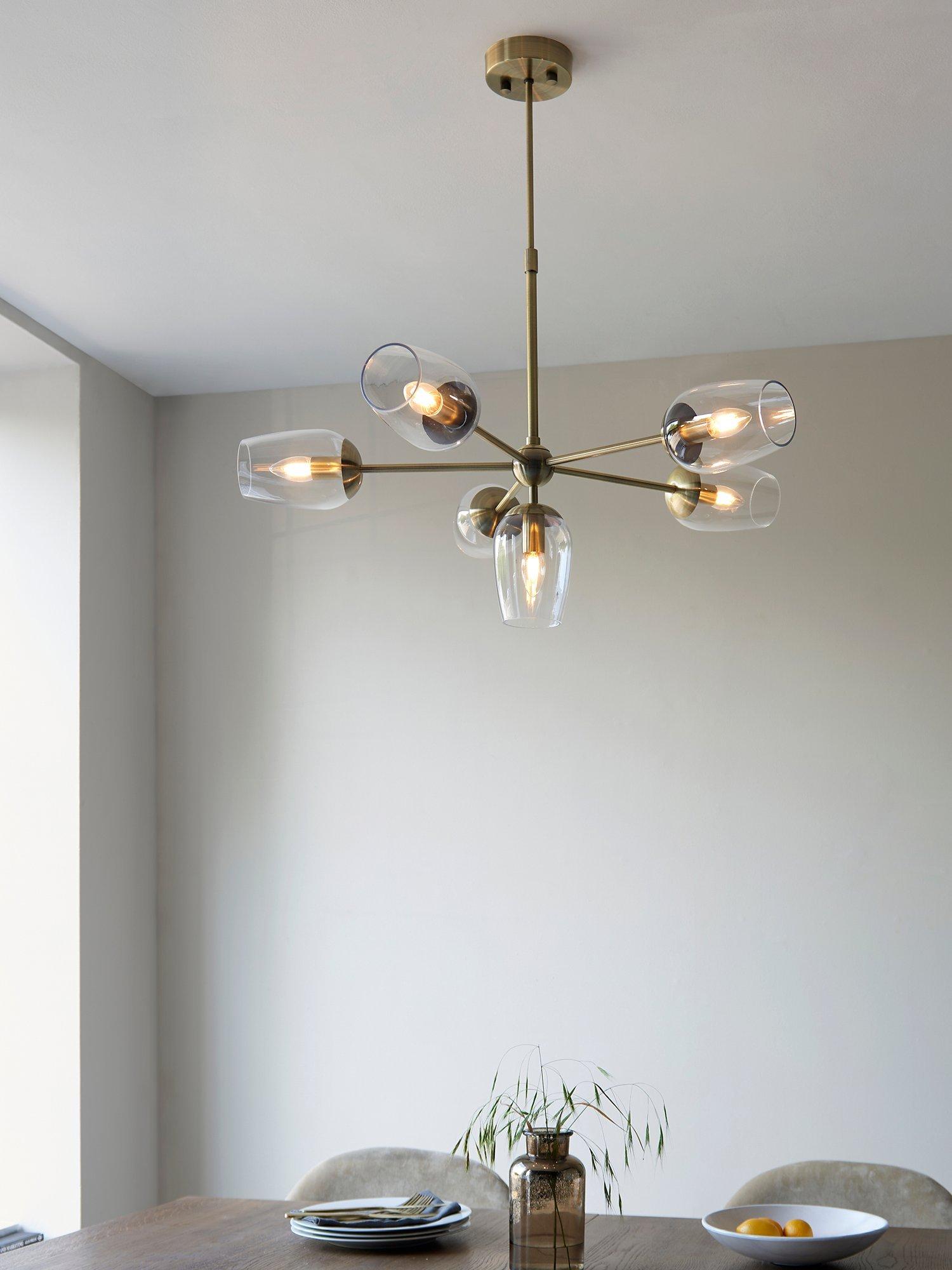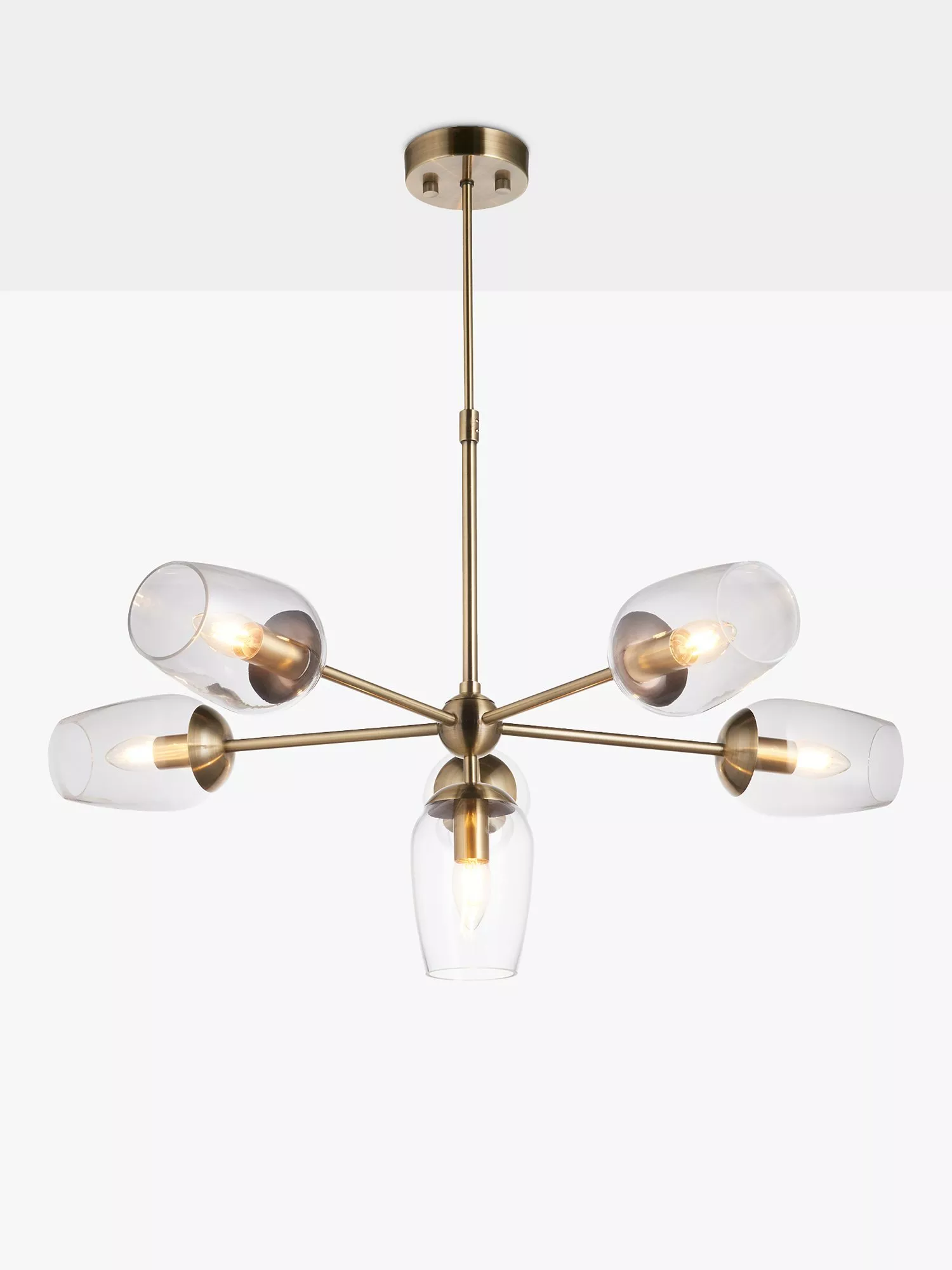 This antique brass finished ceiling light is designed with high-quality, wine glass shaped, glass shades that give off a direct wash of light. Adjust the height of this pendant to fit your space perfectly, shining a light over your dining space.