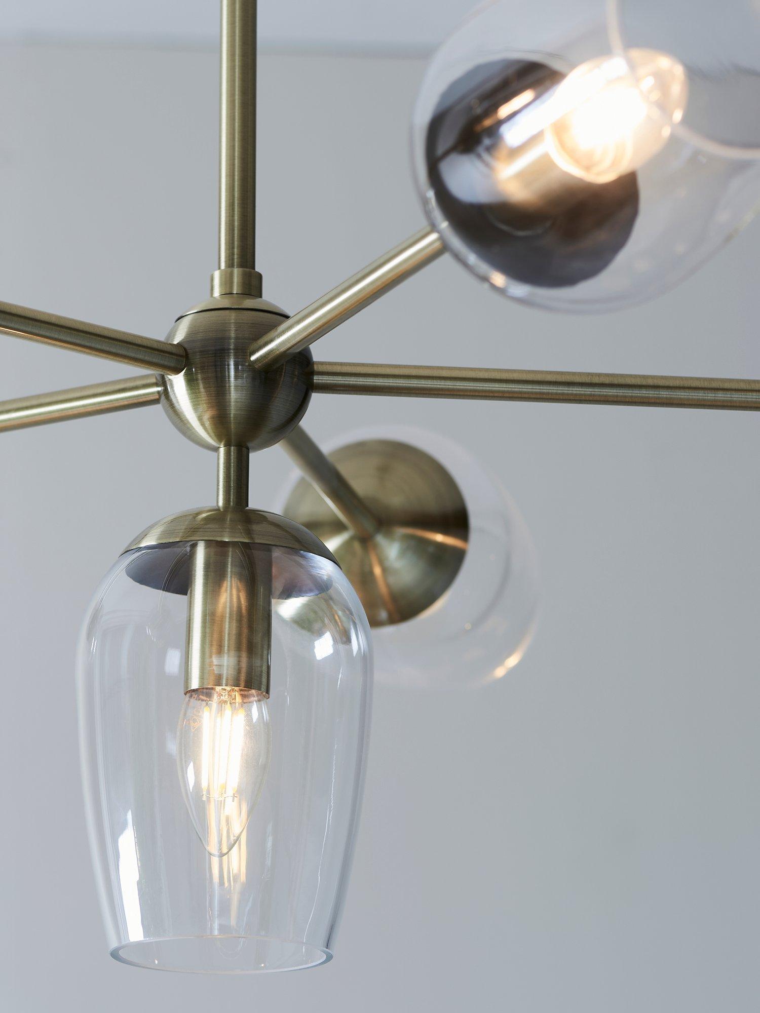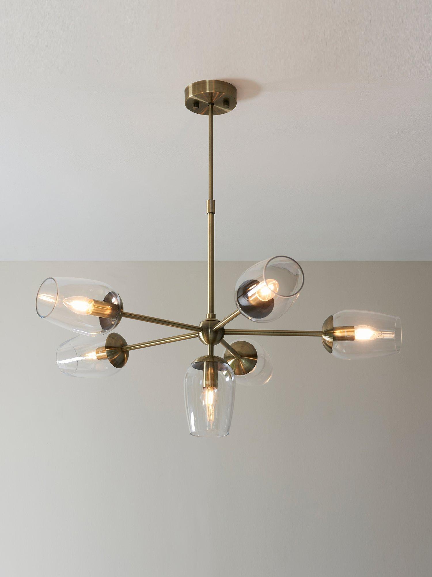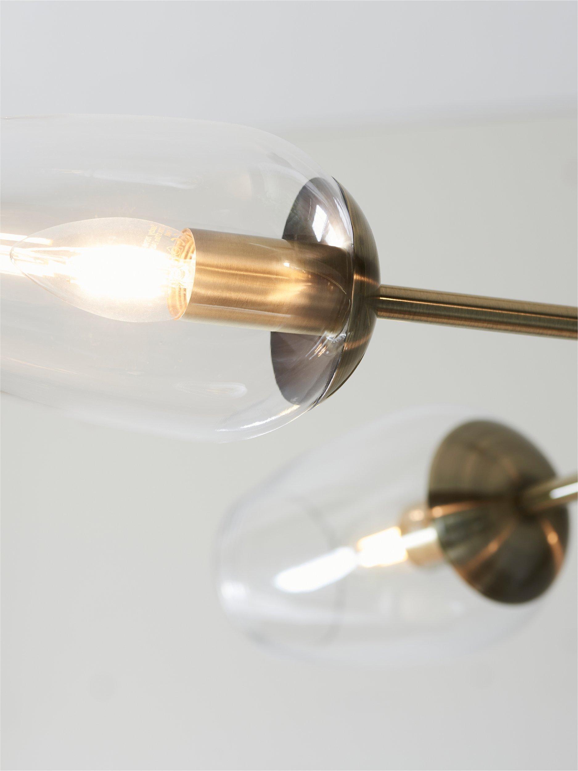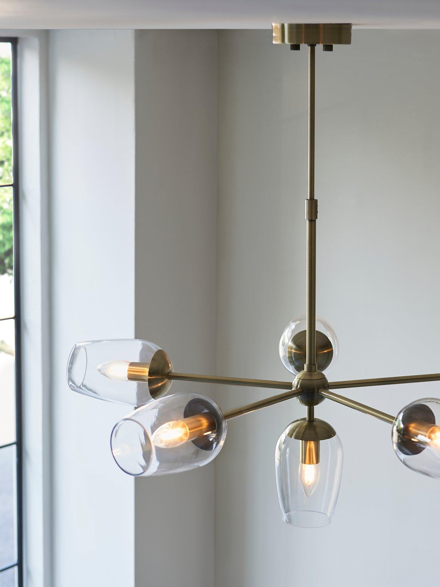This antique brass finished ceiling light is designed with high-quality, wine glass shaped, glass shades that give off a direct wash of light. Adjust the height of this pendant to fit your space perfectly, shining a light over your dining space.