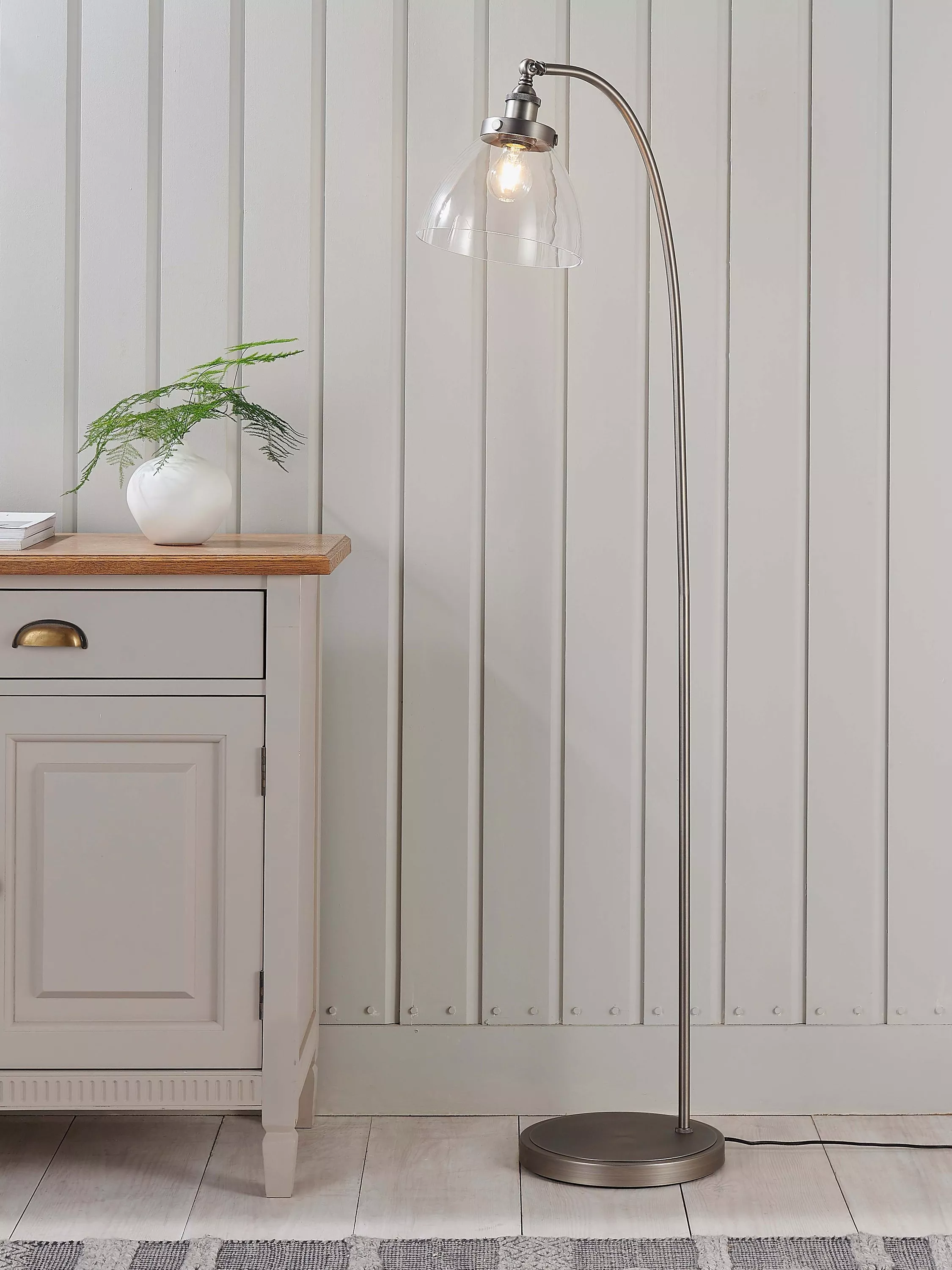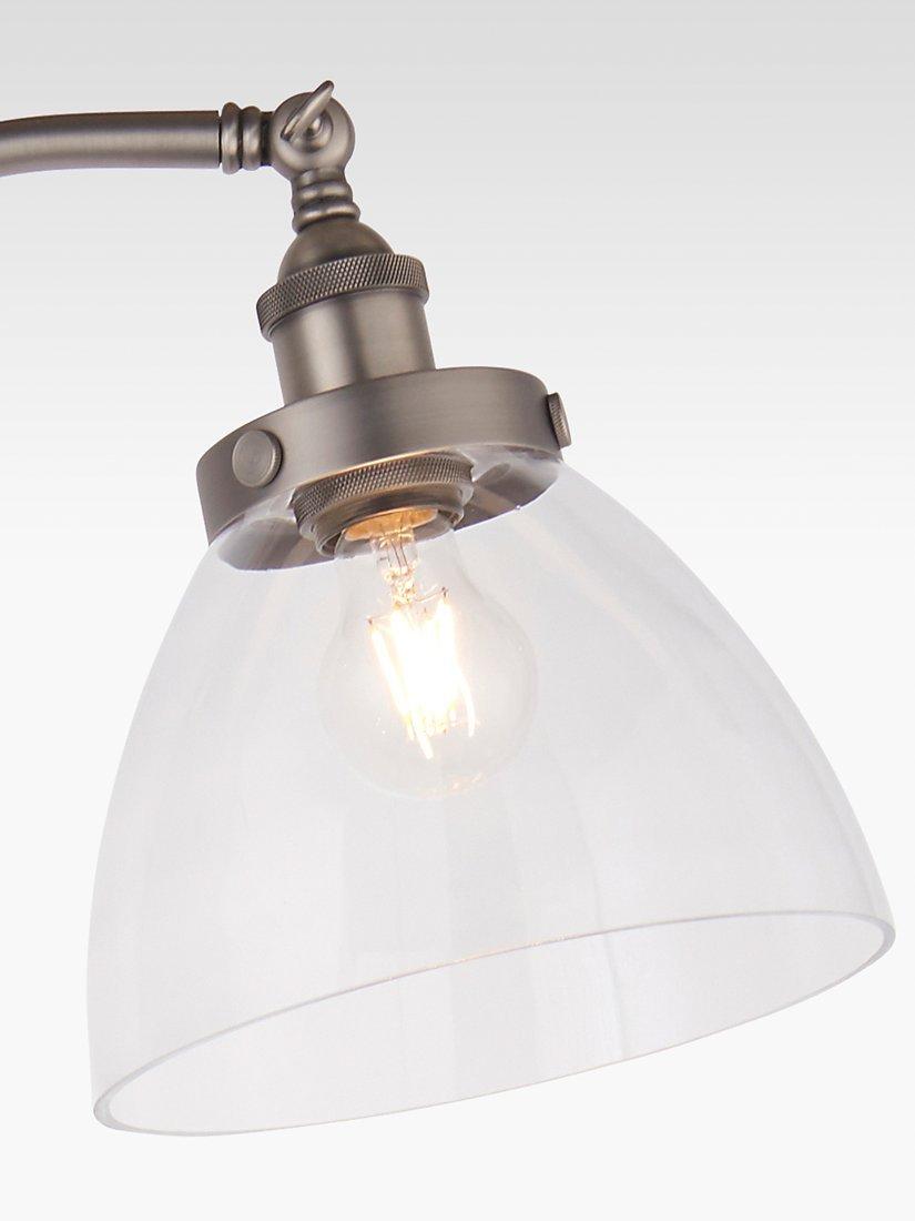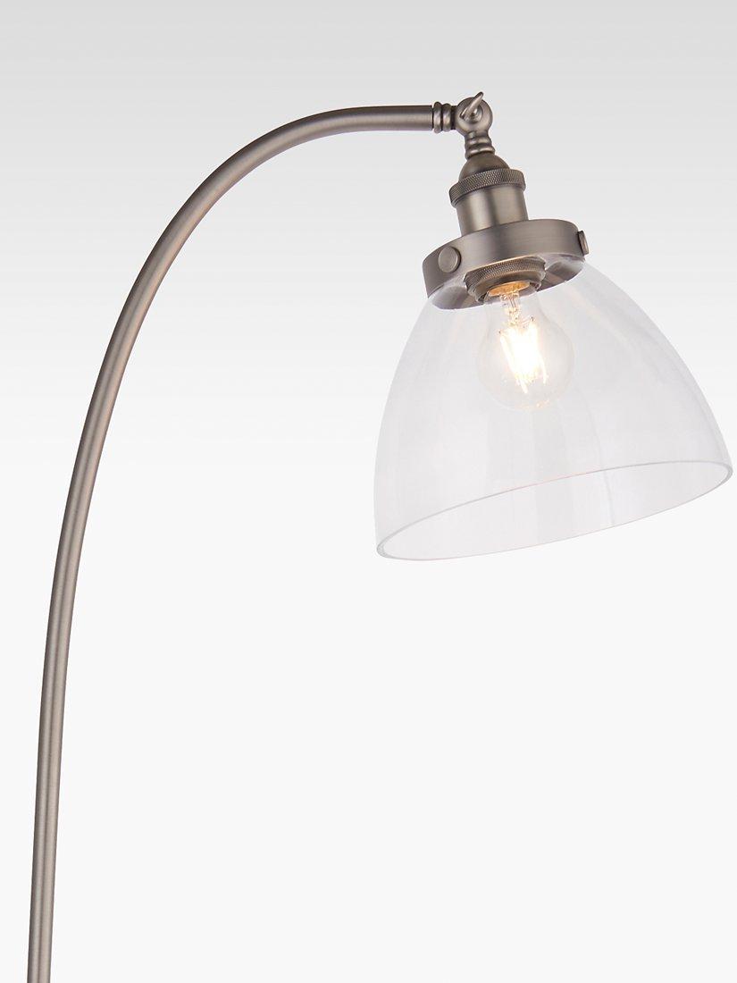 Made from sturdy steel with a clear glass shade, this floor lamp imparts a soft, industrial aesthetic. The head is adjustable so you can direct light where you need it and it's best paired with an LED filament bulb to enhance a restorative look in your home. Available in a brushed, antique or aged finish.