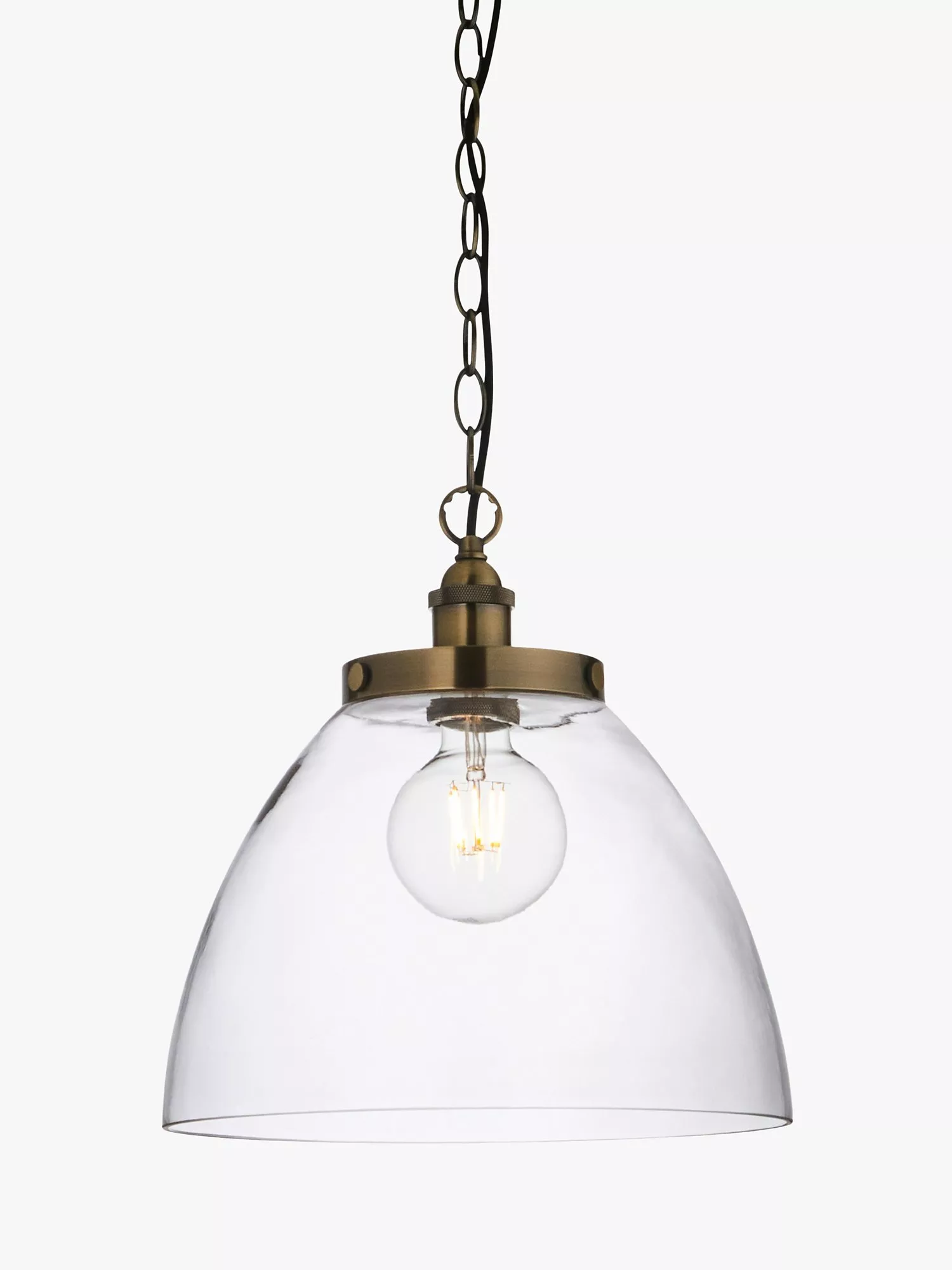 The ultimate industrial pendant. The exposed chain and fittings gives this clear glass pendant a modern feel. Ideal in kitchens; above an island or over a dining table.