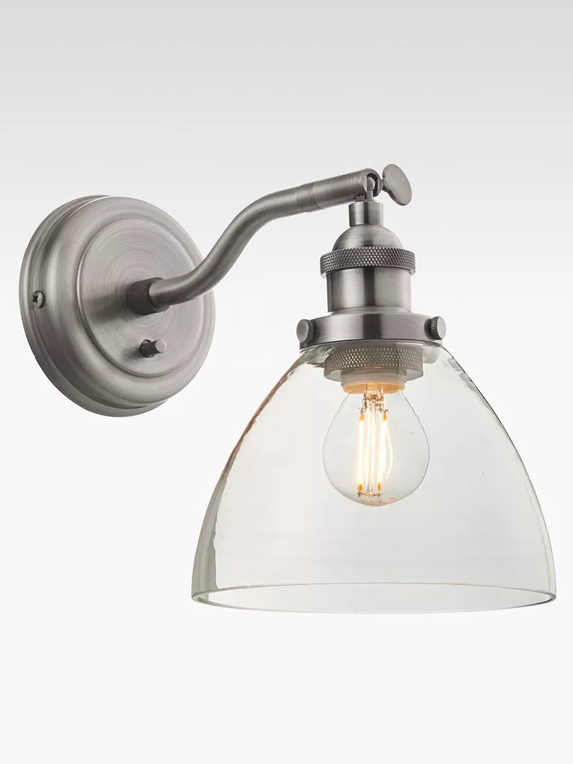 Made from sturdy steel with a dome-shaped, clear glass shade, this wall light has a soft, industrial aesthetic. The head is adjustable so you can direct light where you need it and it's best paired with an LED filament bulb to enhance a restorative look in your home. The Matt Nickel option has a brushed finish and the Brass option has an Antique finish.