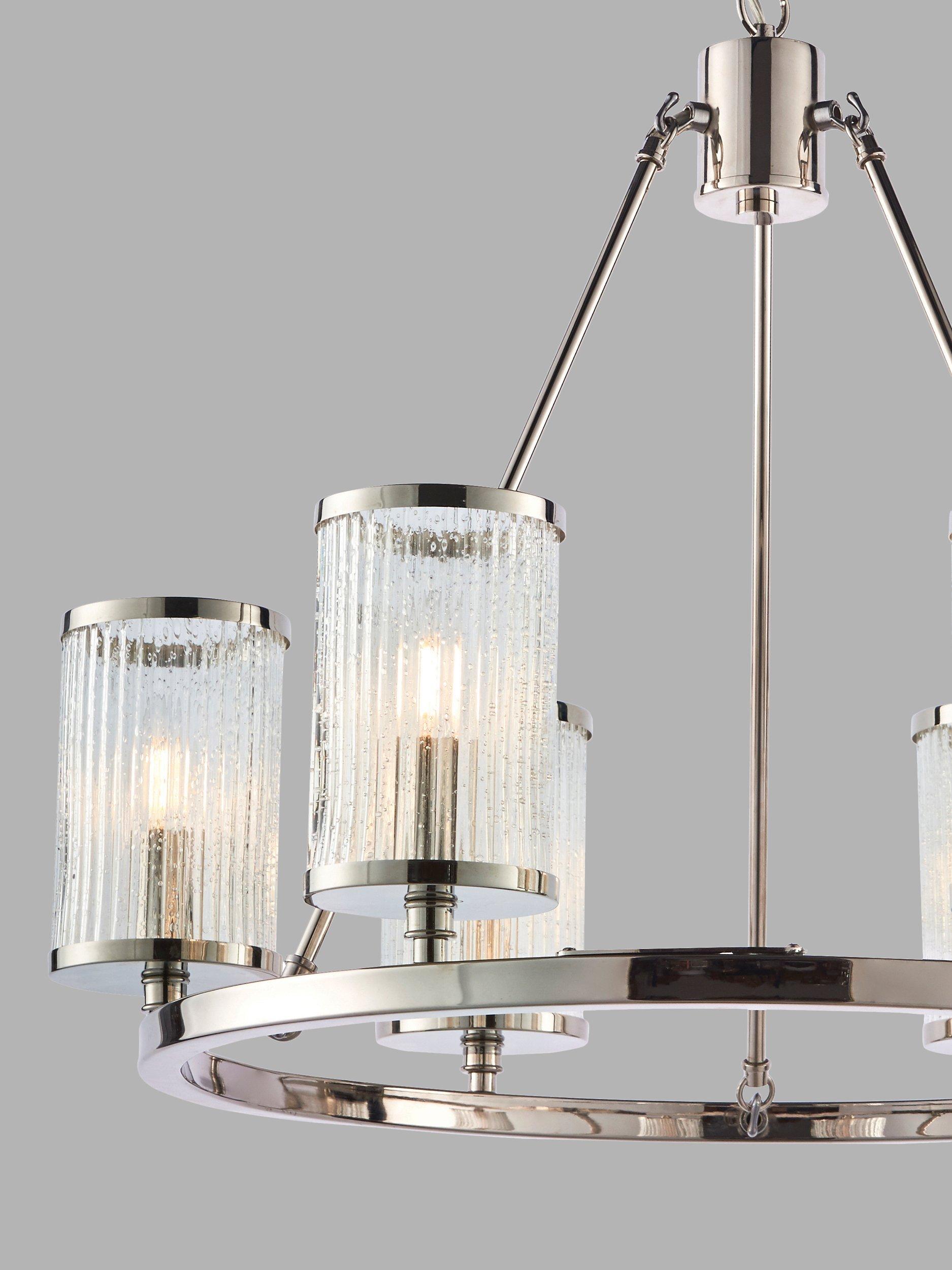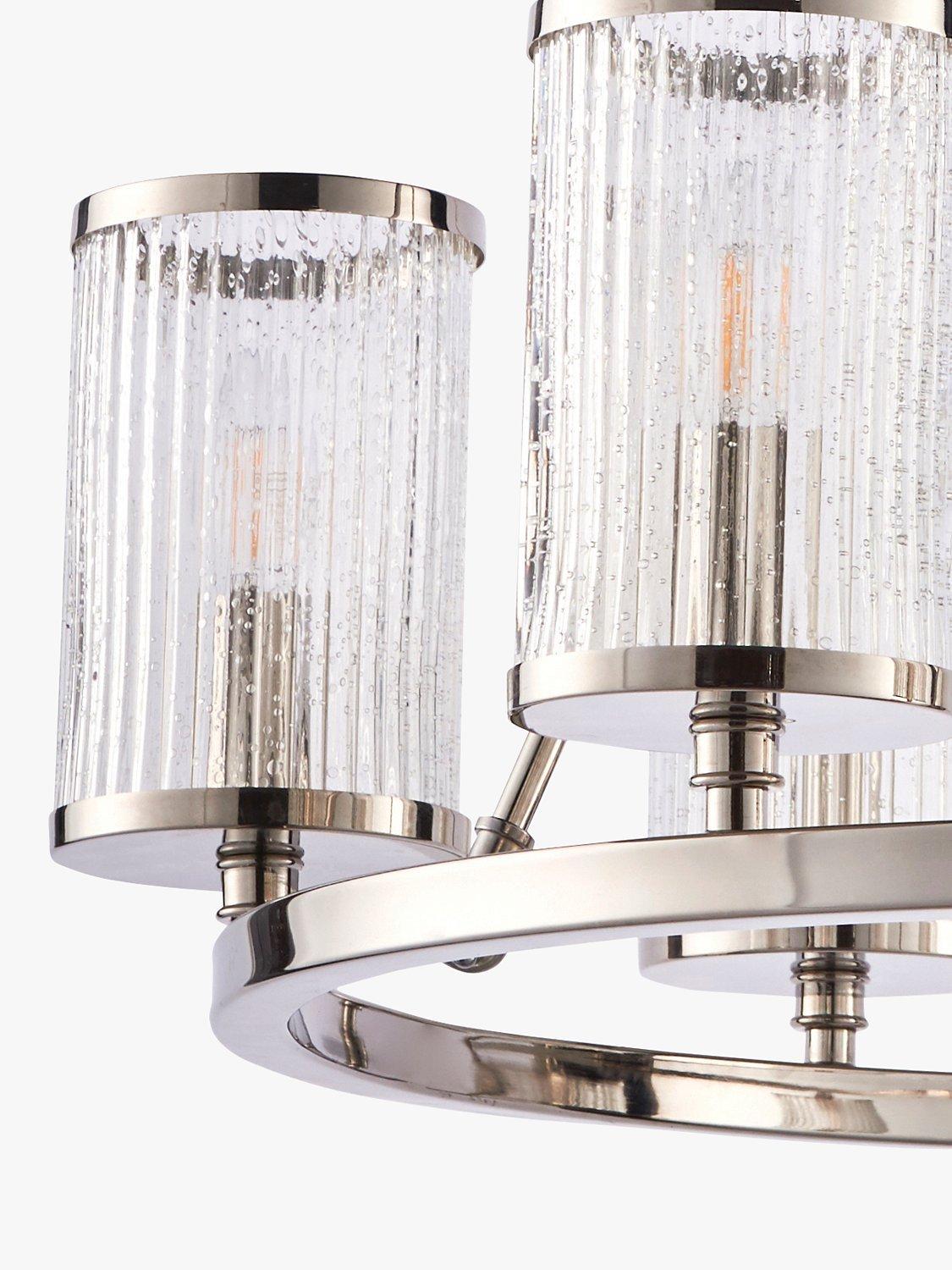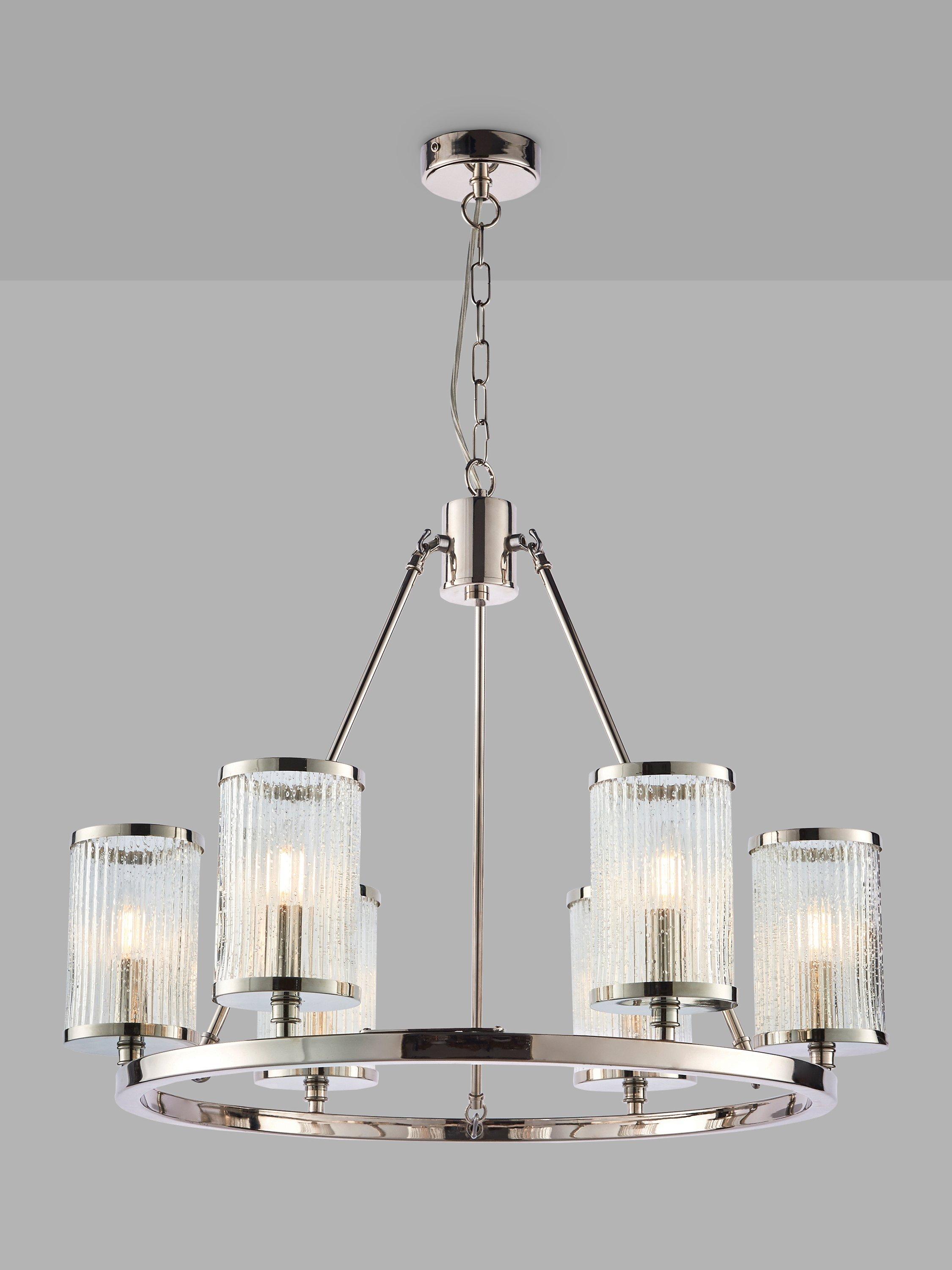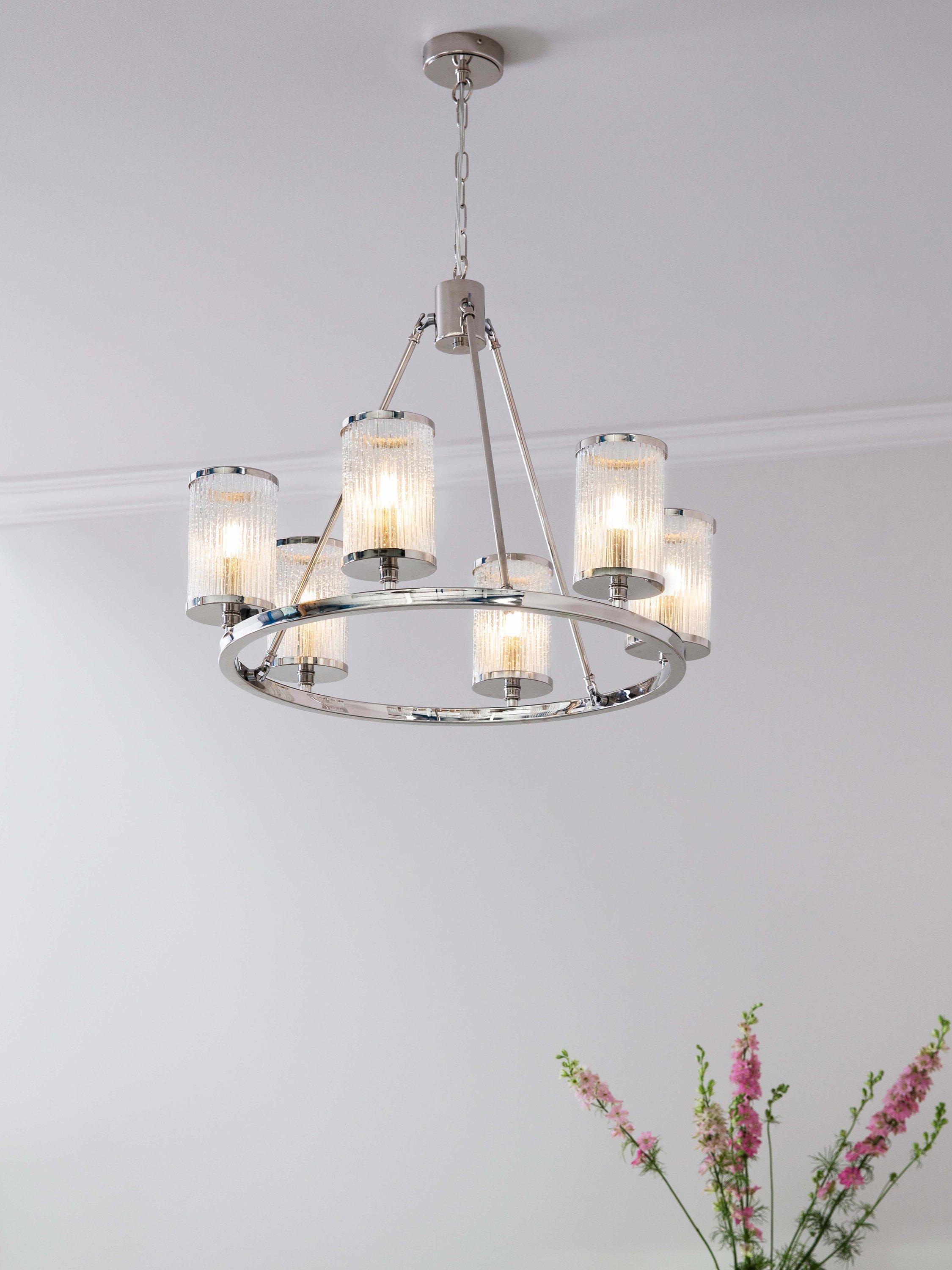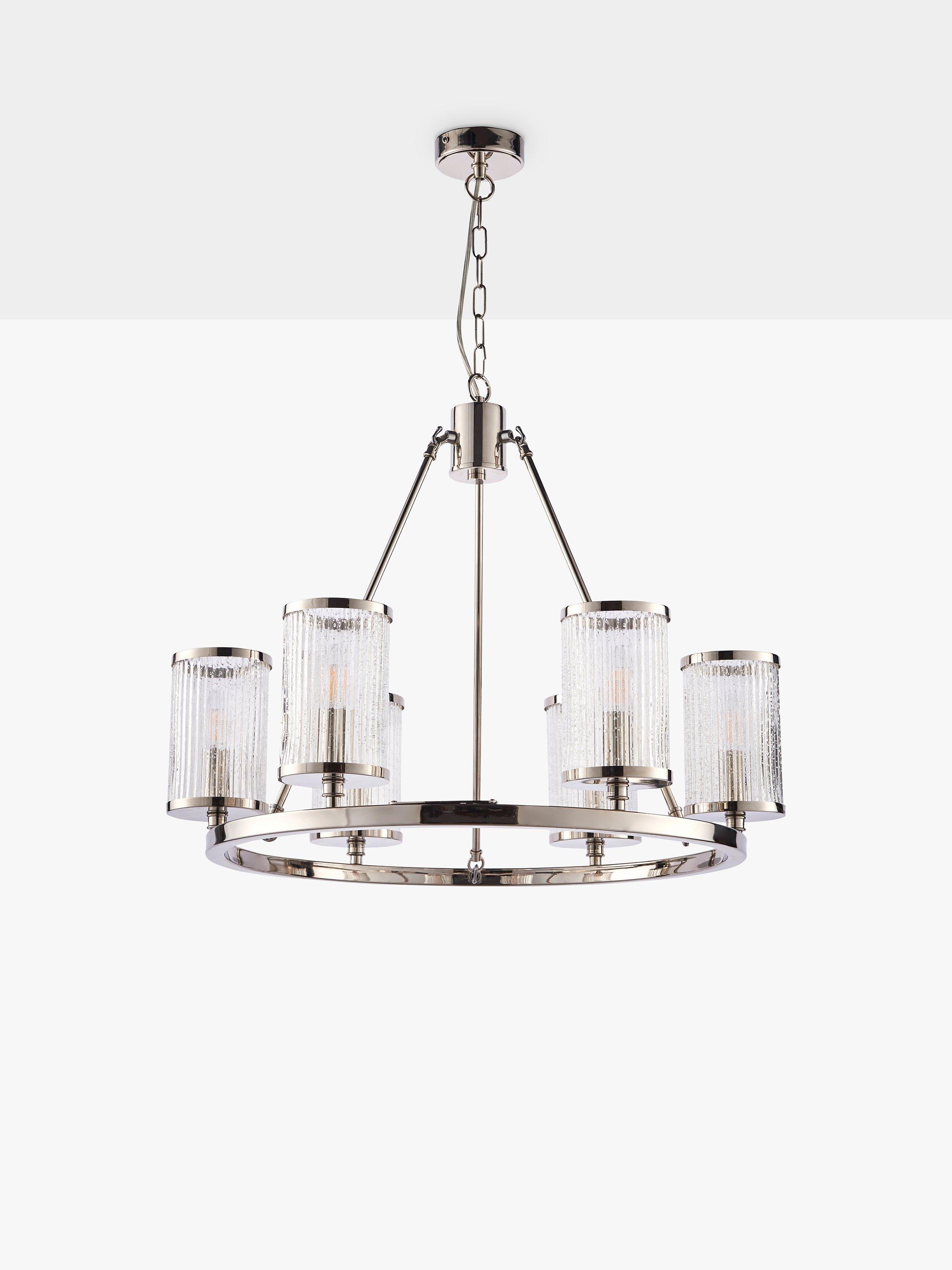 A modern take on a traditional chandelier, this ceiling fitting features six ribbed glass shades suspended around a metal hoop. Inspired by hurricane lamps, the shades are decorated with bubble detail that helps to create a diffused light effect when illuminated. The chain is height-adjustable for perfect positioning in your home.