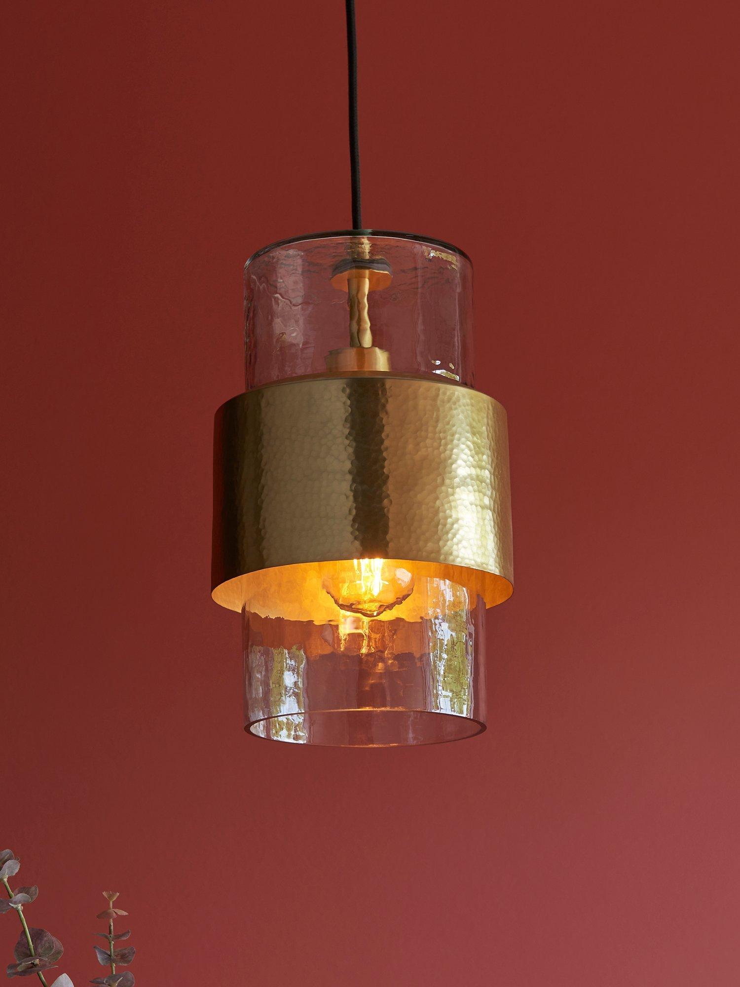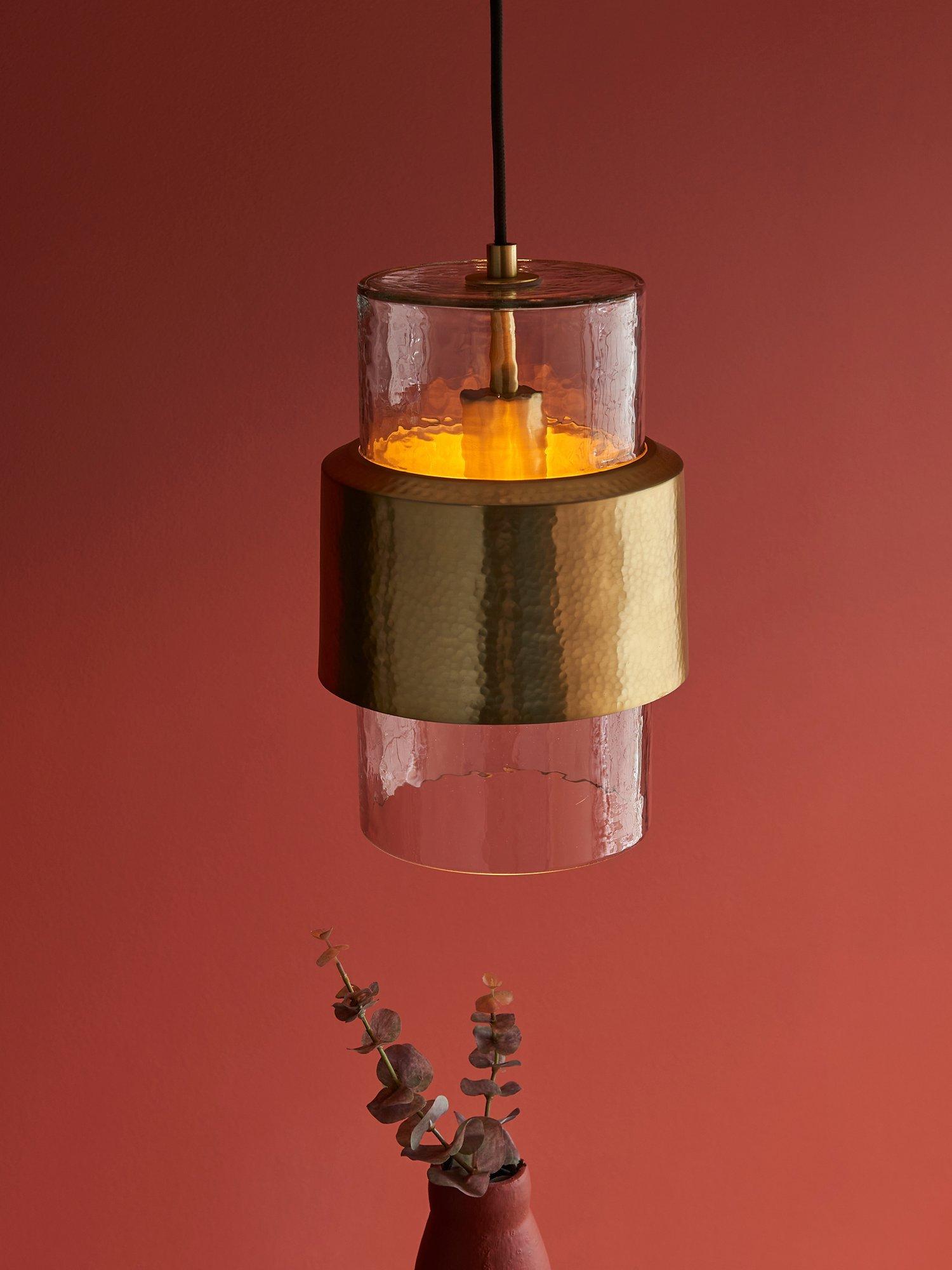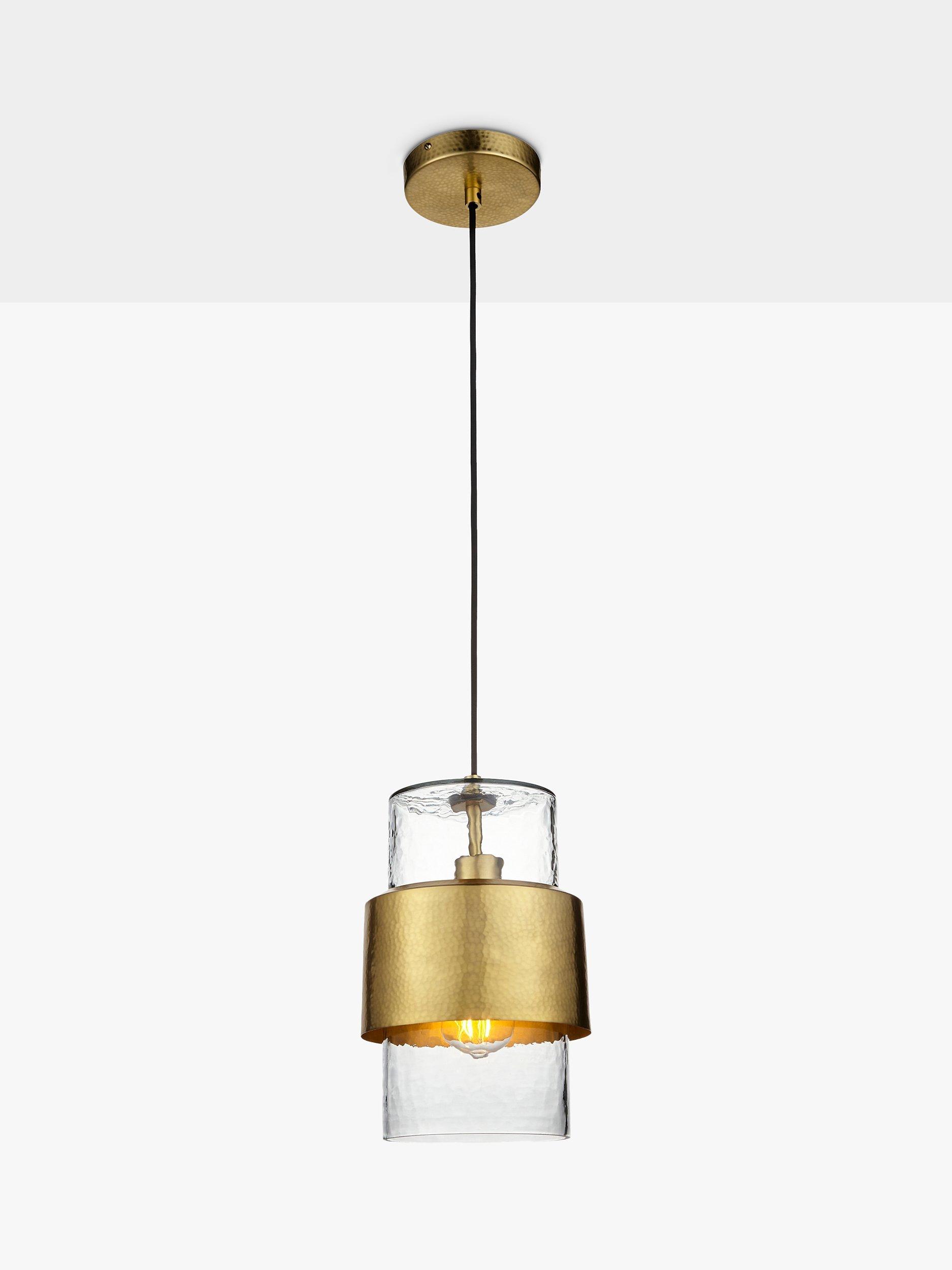 Go quirky with your lighting and find a home for this single bulb pendant. Made from handcrafted hammered metal and a textured glass shade. The black fabric cable gives a modern, sleek look to this fitting, making it ideal for a new look in a modern home.