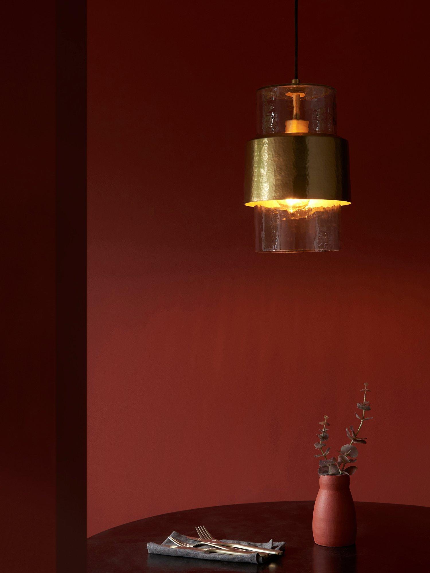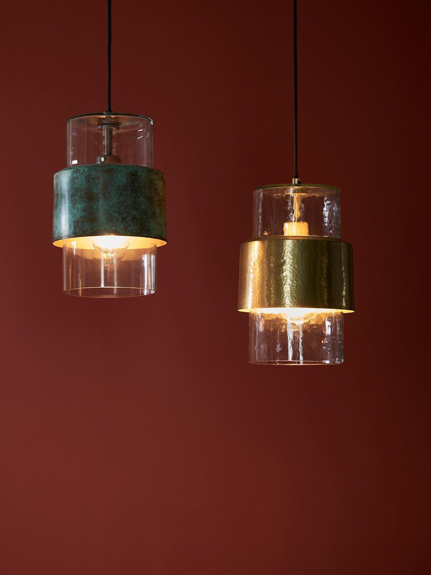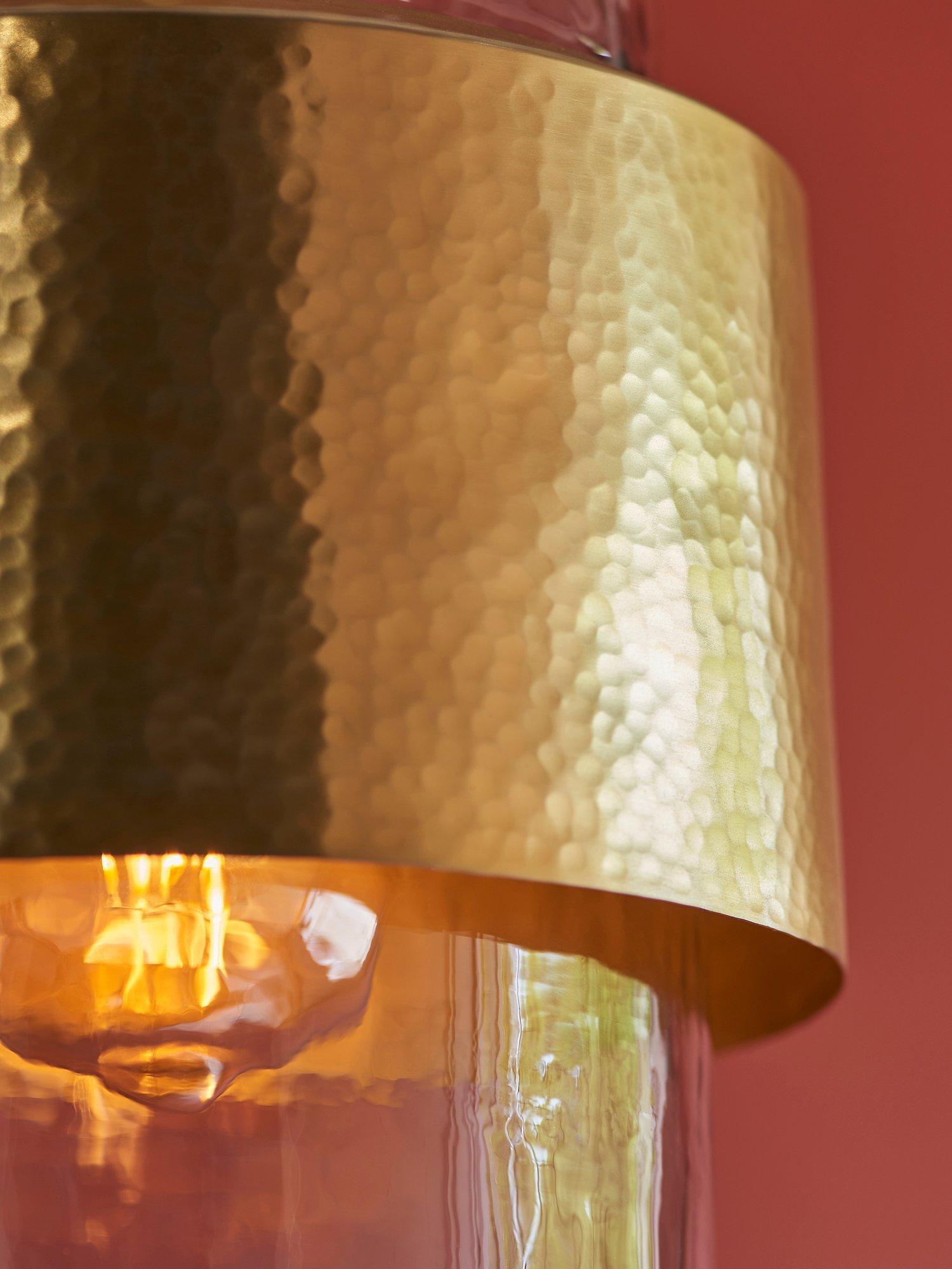 Go quirky with your lighting and find a home for this single bulb pendant. Made from handcrafted hammered metal and a textured glass shade. The black fabric cable gives a modern, sleek look to this fitting, making it ideal for a new look in a modern home.