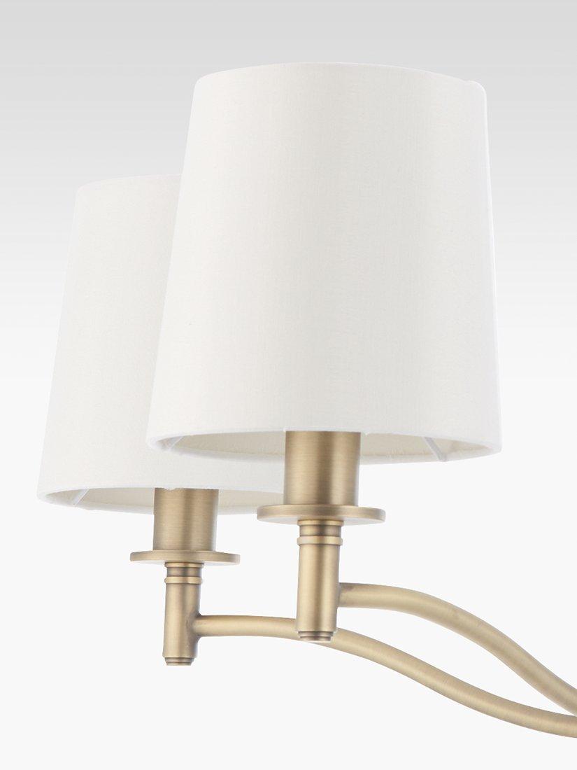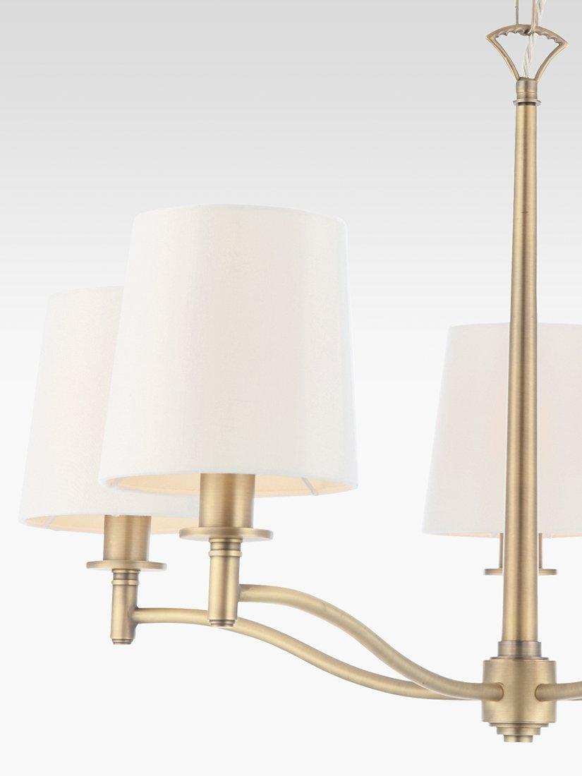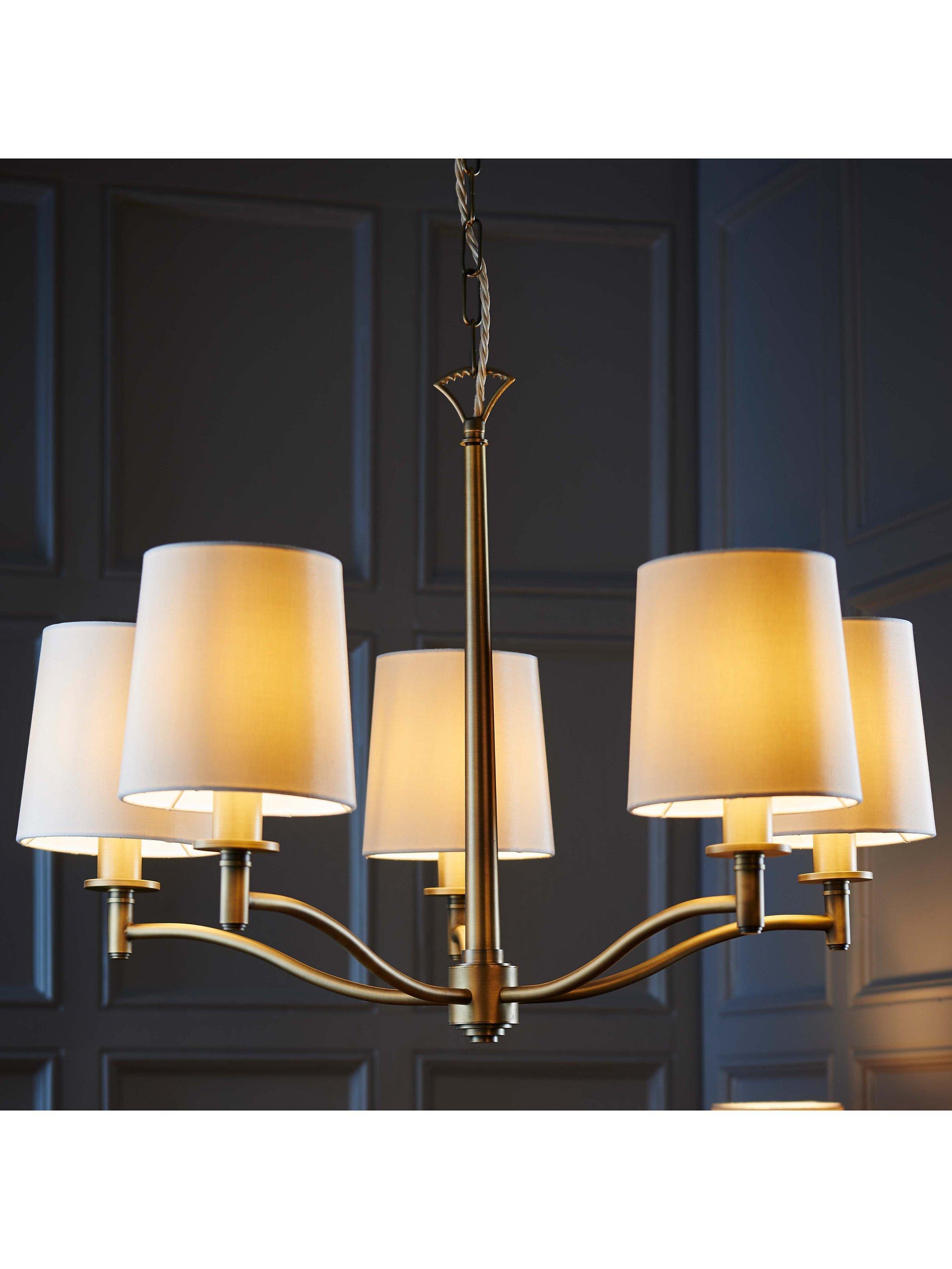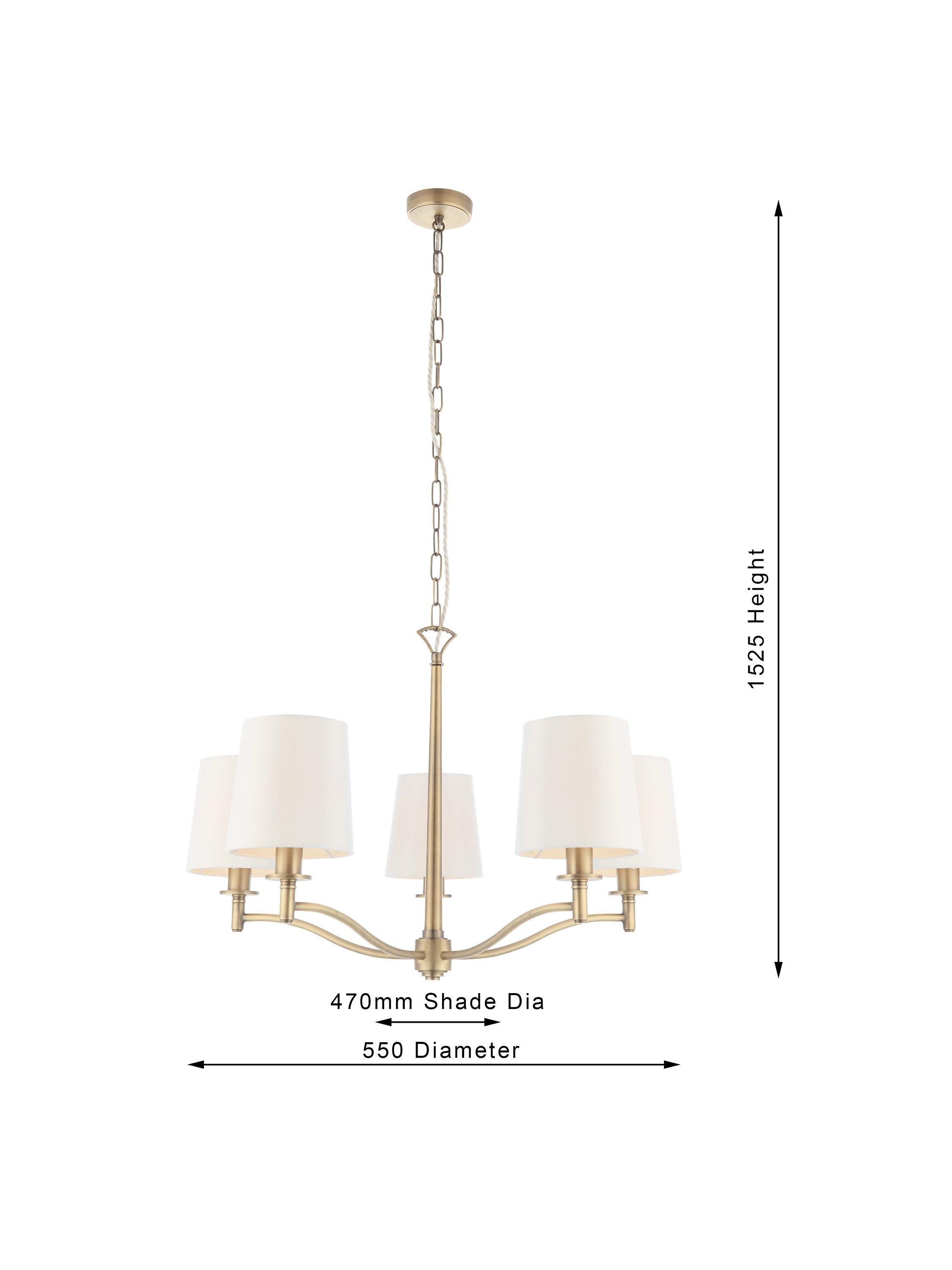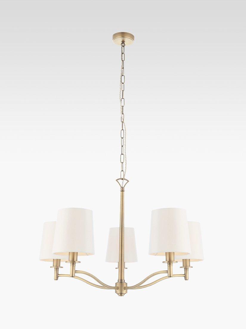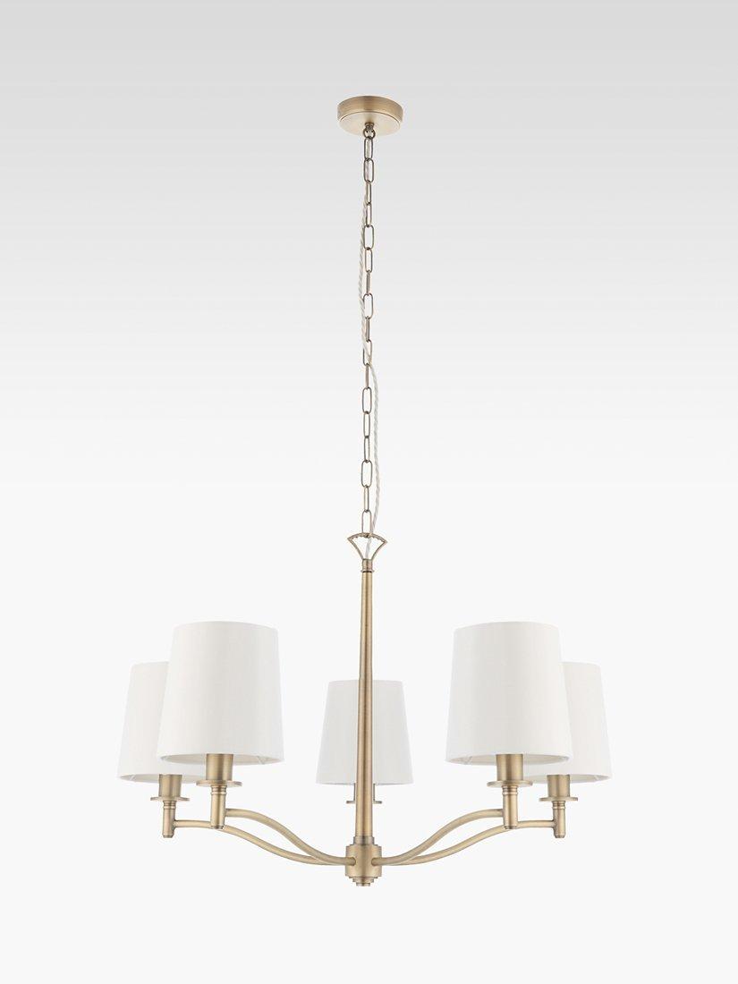 With a vintage design that incorporates five arms, this ceiling light is made from steel in a matt, antique brass effect. Each arm houses a faux silk lampshade to enhance a warm glow of light and the pendant is suspended form a height adjustable, link-chain cable.