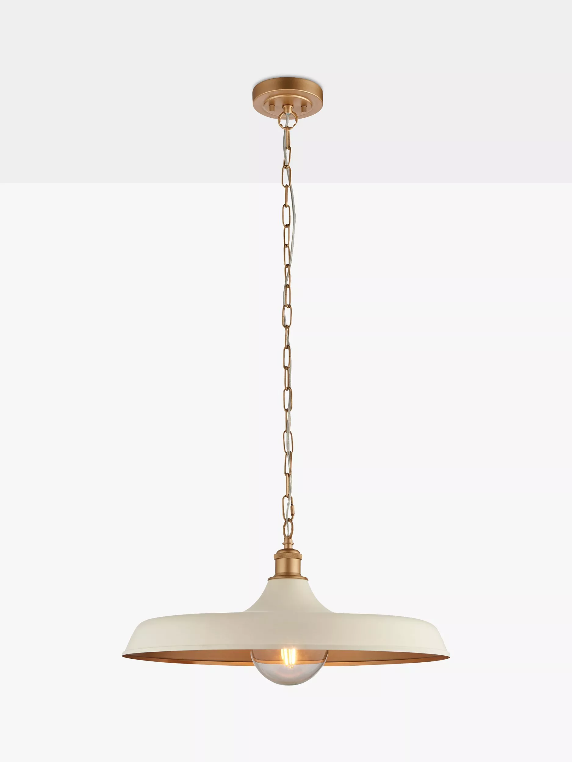 The ultimate contemporary lighting design comes in the form of this pendant. The satin brass detailing contrasts with the warm white finish metalwork to bring modern design and soft colours together. Hang above a kitchen island or dining table to cast a warm glow on to your evening.