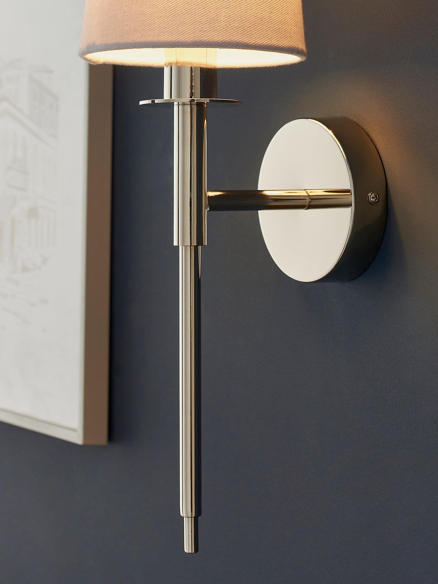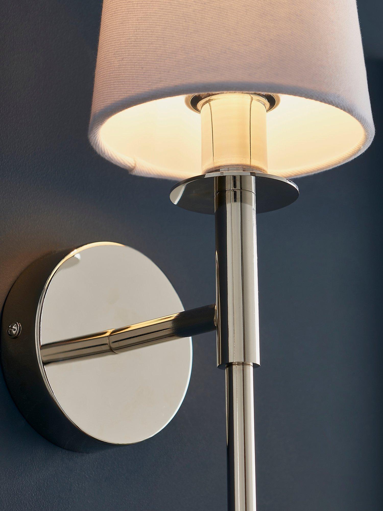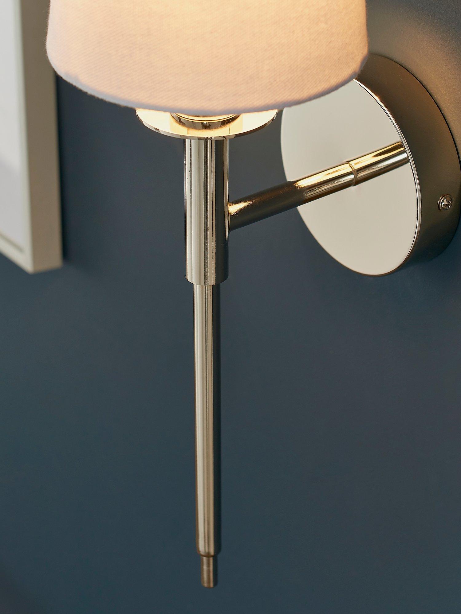 Modern and elegant with a long-line design, this minimalist wall light adds subtle light to a hallway or living room. The nickel-plated metalwork and white cotton fabric shade are a traditional and timeless pairing to suit most decor.