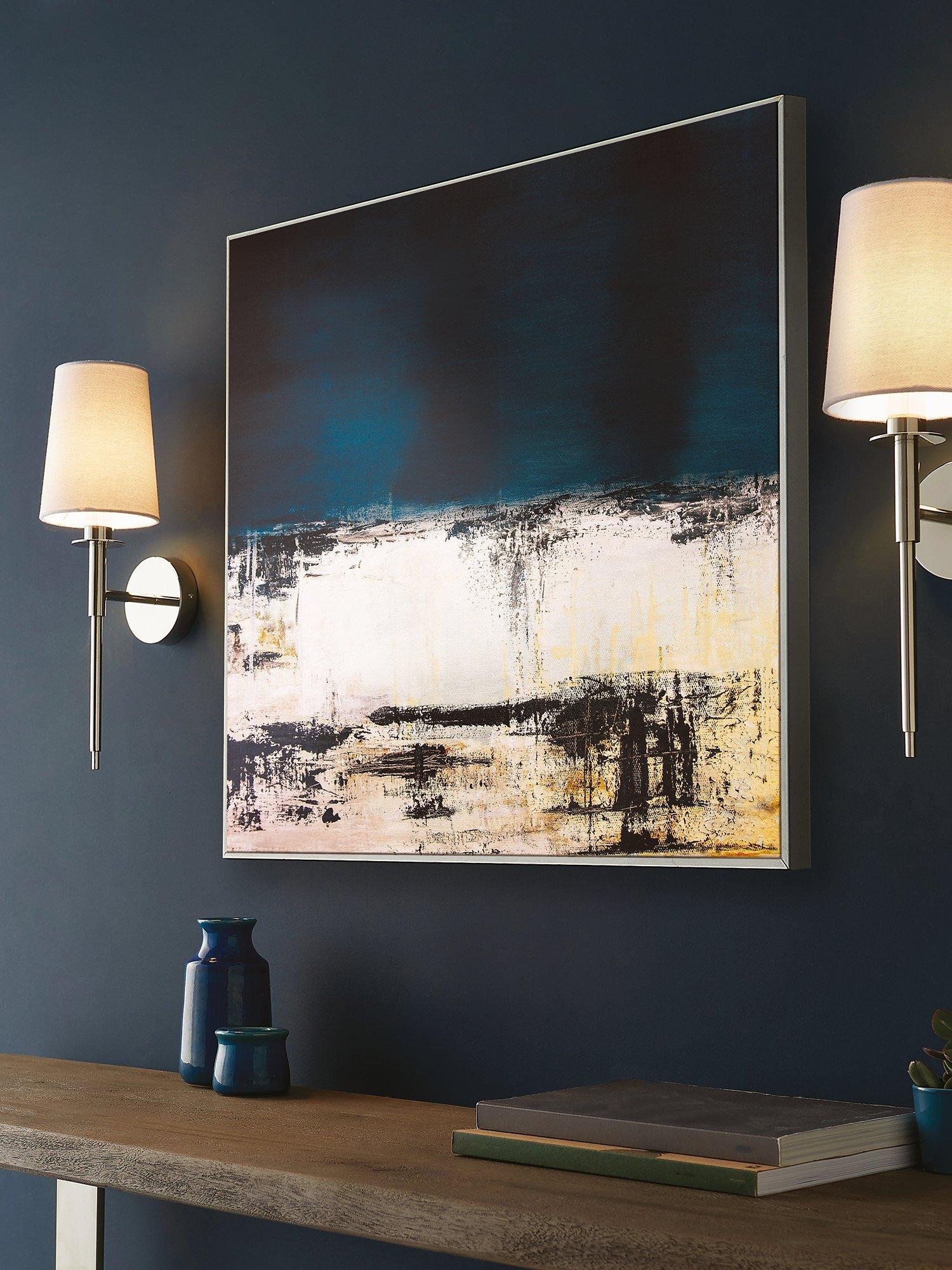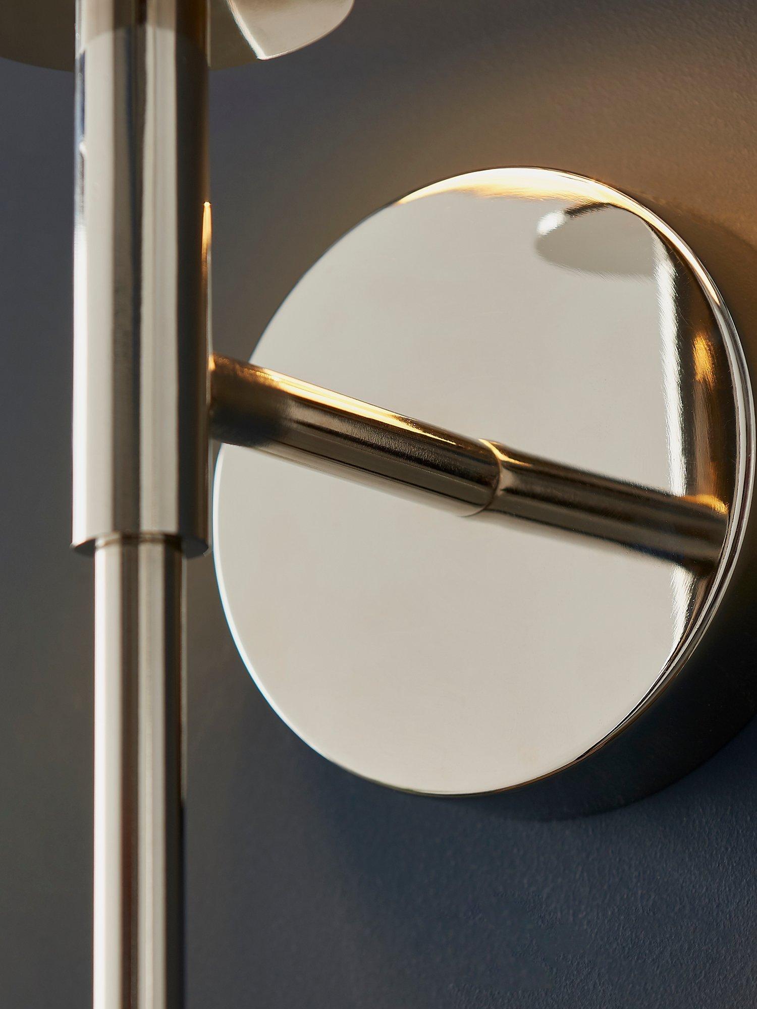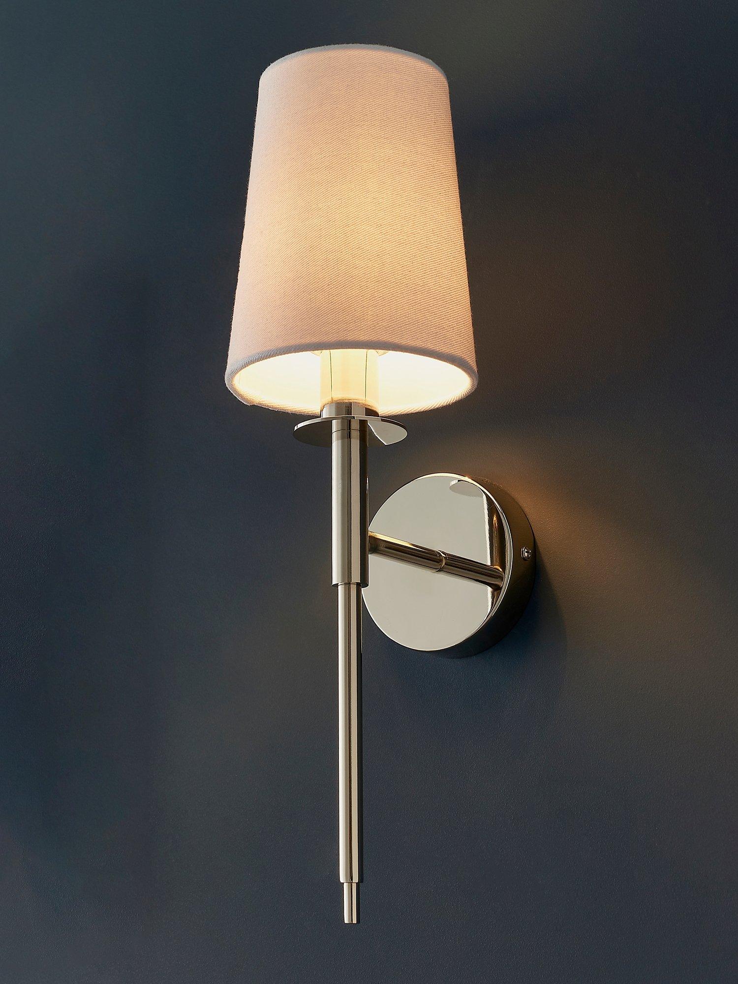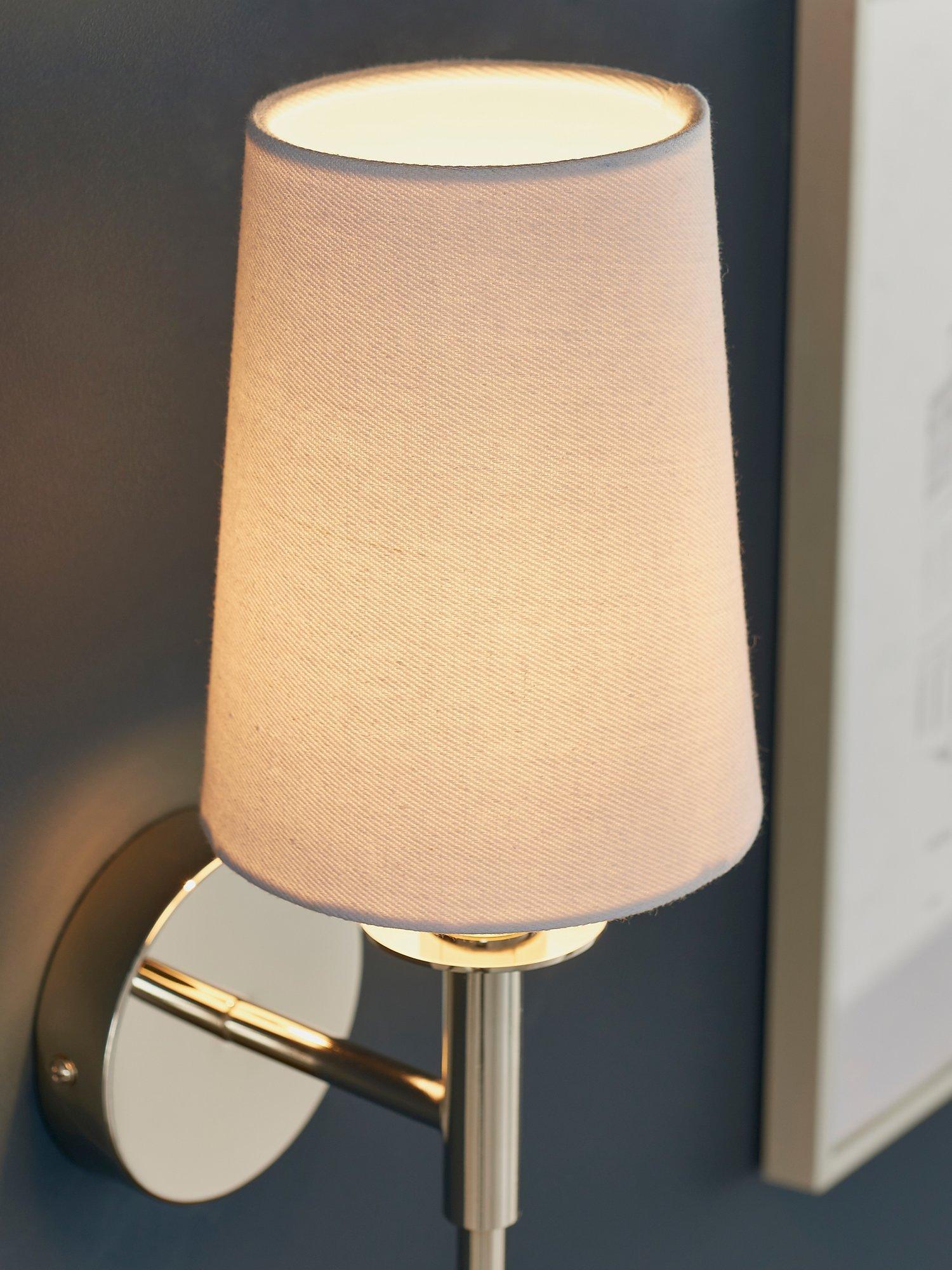 Modern and elegant with a long-line design, this minimalist wall light adds subtle light to a hallway or living room. The nickel-plated metalwork and white cotton fabric shade are a traditional and timeless pairing to suit most decor.