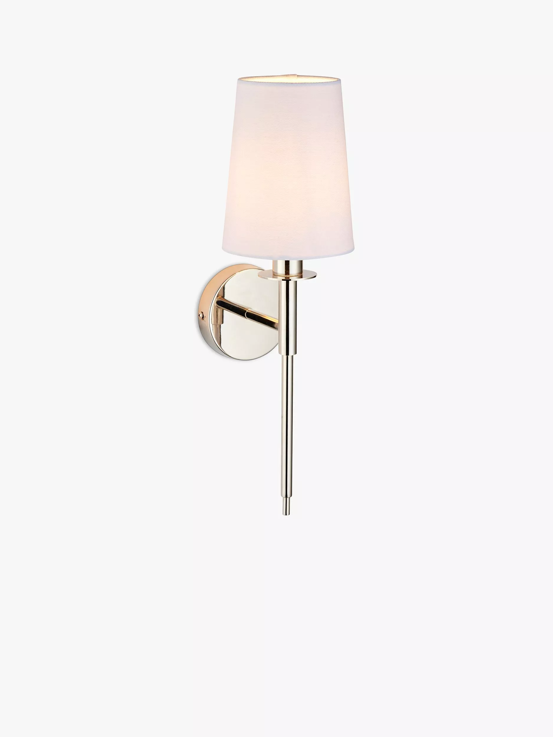 Modern and elegant with a long-line design, this minimalist wall light adds subtle light to a hallway or living room. The nickel-plated metalwork and white cotton fabric shade are a traditional and timeless pairing to suit most decor.