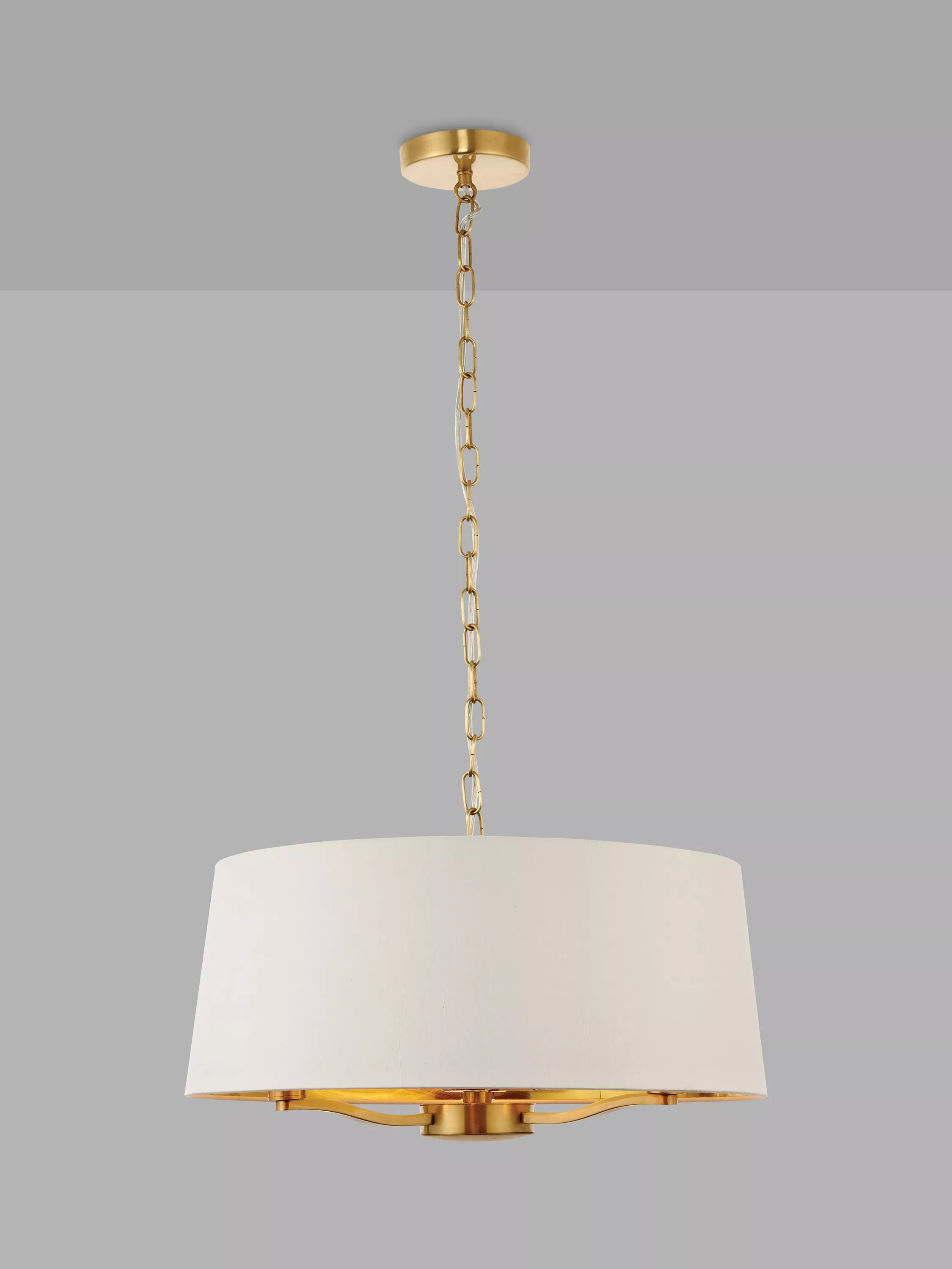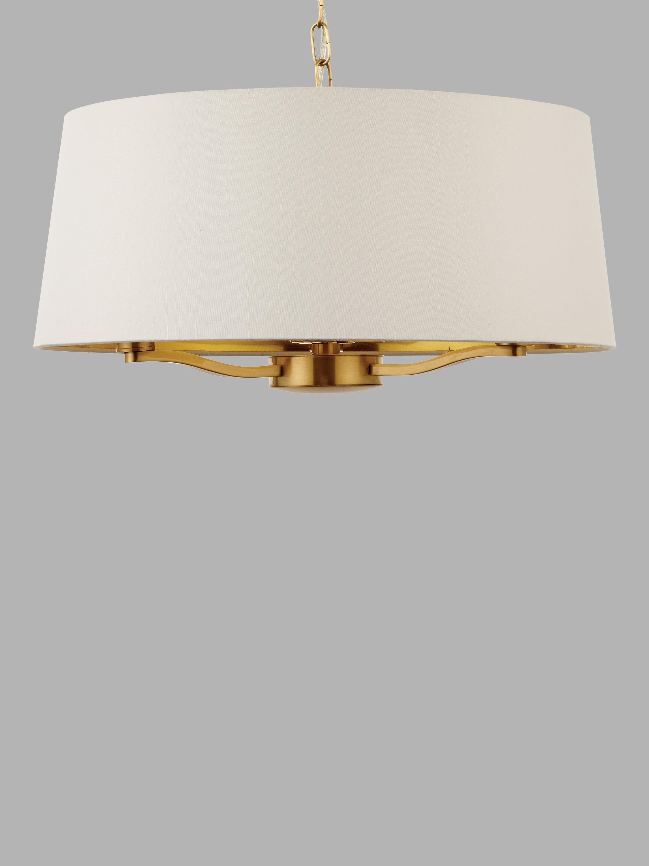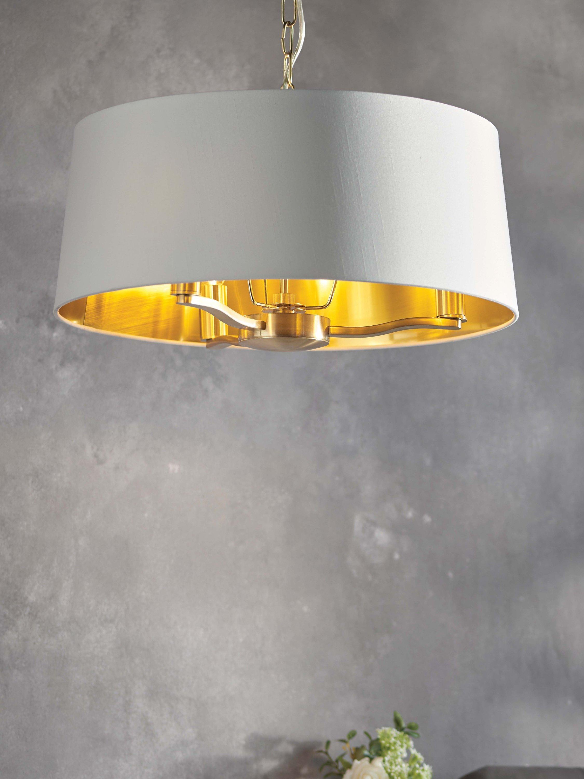 This ceiling light has a vintage look that lends itself well to chic, boutique hotel inspired interiors. It's made from metal in a brushed metallic finish and complemented with a tapered lampshade made from a faux silk fabric. The lampshade has a metallic gold lining which helps to reflect the light and enhance a warm and inviting glow. Plus, it's suspended from a height-adjustable chain so you can install it to your exact requirements.