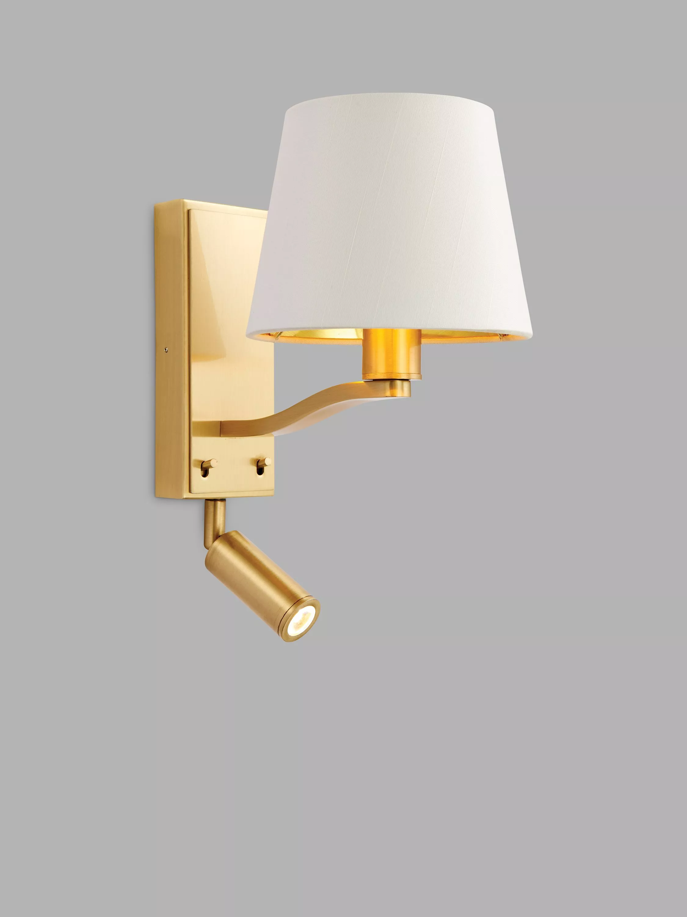 This clever two-in-one wall light features a traditional single arm fitting, as well as a reading spotlight with an integrated LED. A brilliant option in bedrooms or living spaces, it's made from sturdy metal in a satin finish and features handy toggle switches to operate each light. A tapered drum shade is attached to the wall arm made from a faux silk fabric. This light is perfect if you're trying to curate a sophisticated, boutique hotel look at home. You'll need to get a bulb for the single arm fitting but the reading spotlight is integrated.