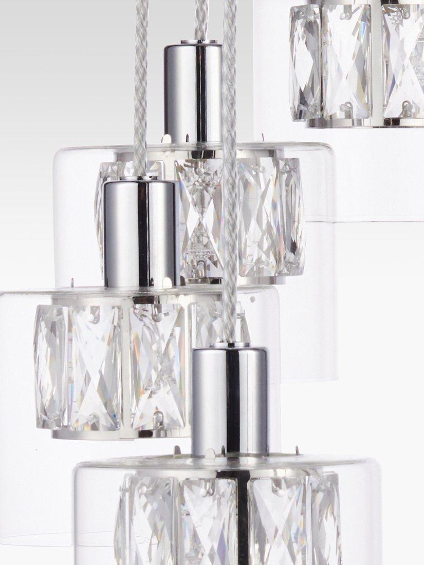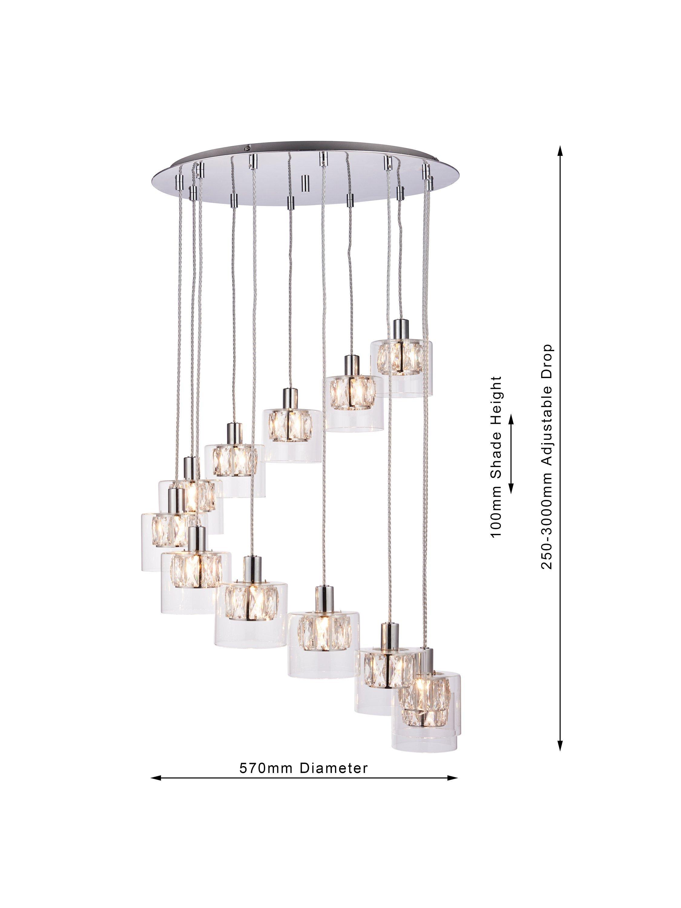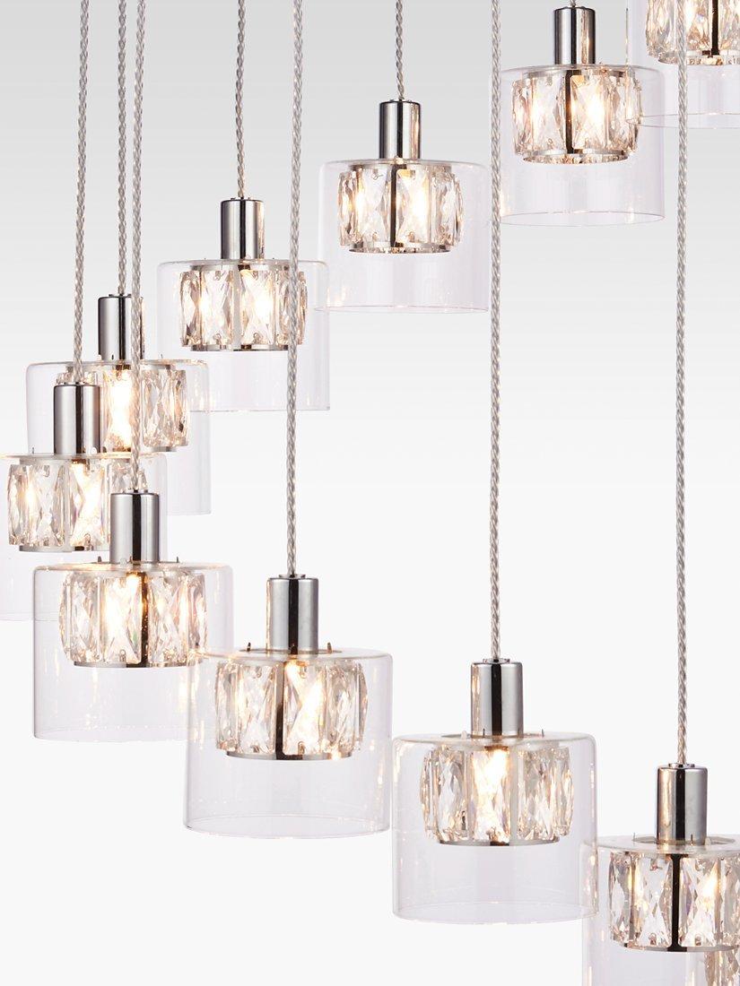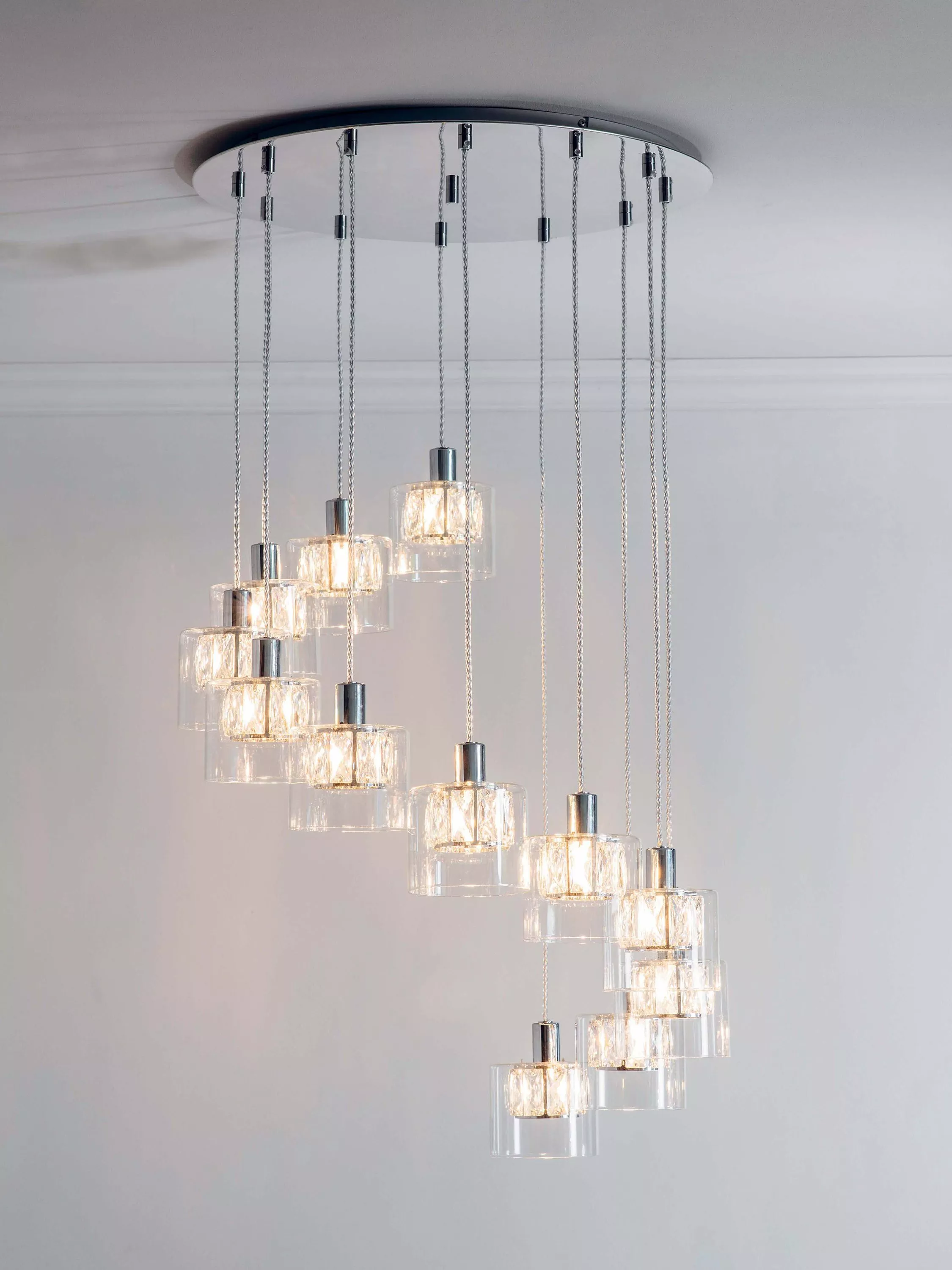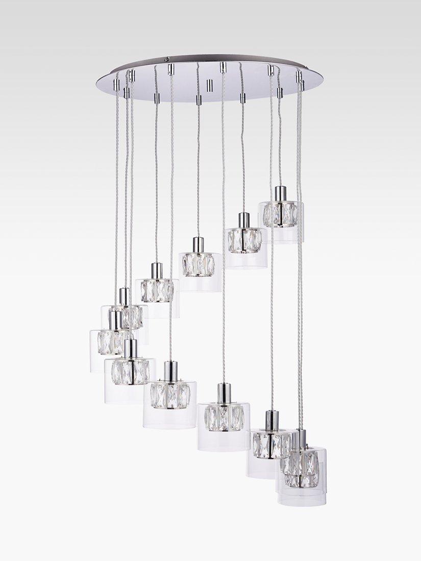 12 dazzling pendants are suspended in a curved formation on this decorative ceiling light. Each pendant is made from a small crystal shade encased within a larger glass shade that diffuses the light and enhances a warm glow. They're also suspended from height-adjustable cables made from clear plastic.
