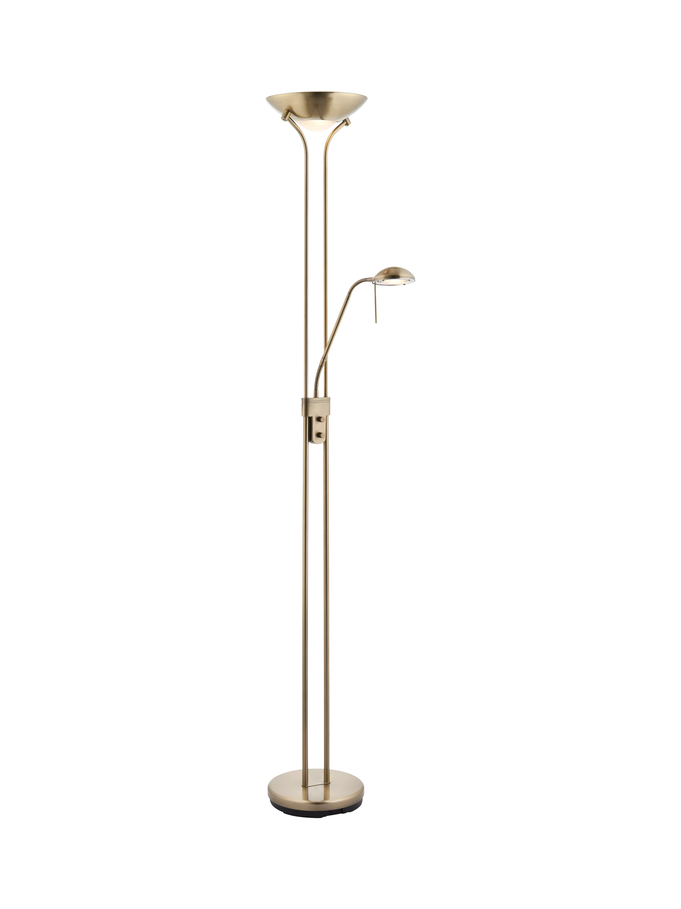 A tall two-light floor lamp with a double stand supporting an uplighter as well as an adjustable branch holding a reading lamp. Designed in modern metalwork with an opal glass diffuser, complete with an easy-to-reach double rotary dimmer switch. Compatible for use with LED and halogen bulbs.