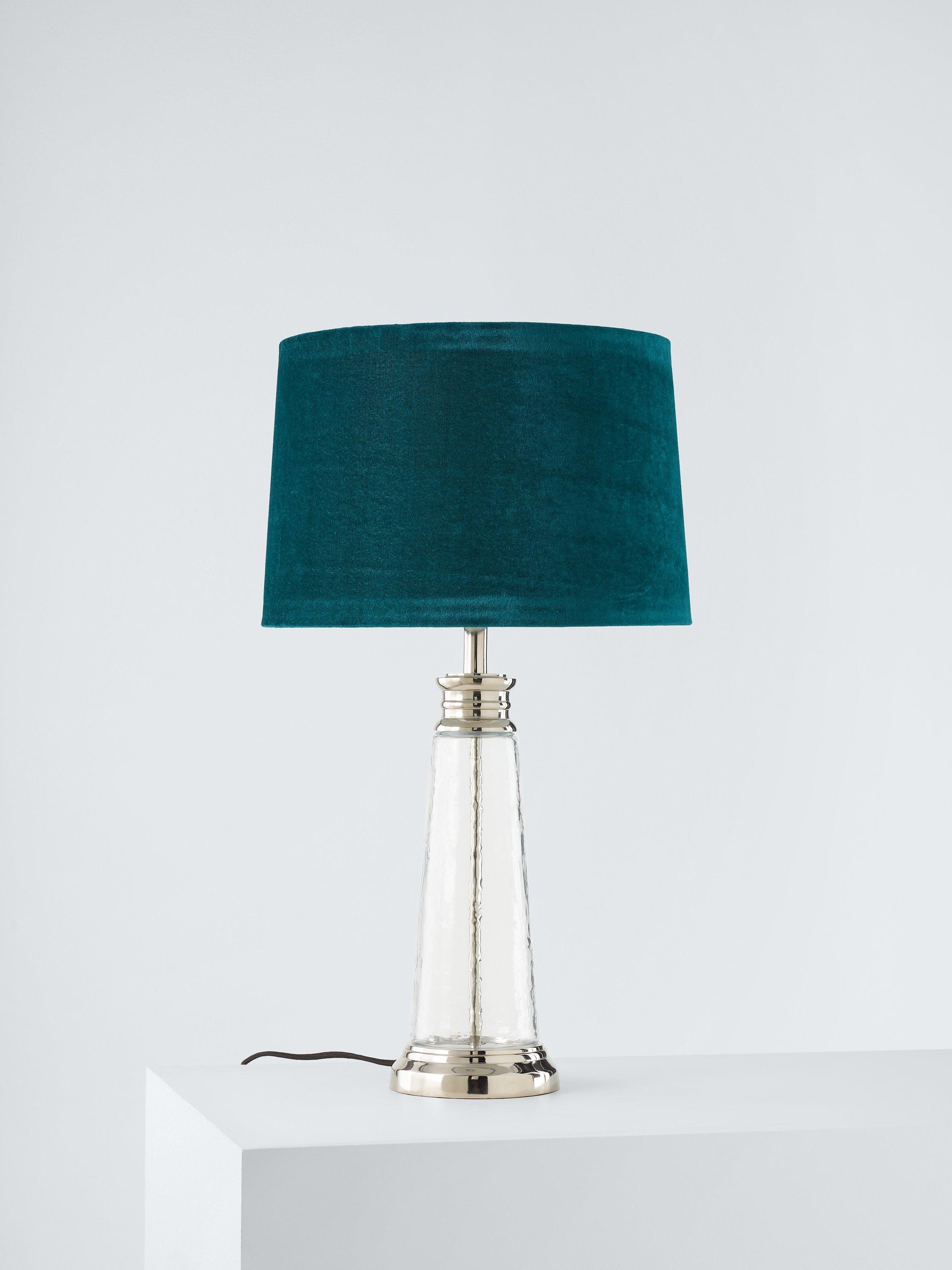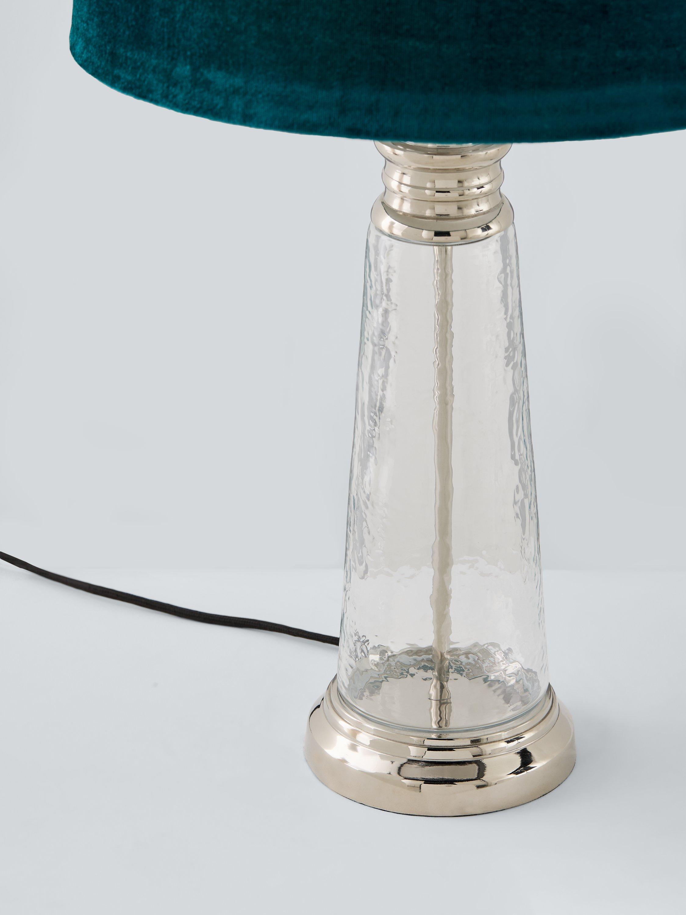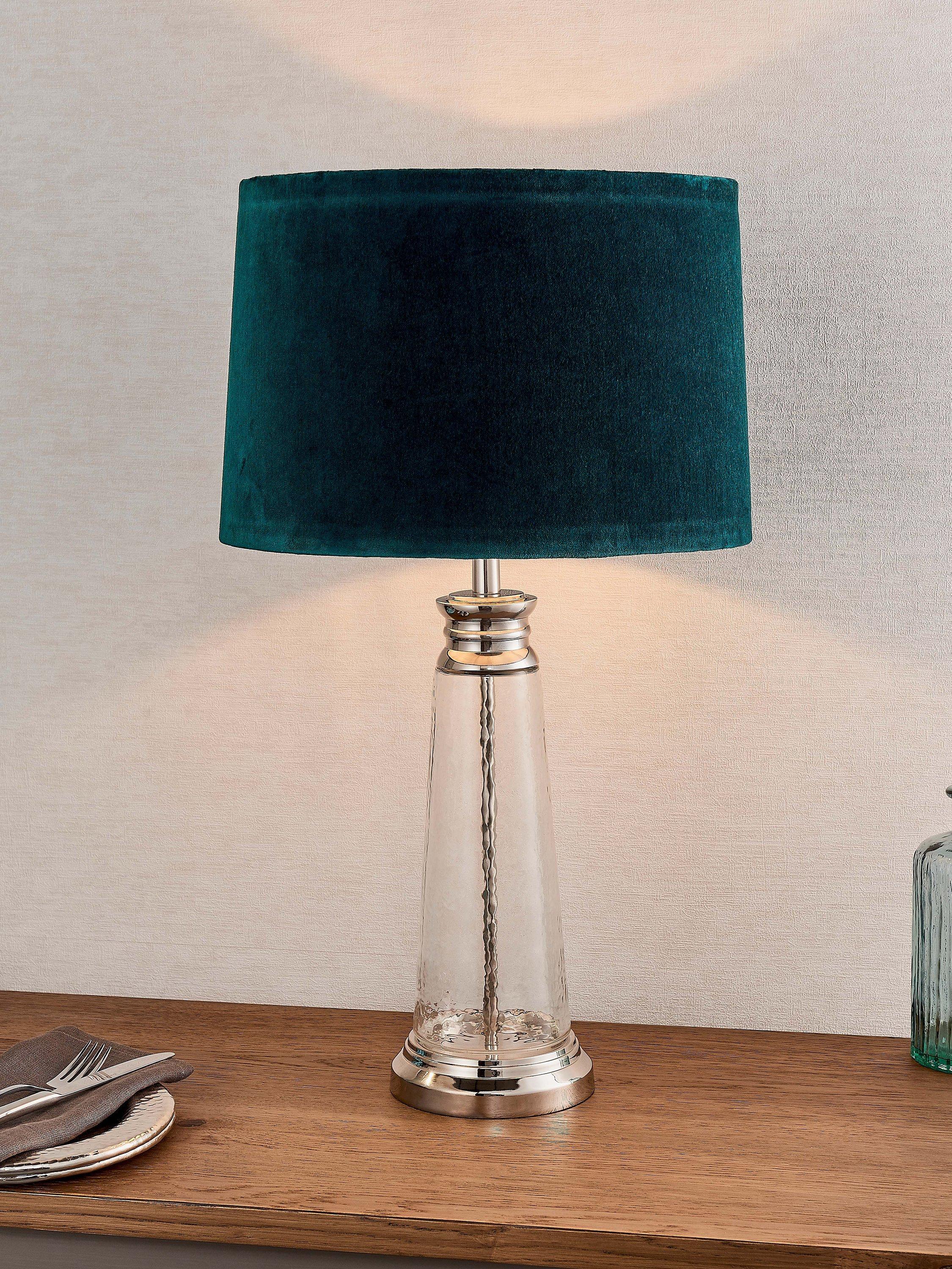 With a tactile finish, the base of this table lamp is made from clear hammered glass and metal hardware. Easy to style in a host of interior schemes, it's paired with a velvet lampshade to offer a warm glow of light.