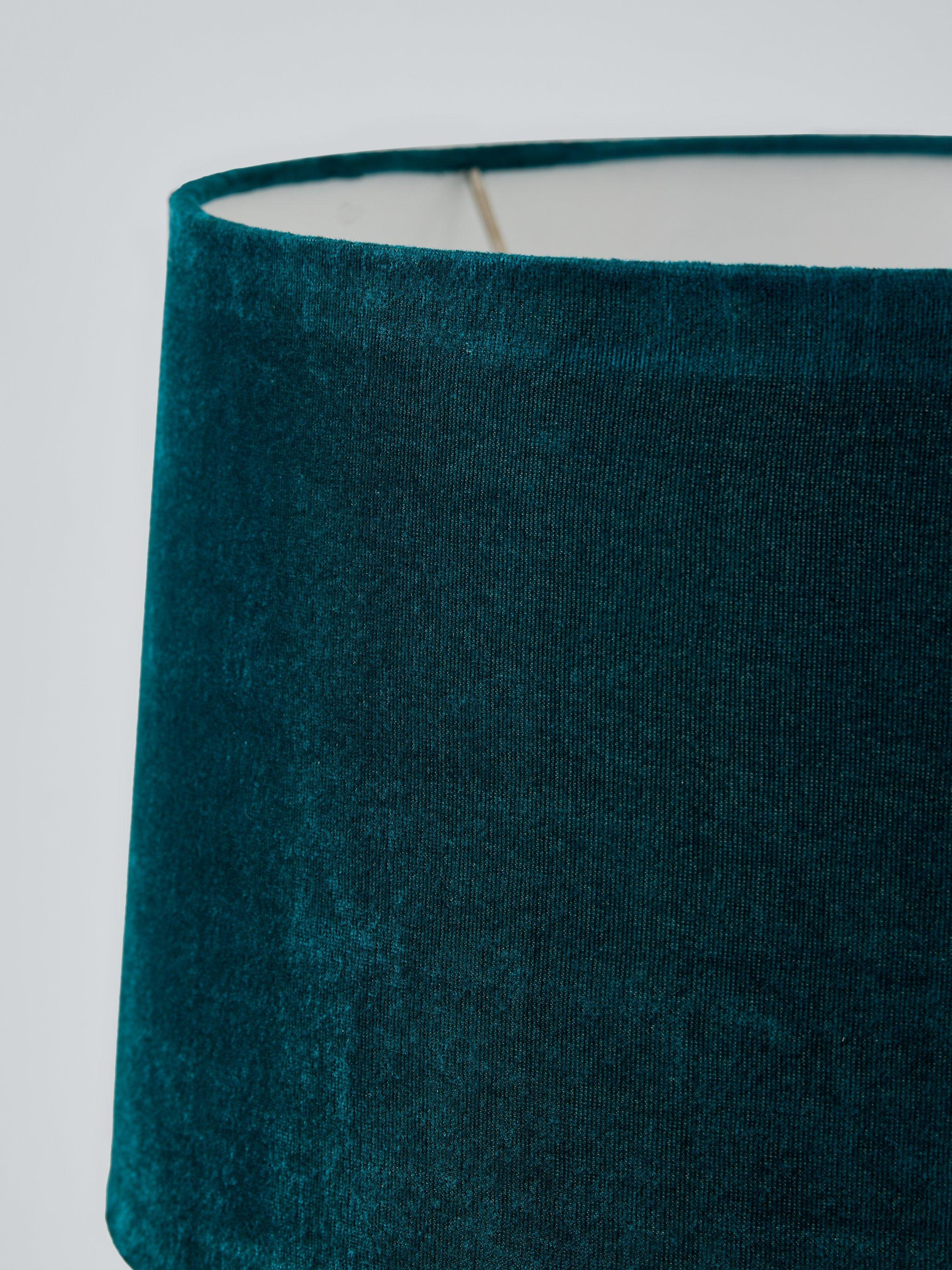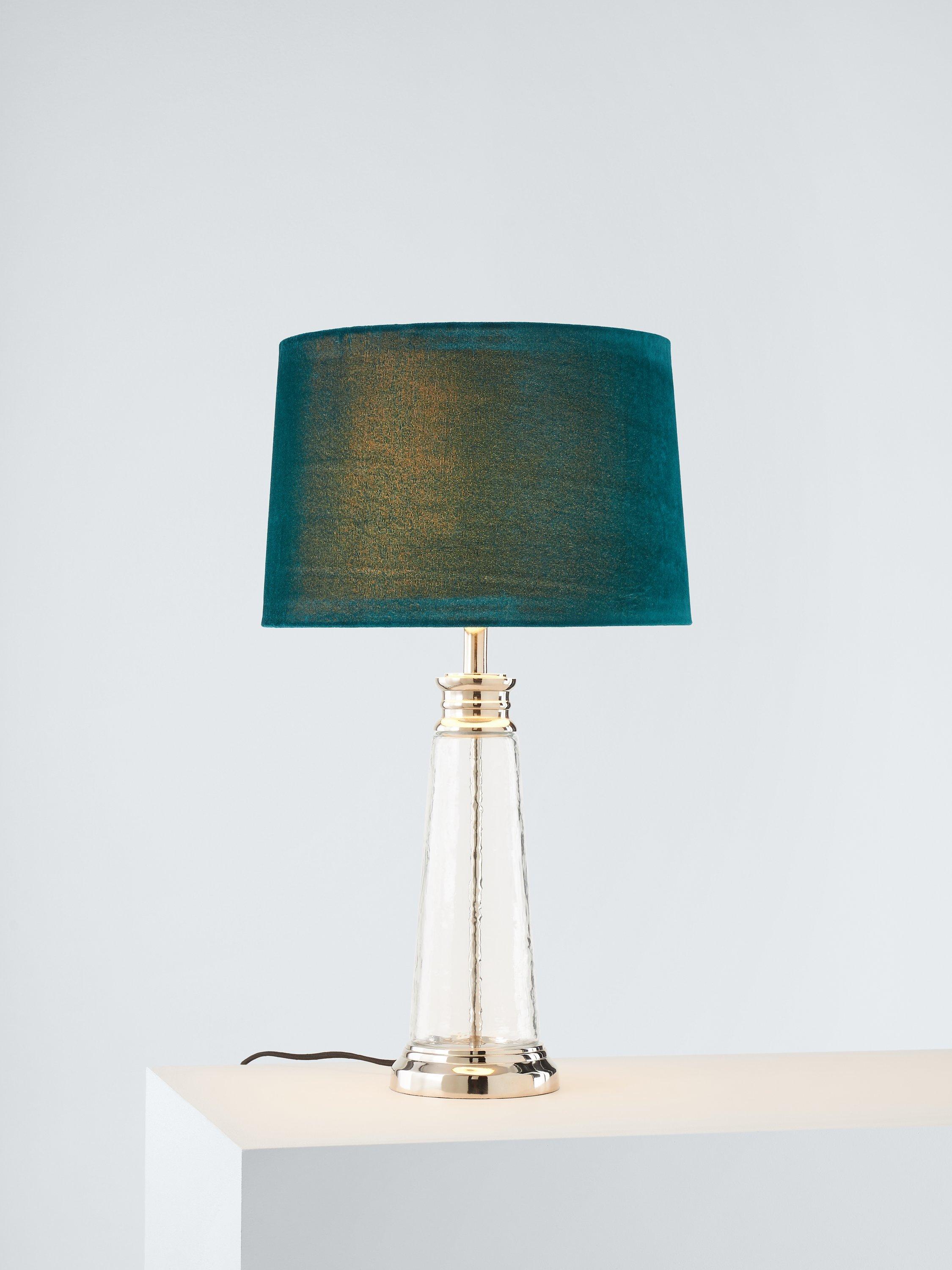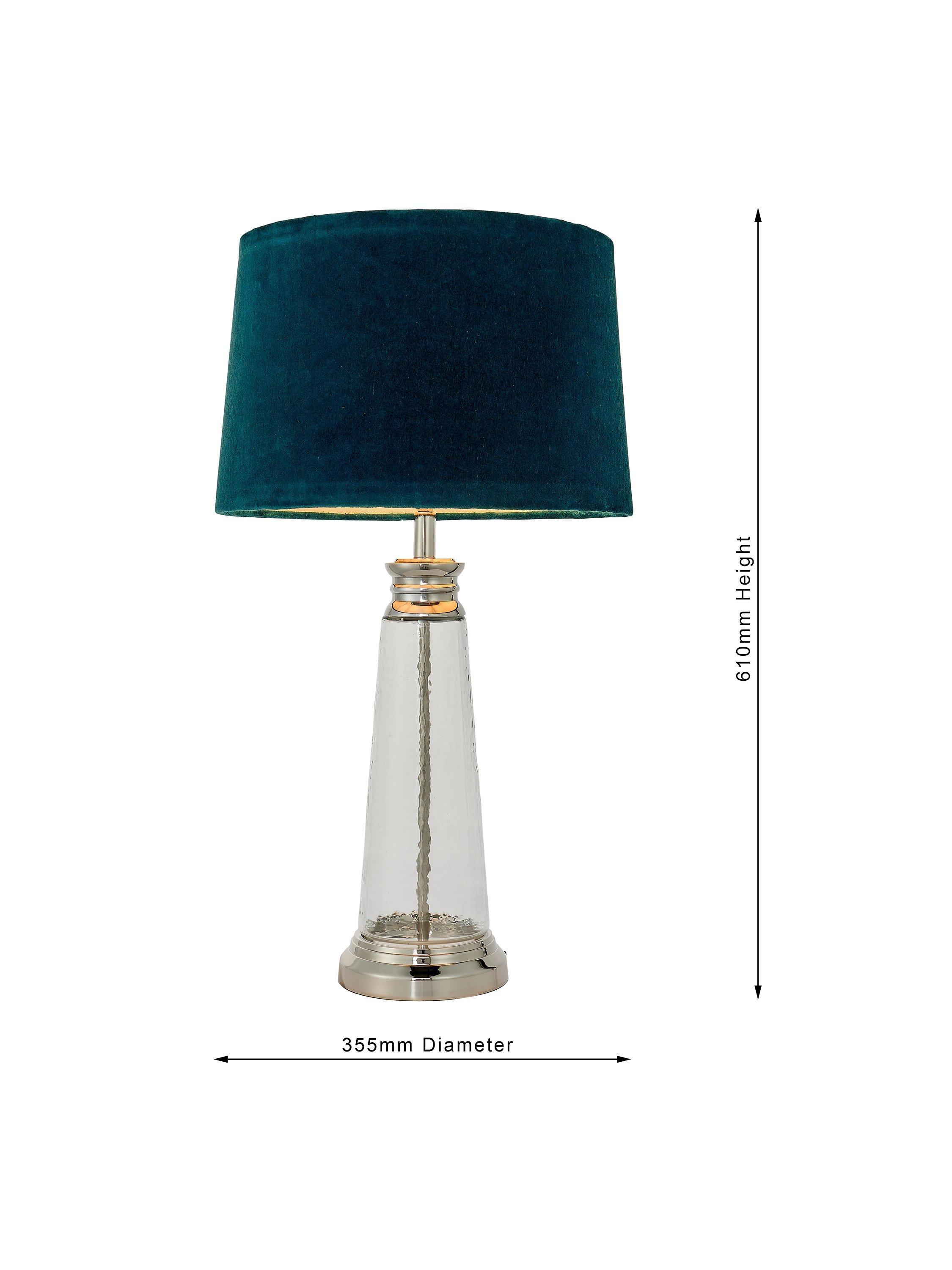 With a tactile finish, the base of this table lamp is made from clear hammered glass and metal hardware. Easy to style in a host of interior schemes, it's paired with a velvet lampshade to offer a warm glow of light.