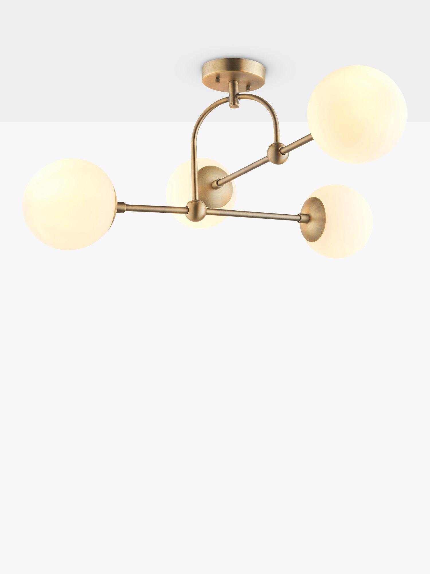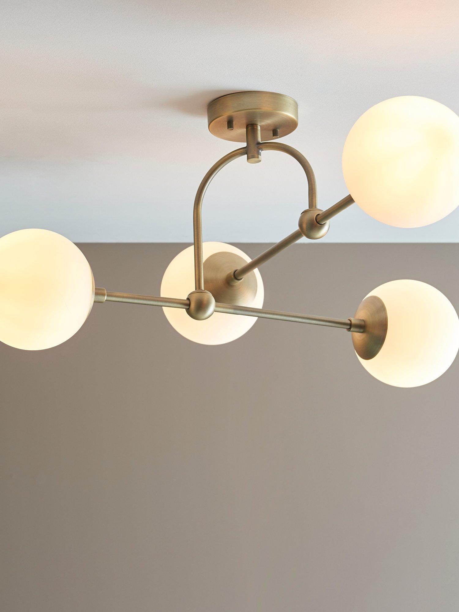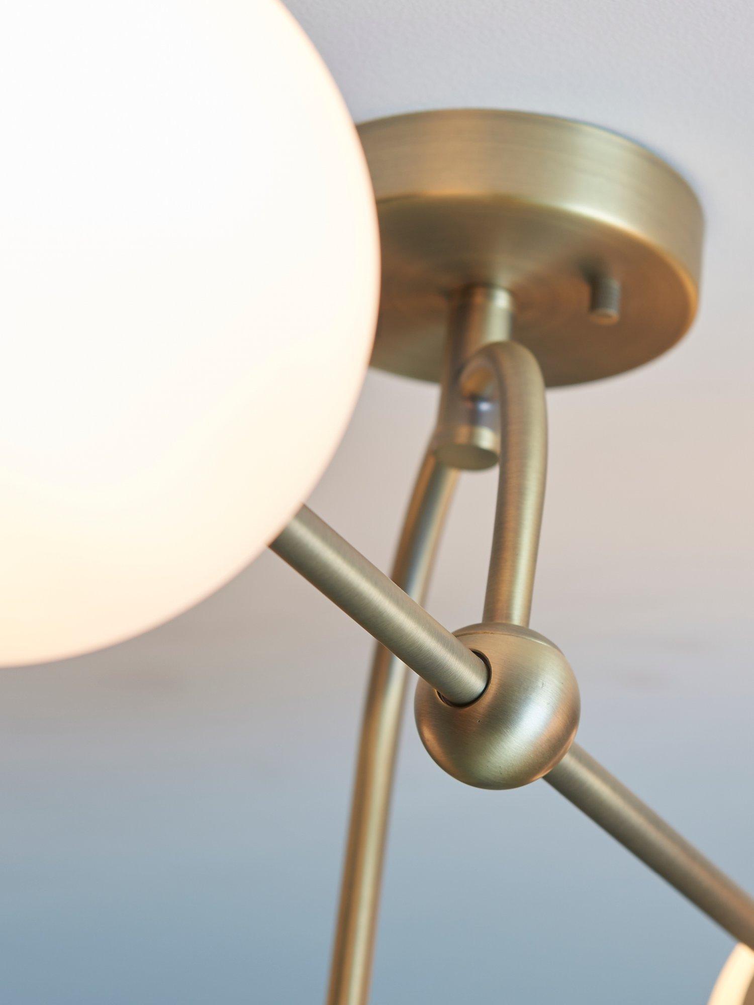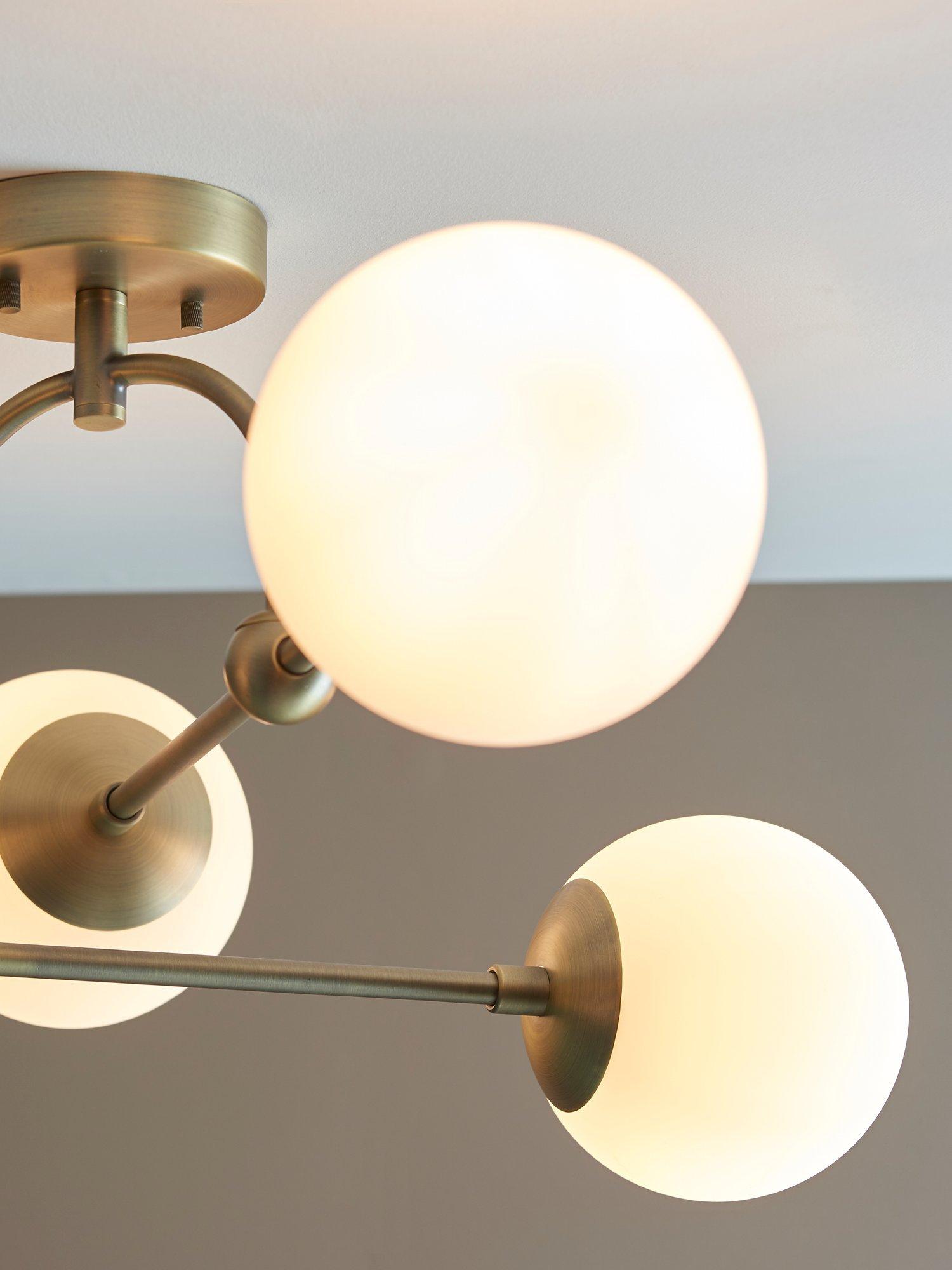 Make mid-century a style in your home with this chic ceiling light. Modernised with opal glass shades yet keeping traditional with antique brass metalwork, this on trend dimmable light will create a warm and welcoming atmosphere for dining and socialising.