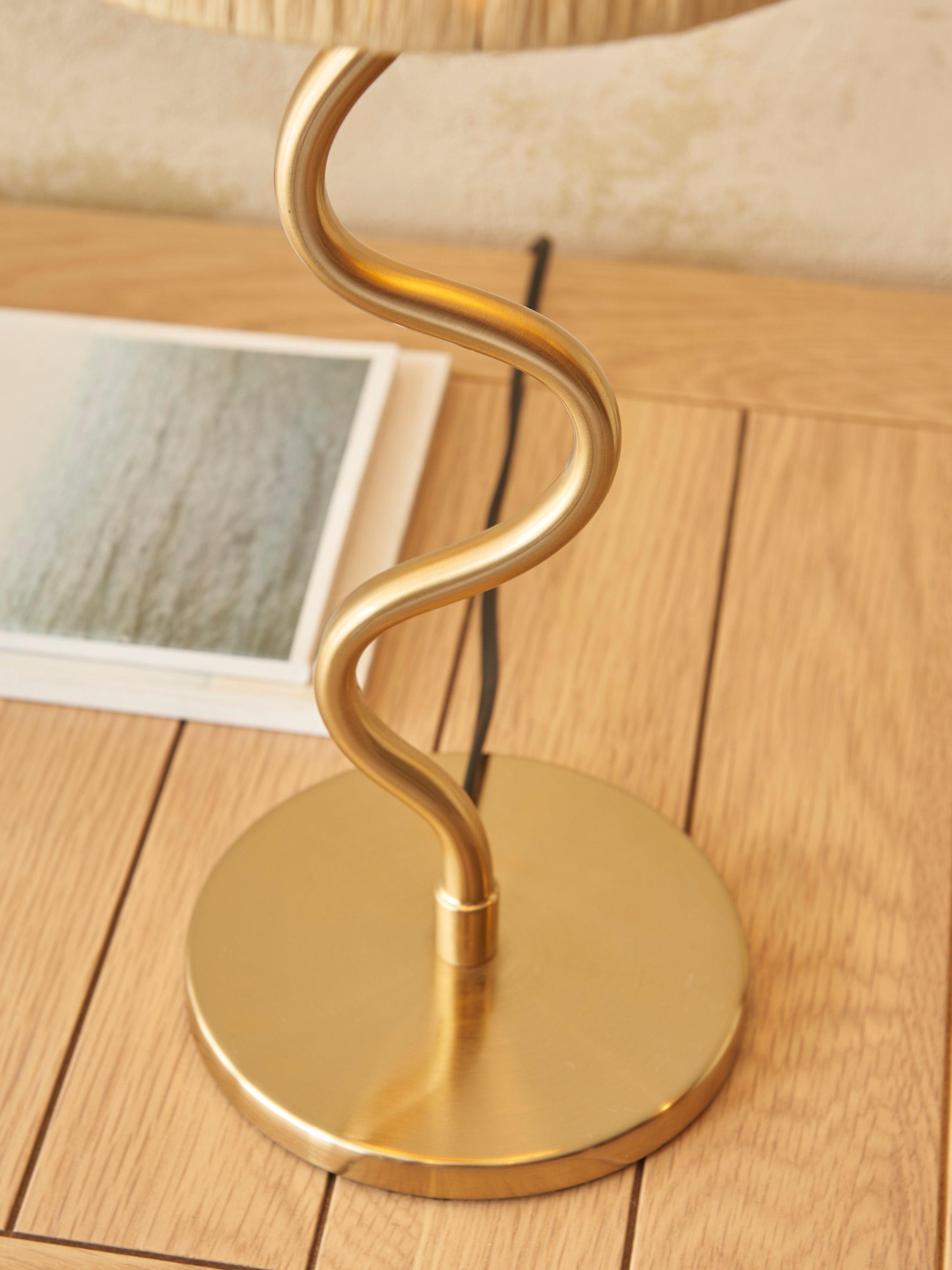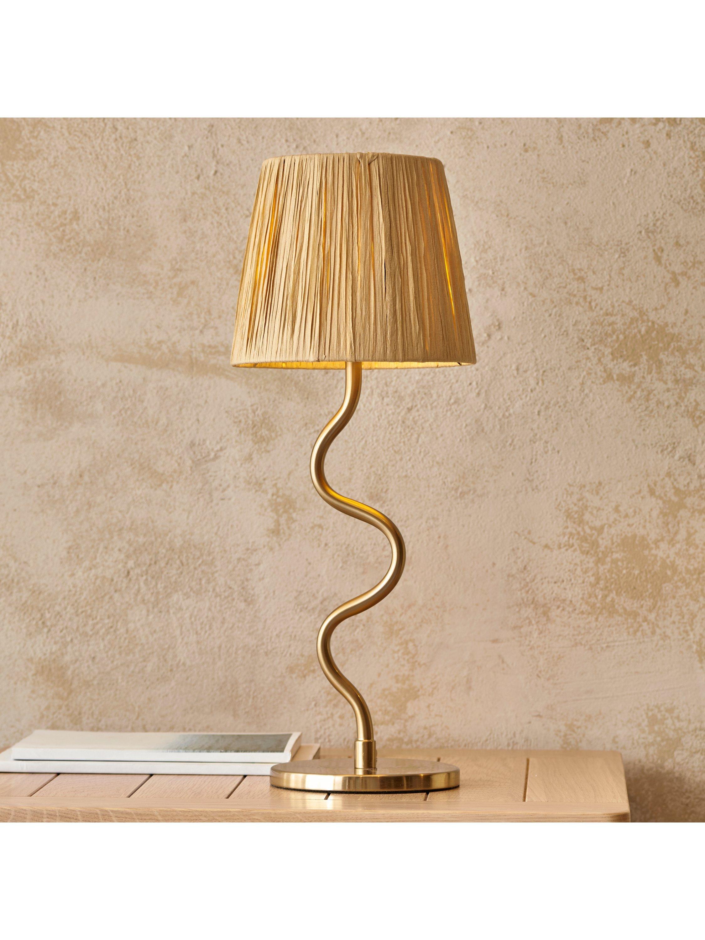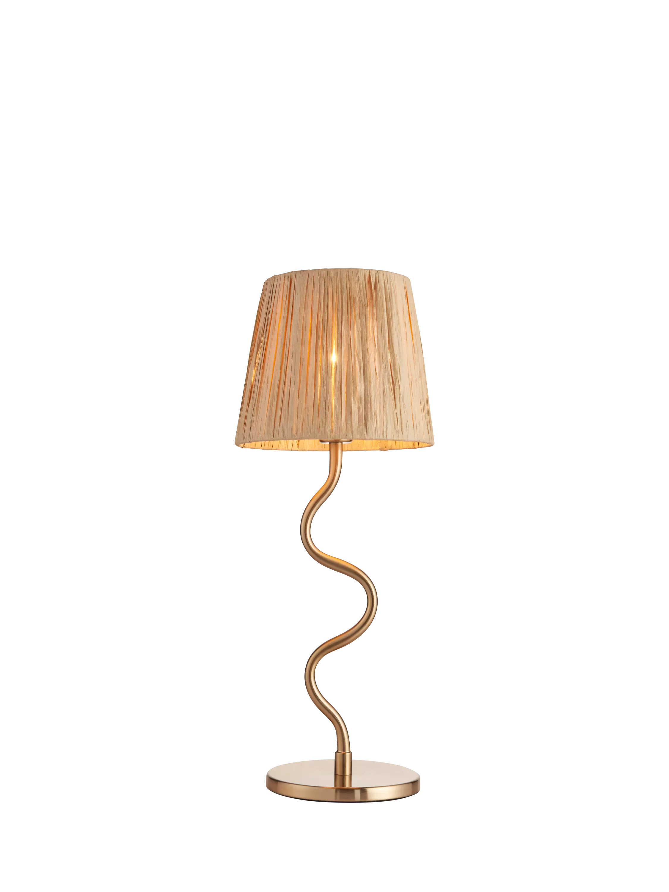 A modern take on country luxe design, this table light has a playful and unique wriggle-shape stand with metalwork finished in brushed, aged brass. It features a wrapped raffia shade that perfectly diffuses the light. Great for placing on a bedside table or in your lounge space.