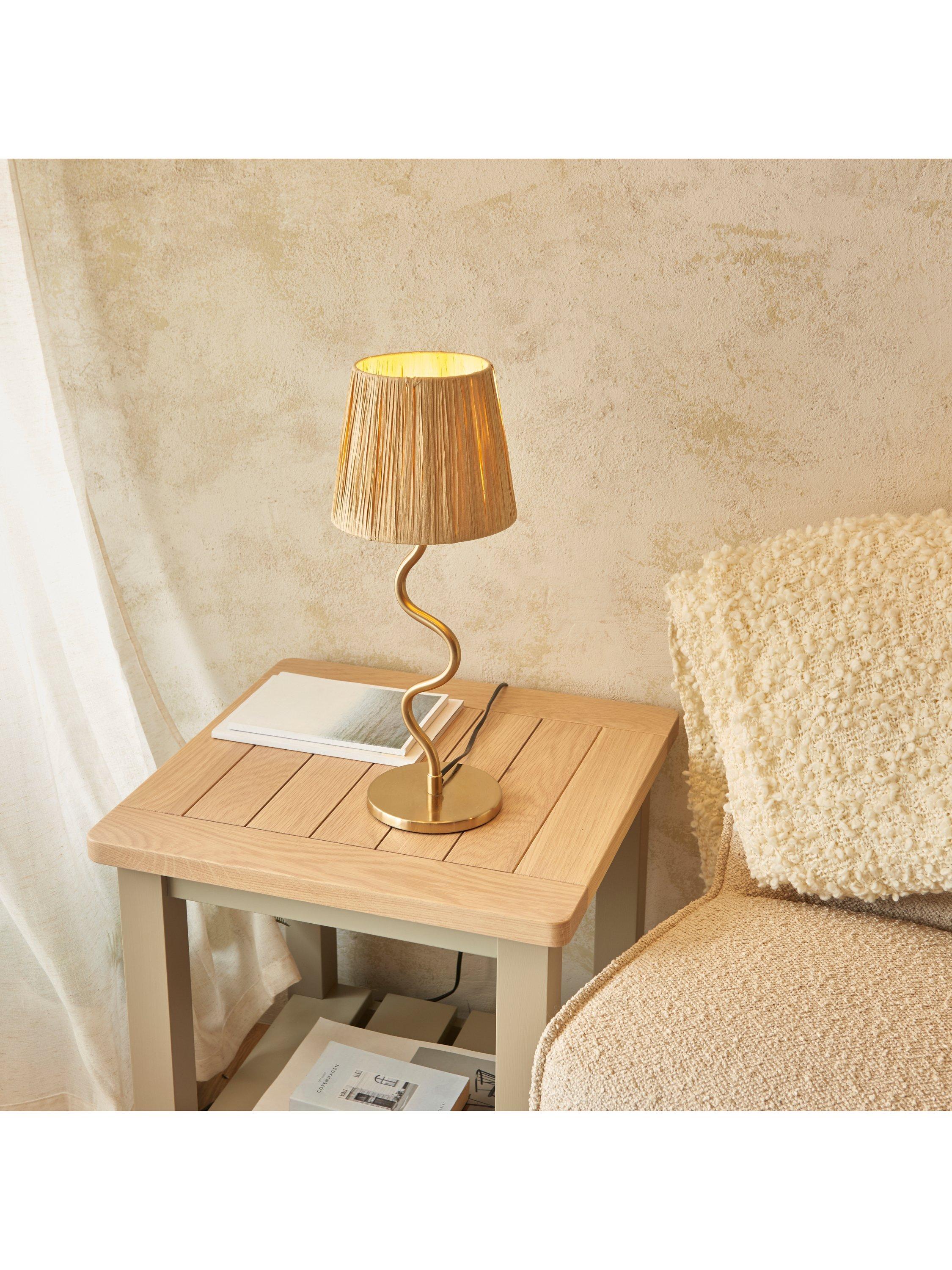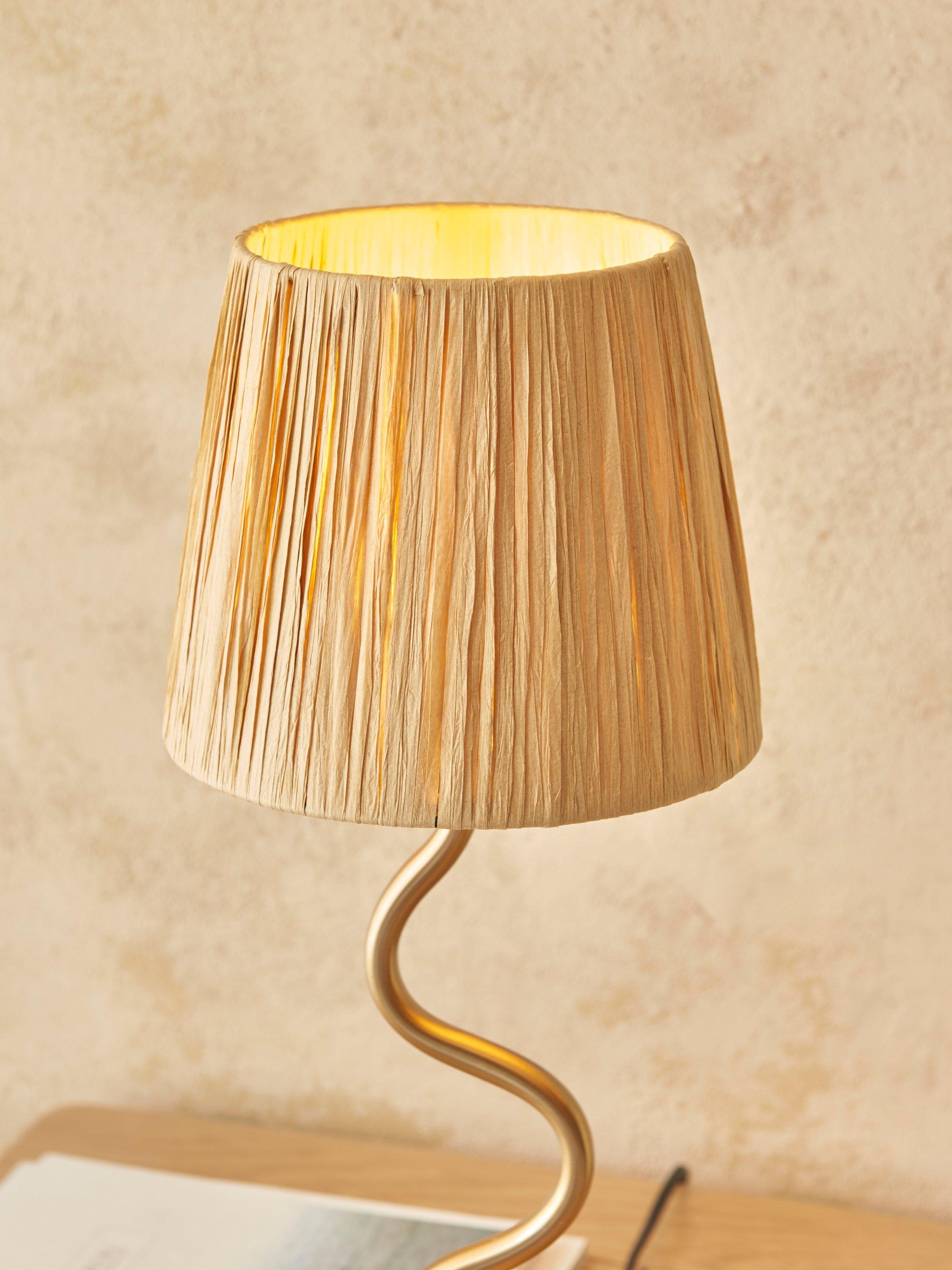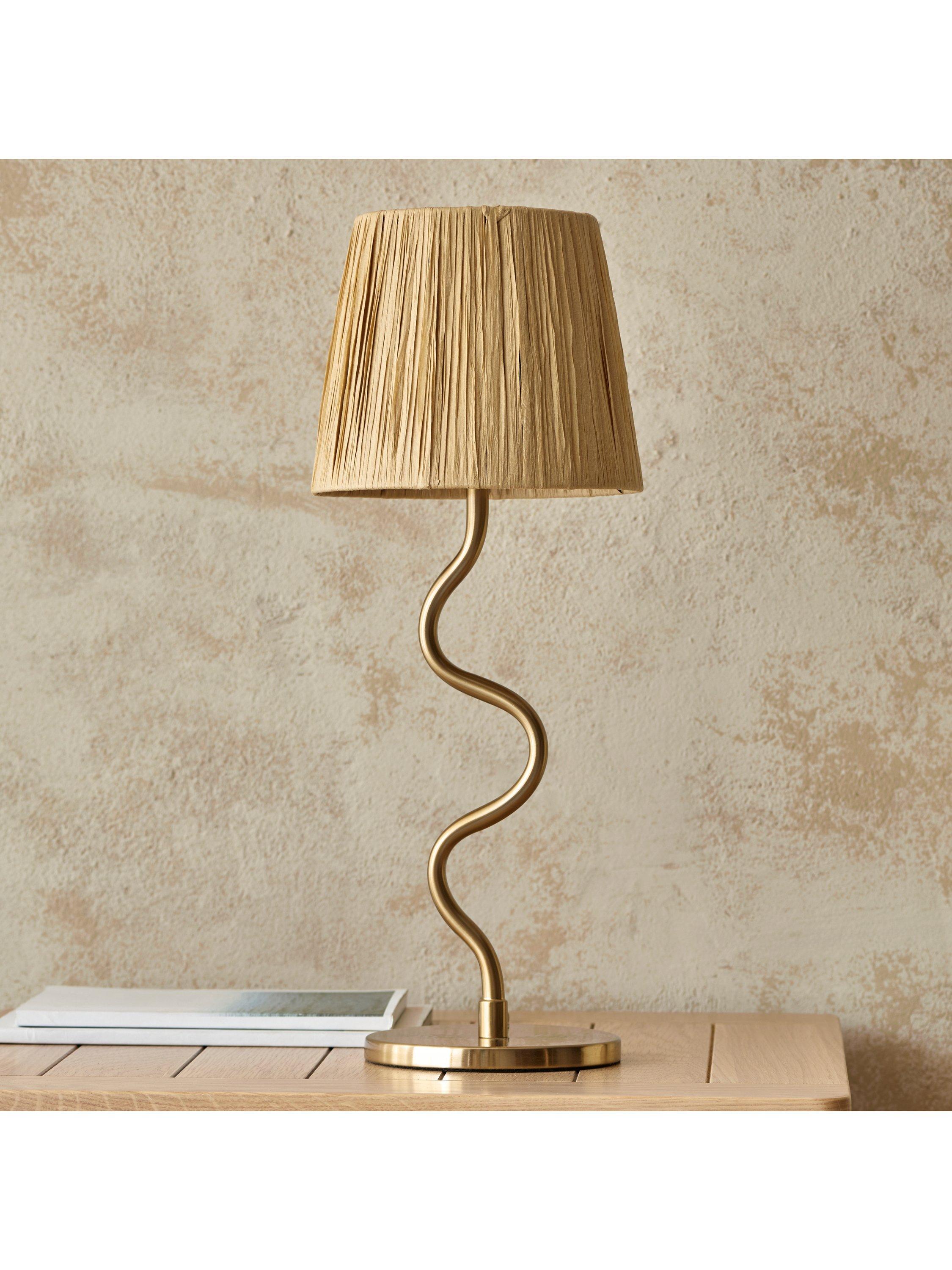 A modern take on country luxe design, this table light has a playful and unique wriggle-shape stand with metalwork finished in brushed, aged brass. It features a wrapped raffia shade that perfectly diffuses the light. Great for placing on a bedside table or in your lounge space.