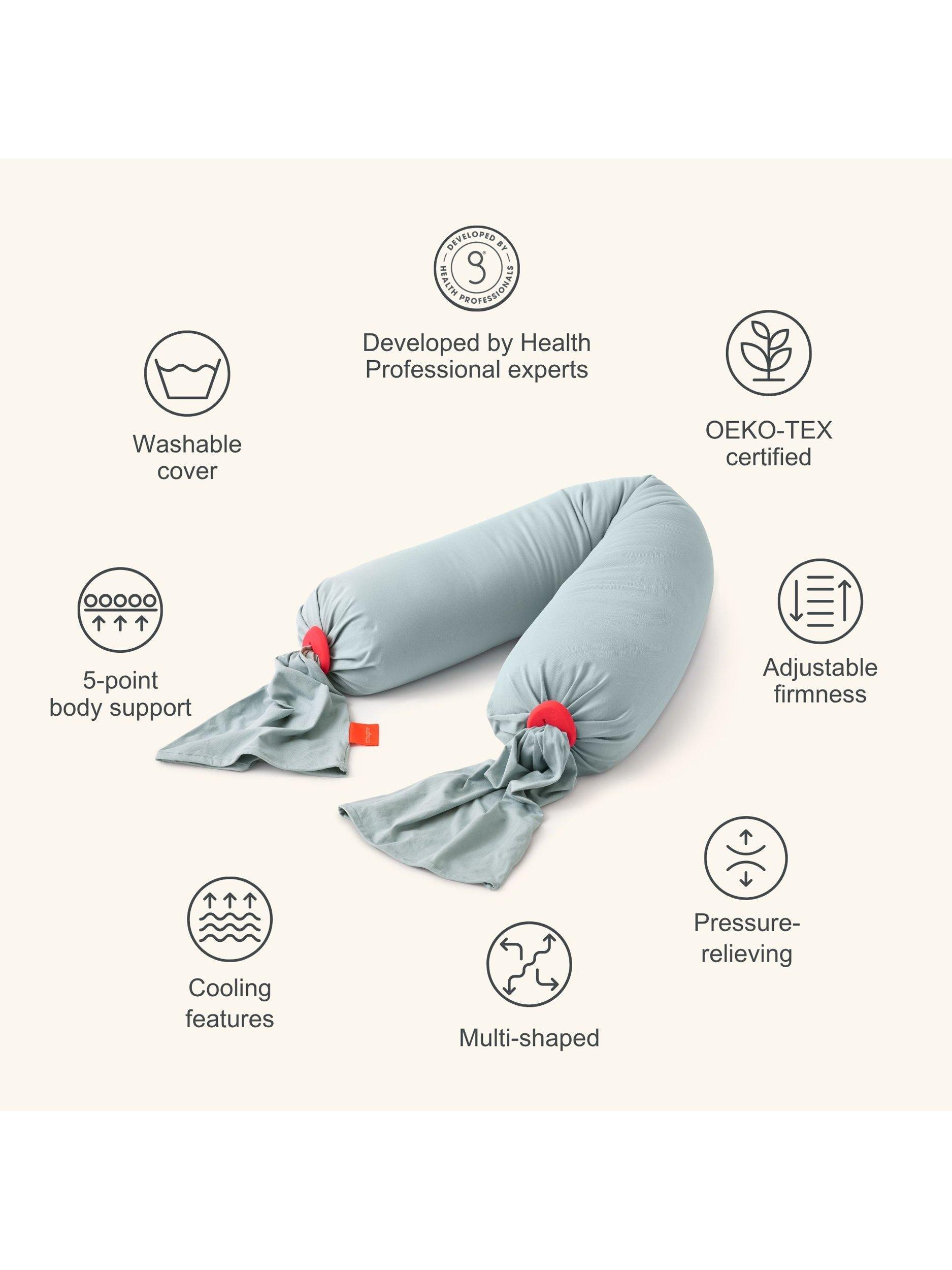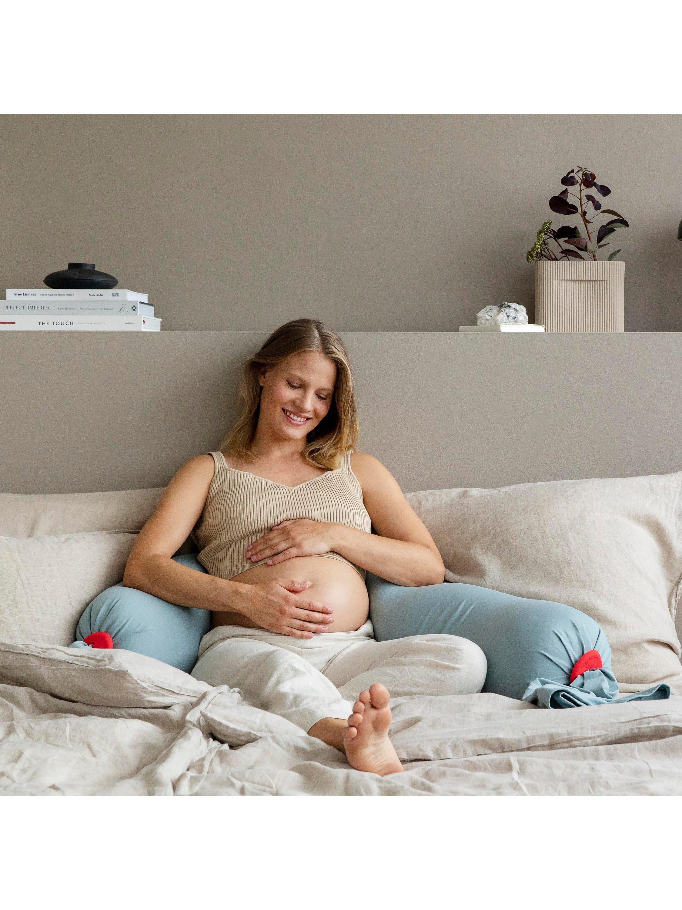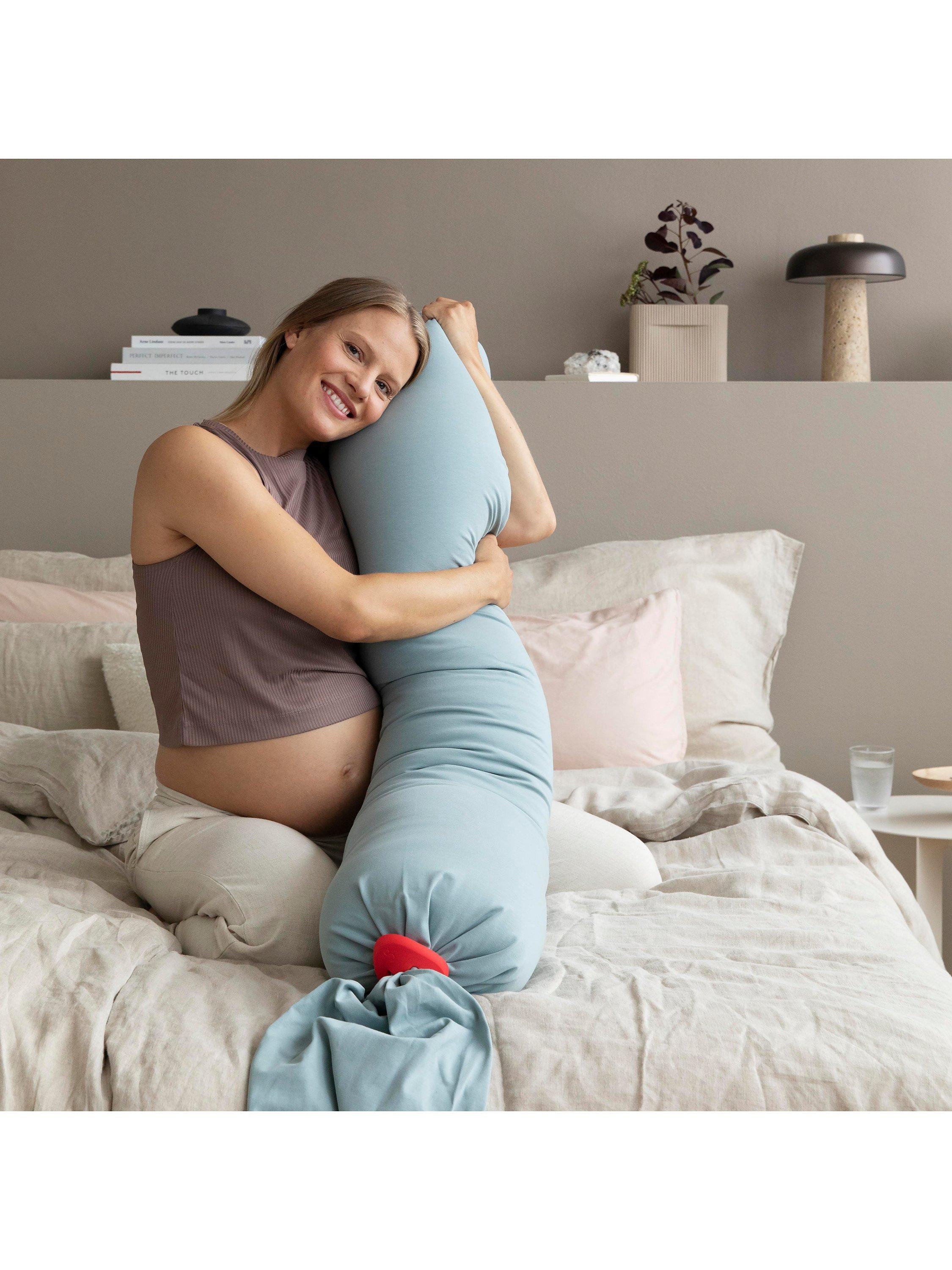 The kit is made up of a bbhugme® inner pillow, two pebbles to secure and adjust each end, and a cover. This enables you to easily adjust the firmness of the pillow. The pillow moulds to your body, ensuring maximum comfort for you and support for your growing bump.
