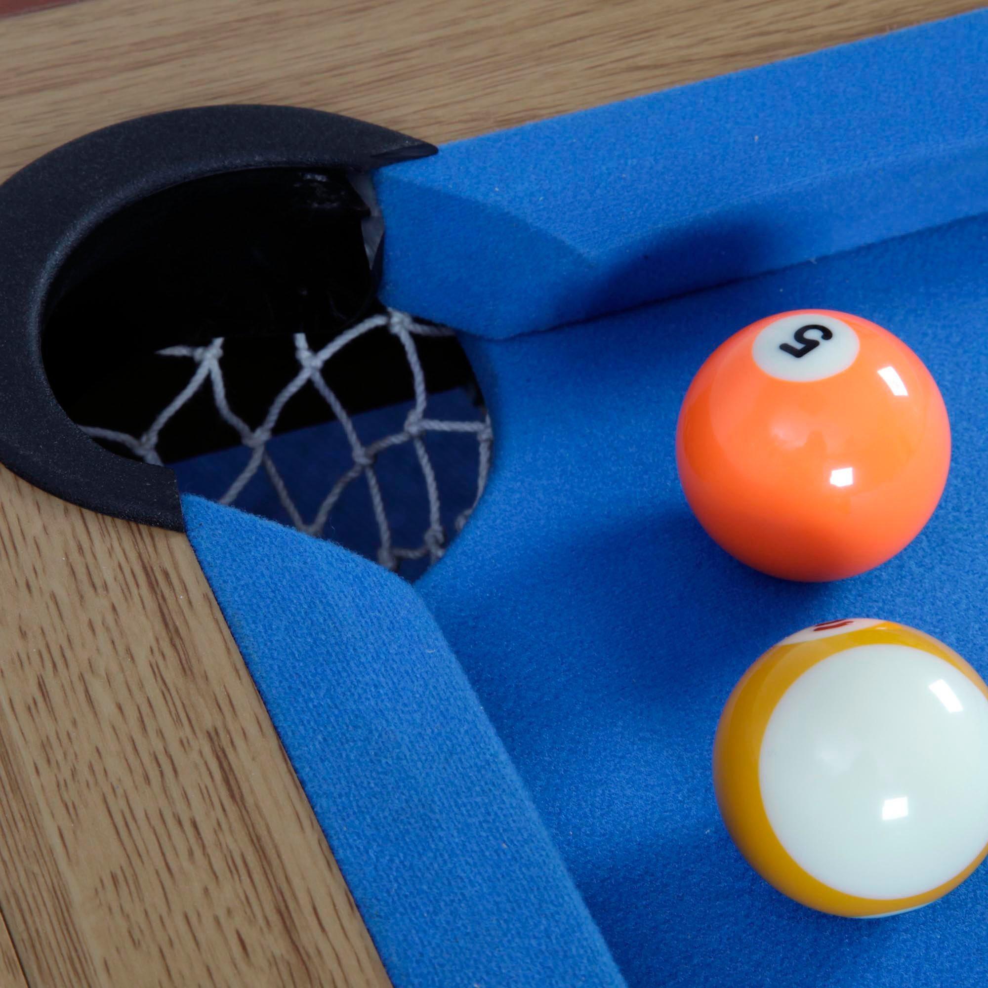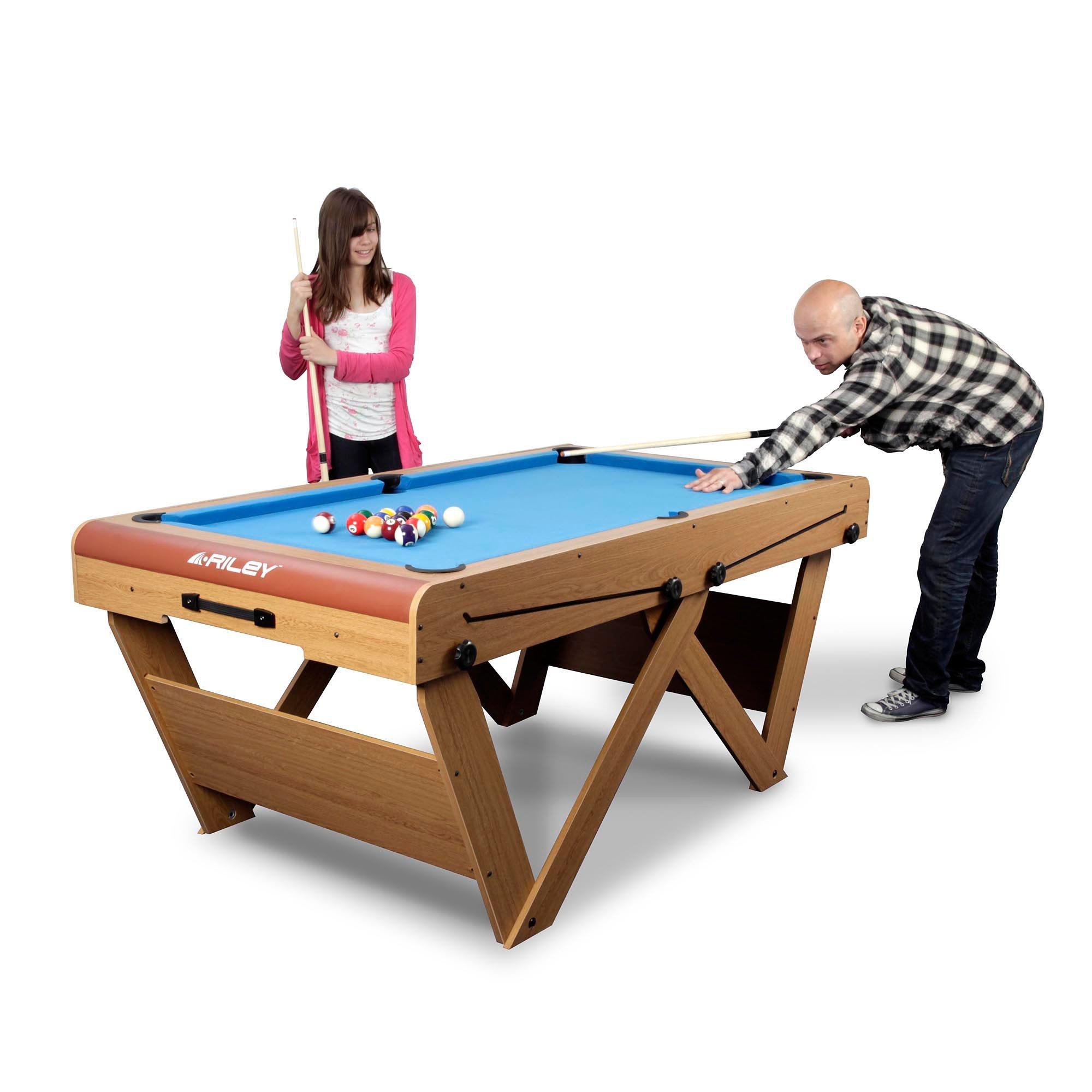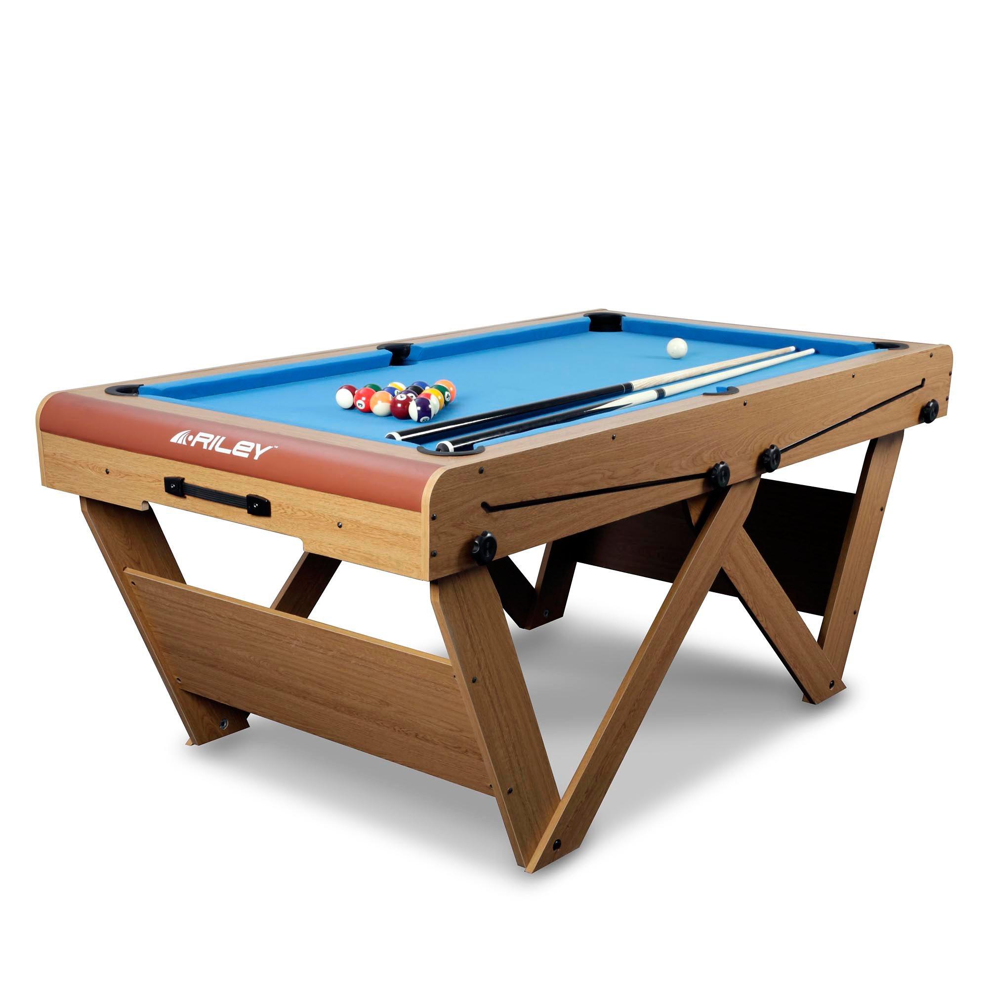 - Solid wood cues, table brush, and chalk included