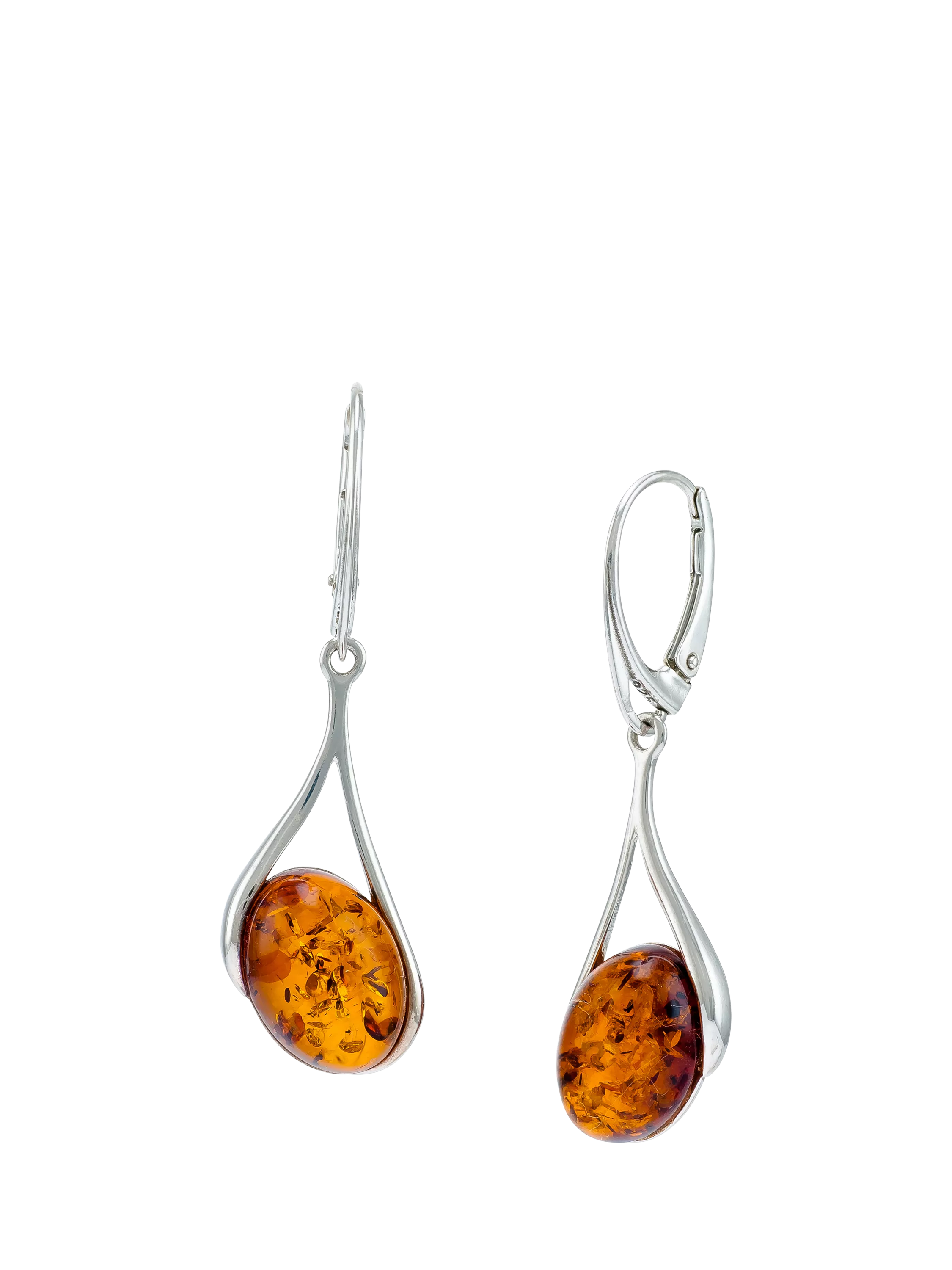 Featuring a beautiful natural oval-shaped amber stone suspended in a sterling silver frame with cut out detailing, this pair is fitted with leverback fastenings that are suitable for pierced ears only.