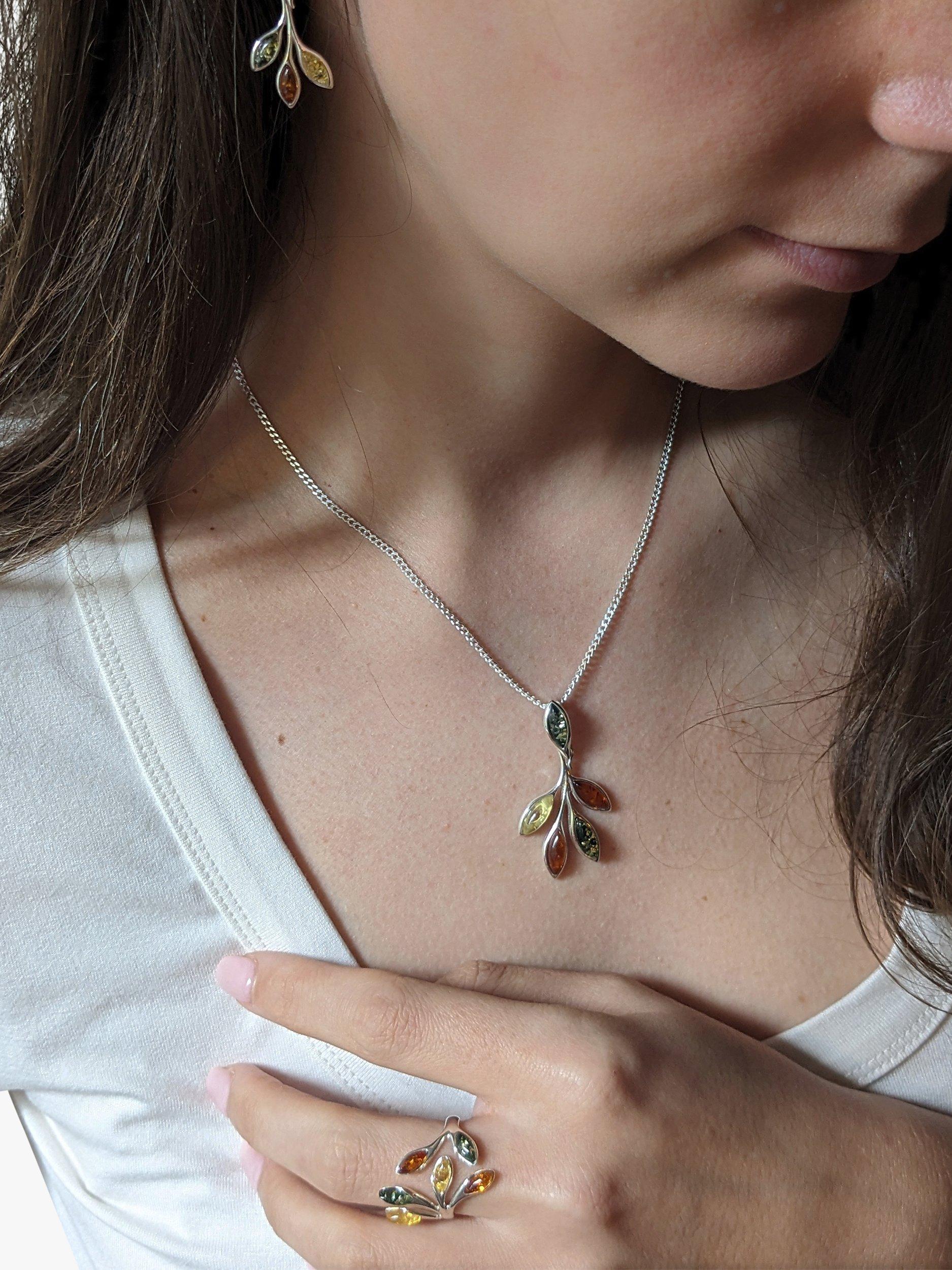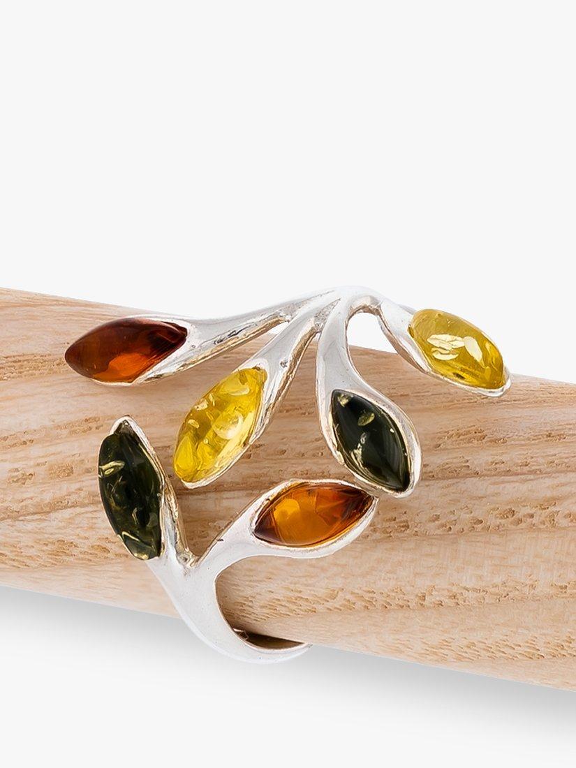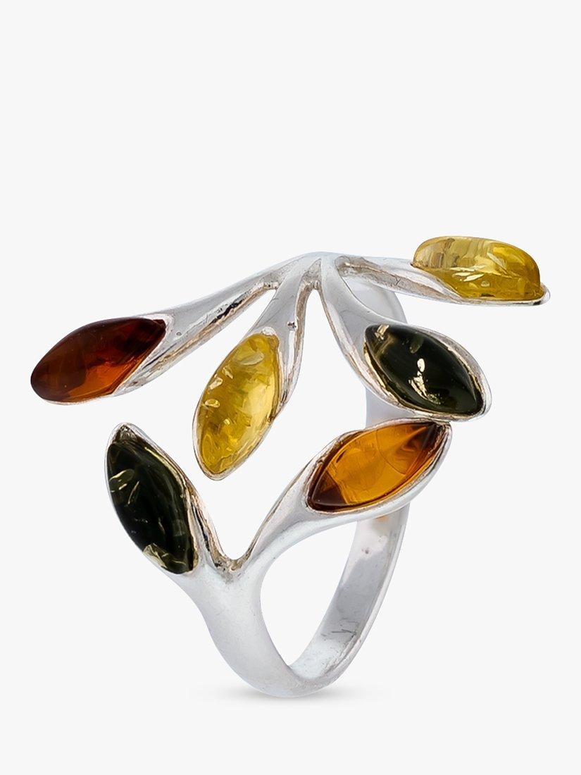Inspired by nature this ring has a leaf shaped design that showcases a variety of colours of Baltic amber. An elegant ring from Be-Jewelled's leaves and flowers collection.