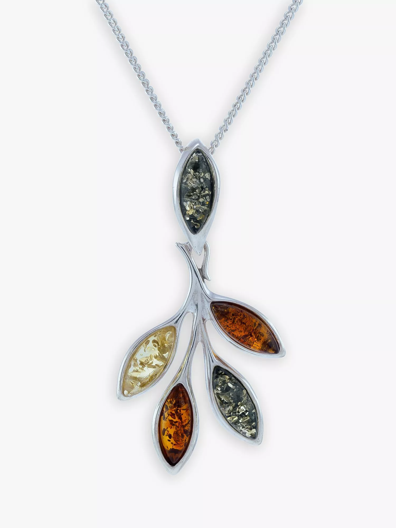 This Be-Jewelled pendant necklace features five multi-colour, marquise-cut Baltic Amber stones set in sterling silver leaf inspired drop pendant. With a fine adjustable chain, it is perfect for everyday wear.
