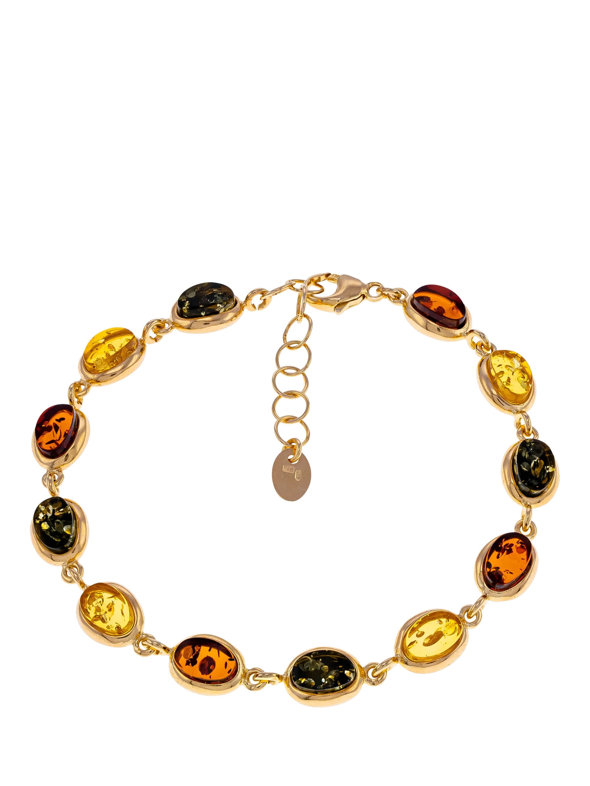 A celebration of the beauty of nature, this bracelet from Be-Jewelled features Lemon, Green and Cognac geometric cut oval amber with 12 stones set in gold plated silver. The bracelet fastens with an extension chain to ensure the perfect fit.