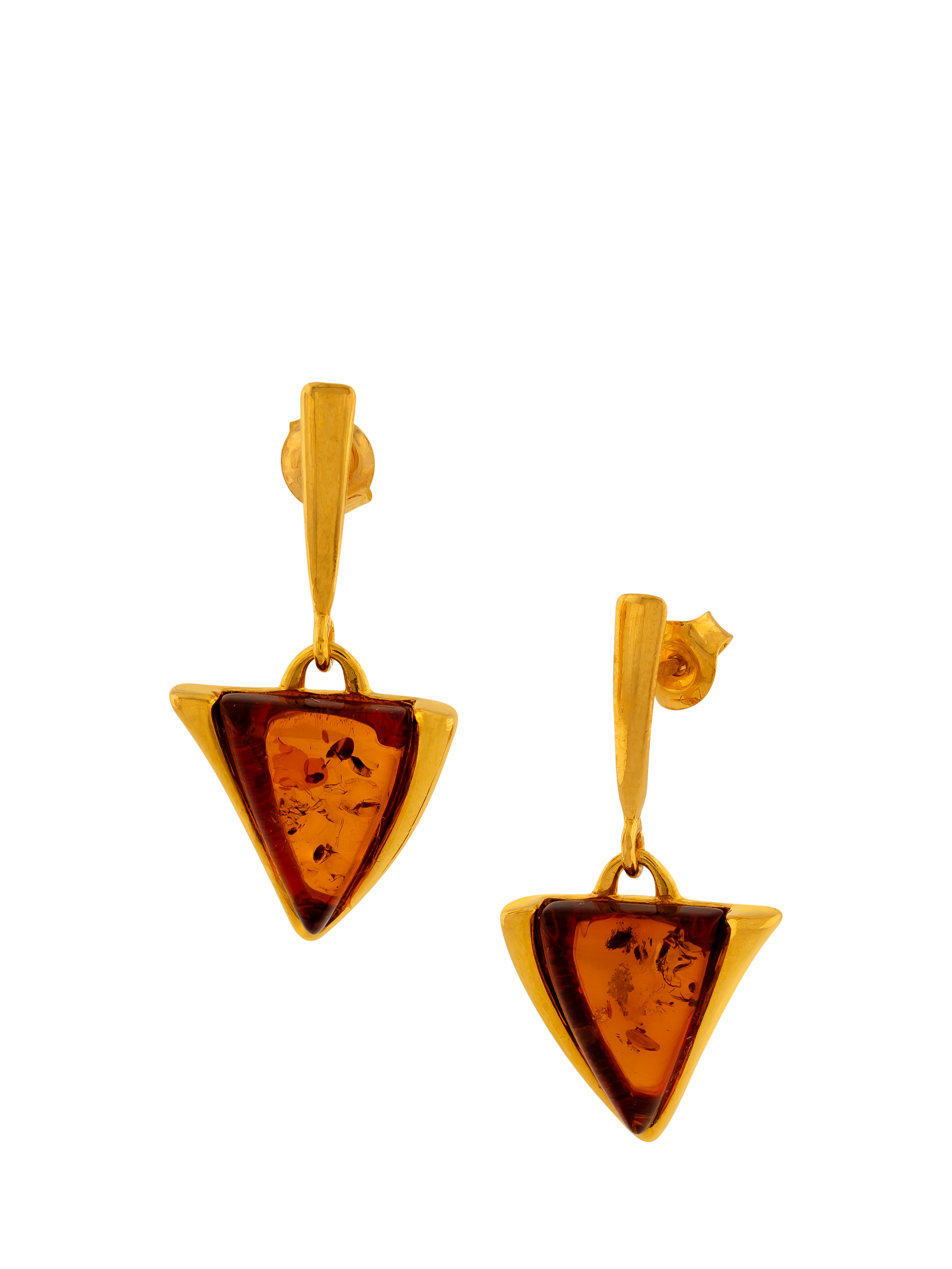Be-Jewelled's Baltic Amber triangle shape earrings are set in gold plated sterling silver and are perfect for everyday wear. Add the matching pendant and chain to complete the look.