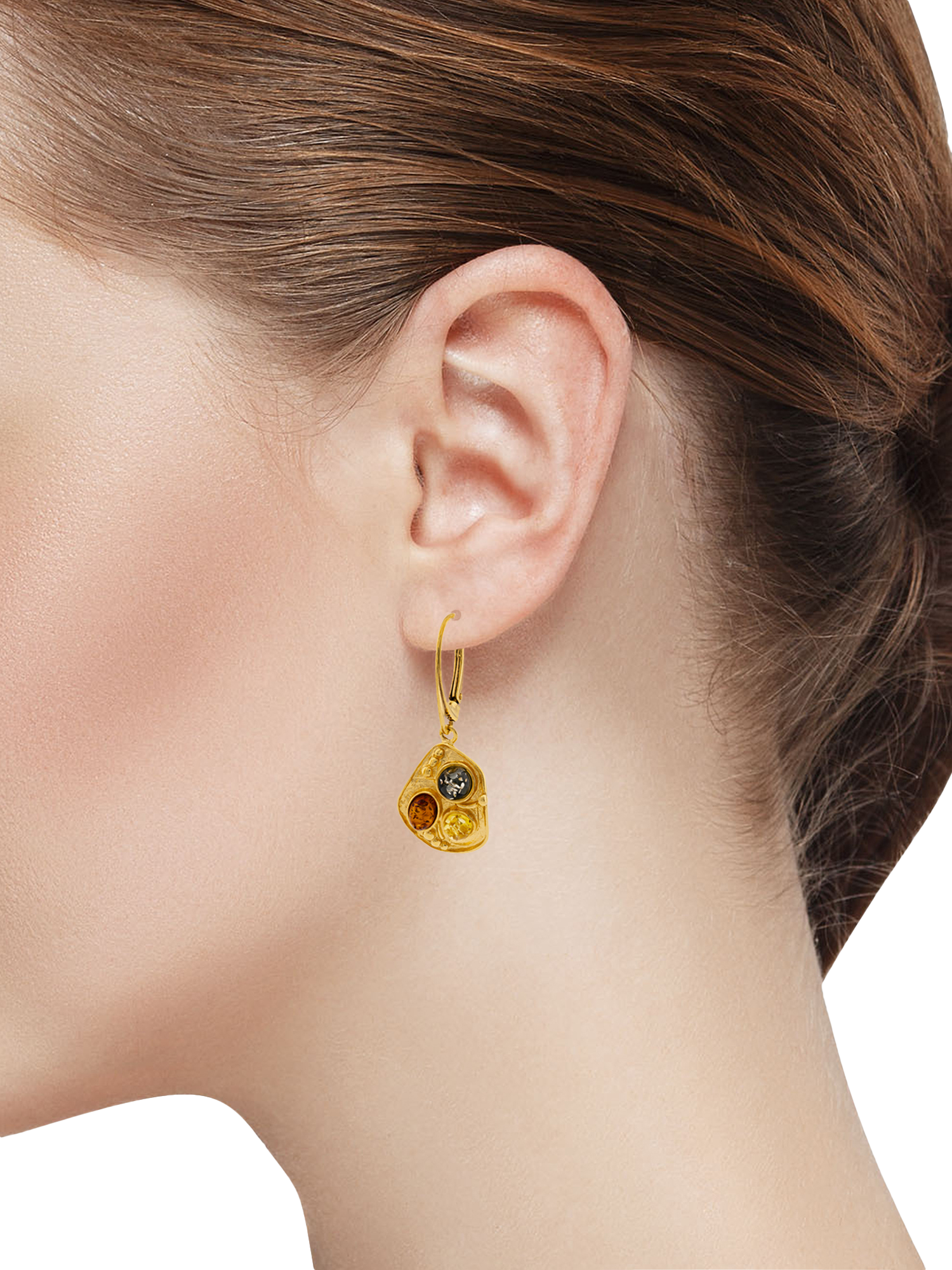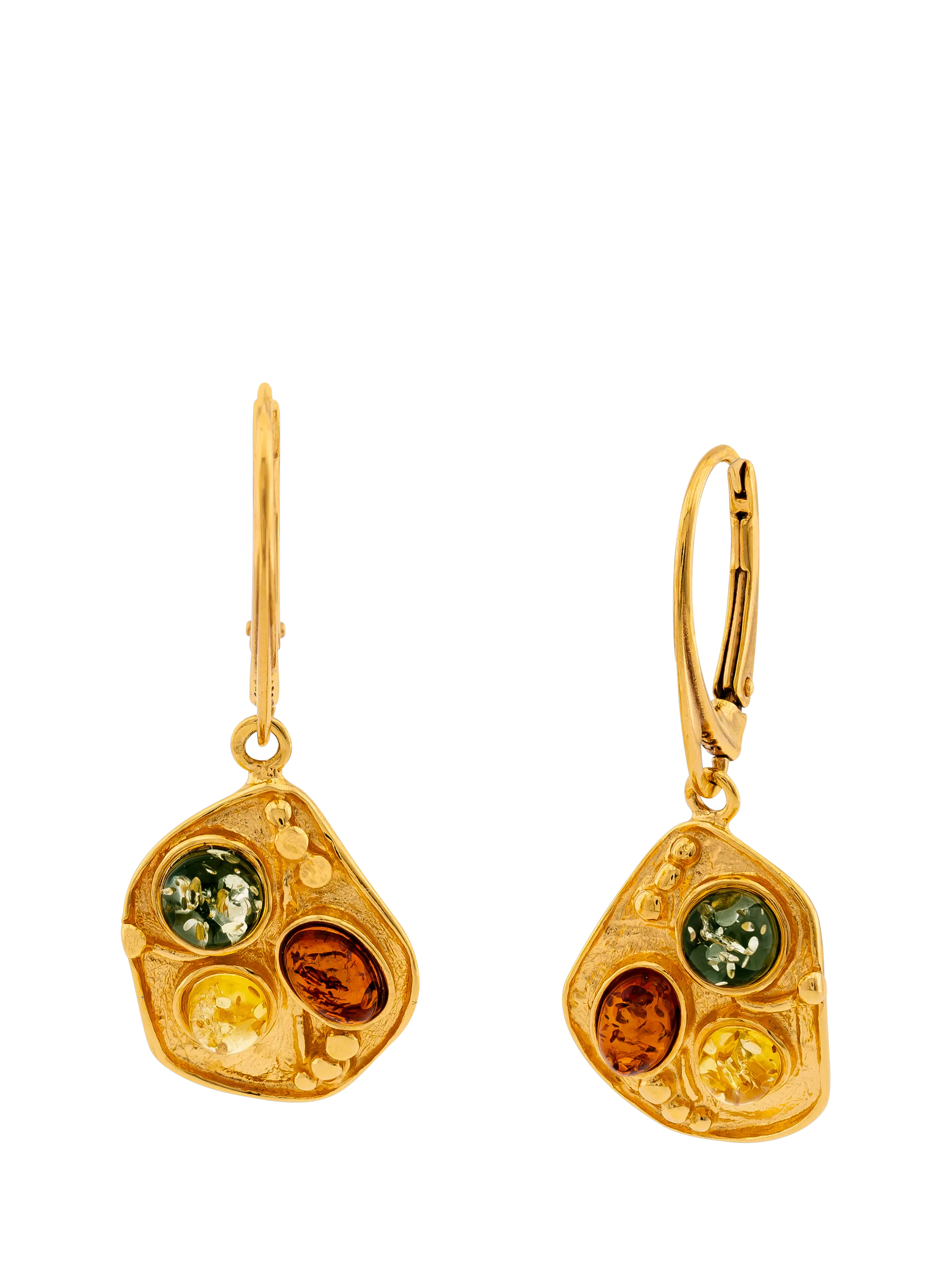 Designed by Be-Jewelled, these earrings come in a simple but elegant drop with cognac, lemon and green amber set in molten gold plated sterling silver. With a fish hook fastening, they are suitable for pierced ears only.