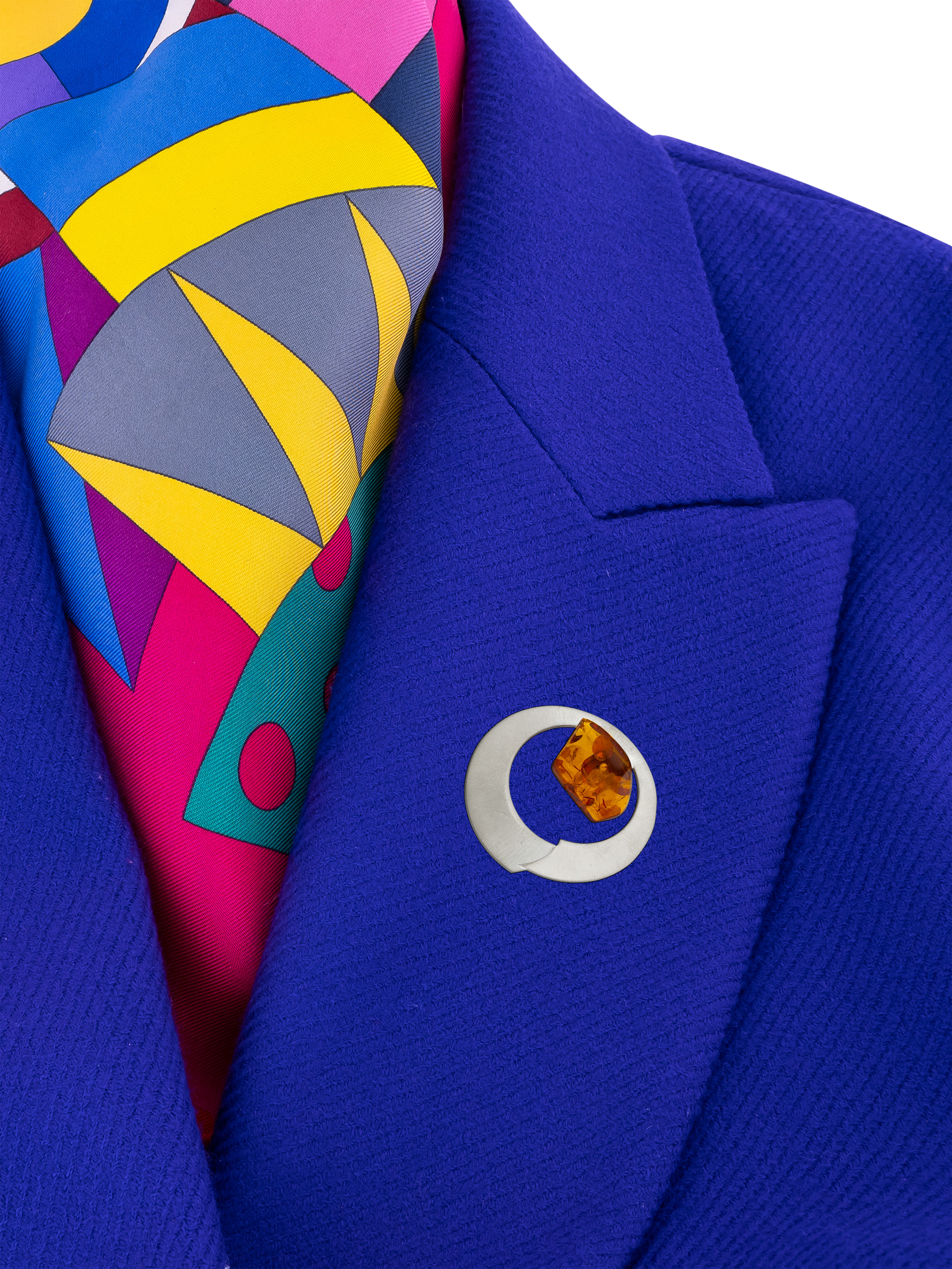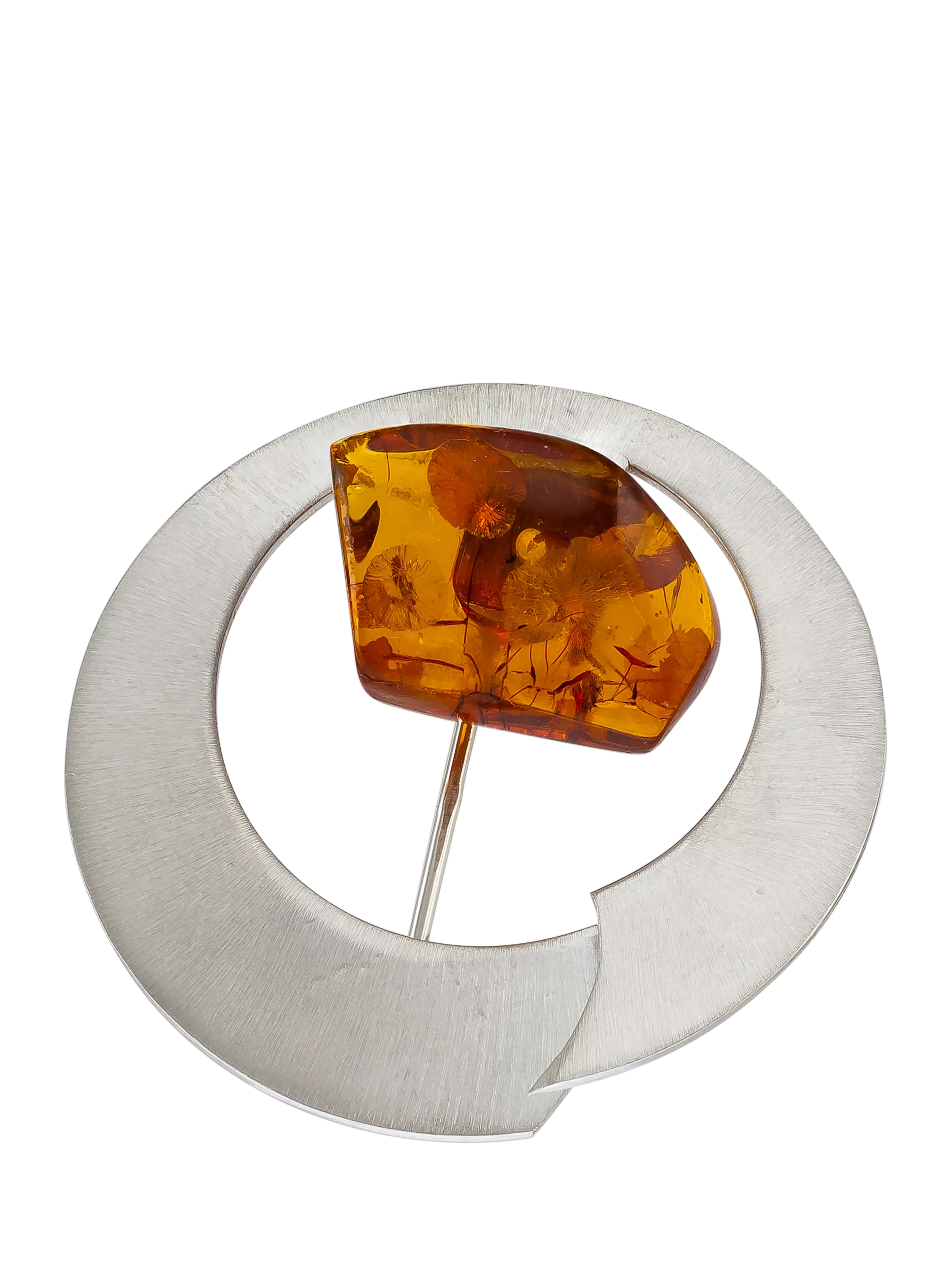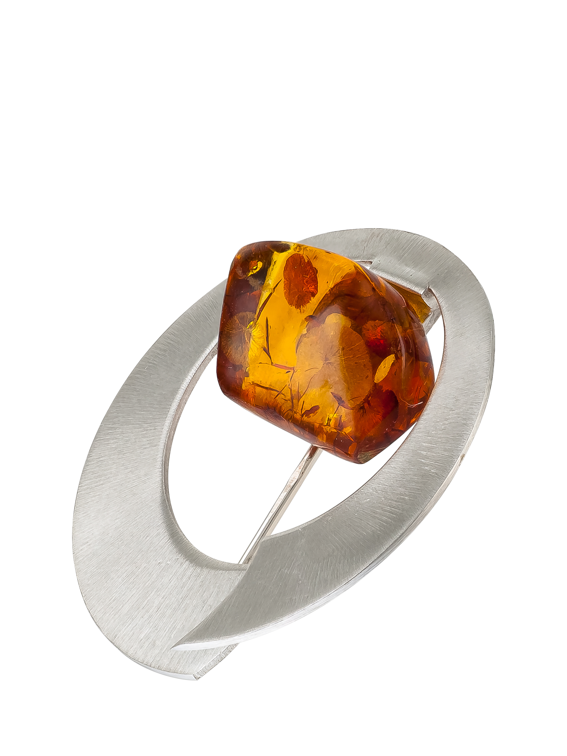 The sleek brushed finish of the design contrast beautifully with the smooth naturally-cut amber stone. The brooch fastens with a safety pin clasp.