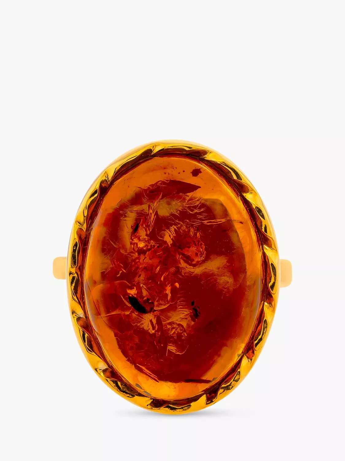 From their Limited Edition range, Be-Jewelled's Baltic Amber ring features an oval Amber cabochon set in a gold-plated silver mount with a scalloped edge.