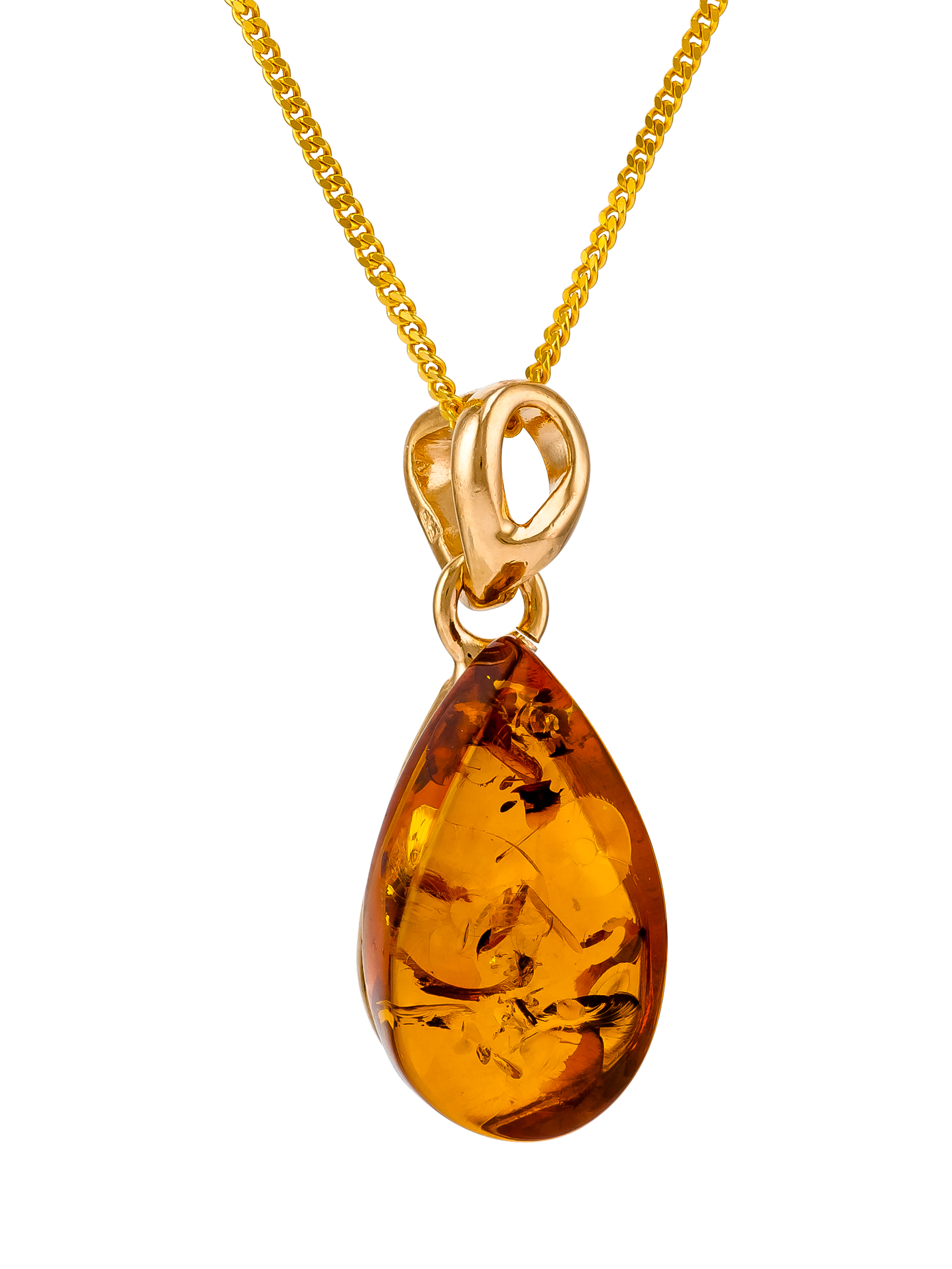 With a smooth pear-shaped amber stone, the necklace offers a delicate curb chain. A pear-shaped setting holds the stone in place.