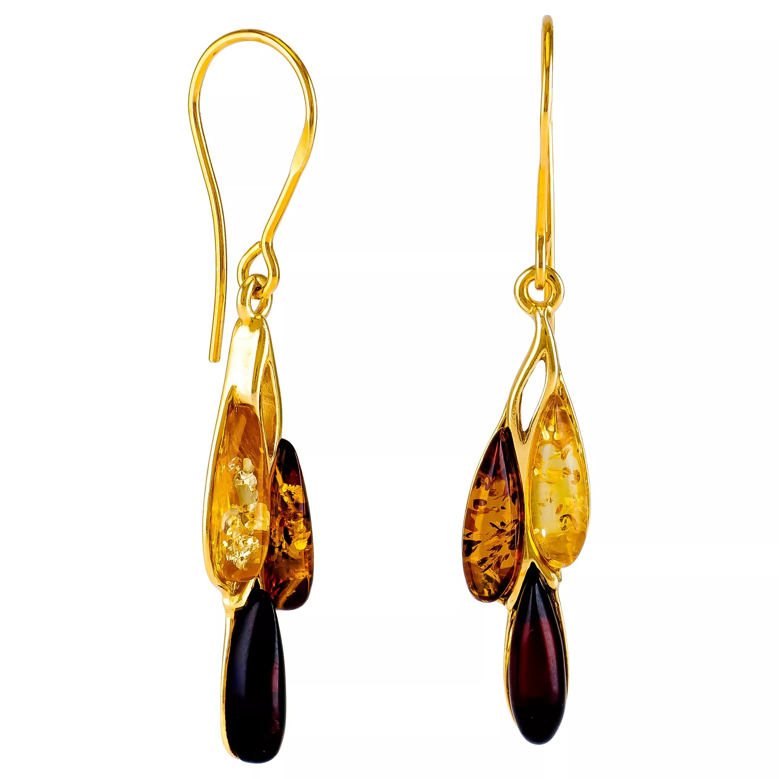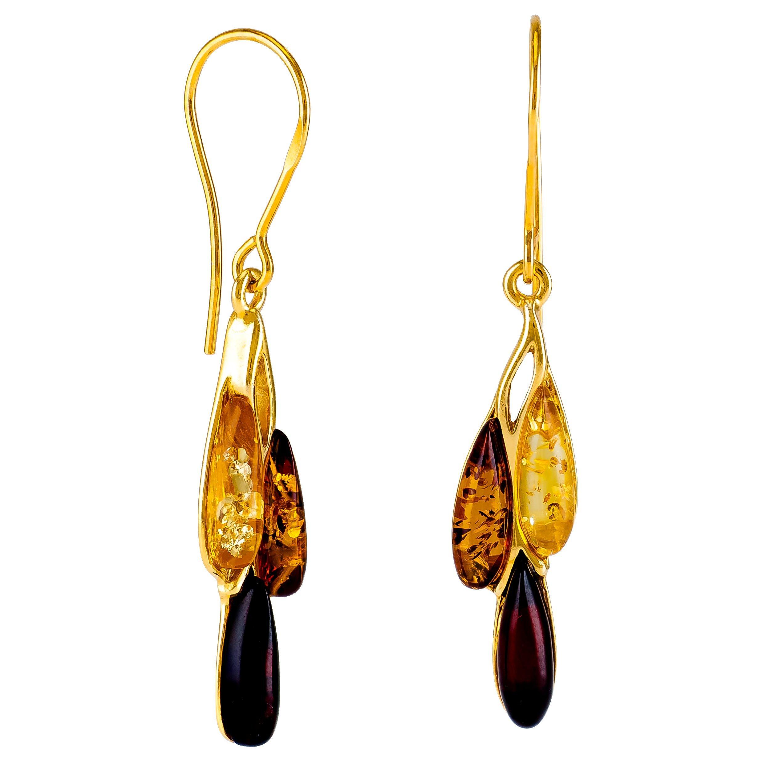 Crafted from sterling silver and finished with gold plating, the earrings suspend three teardrop-shaped amber stones in rich and earthy cognac, lemon and cherry hues. The earrings come with secure hook fittings that are for pierced ears only.